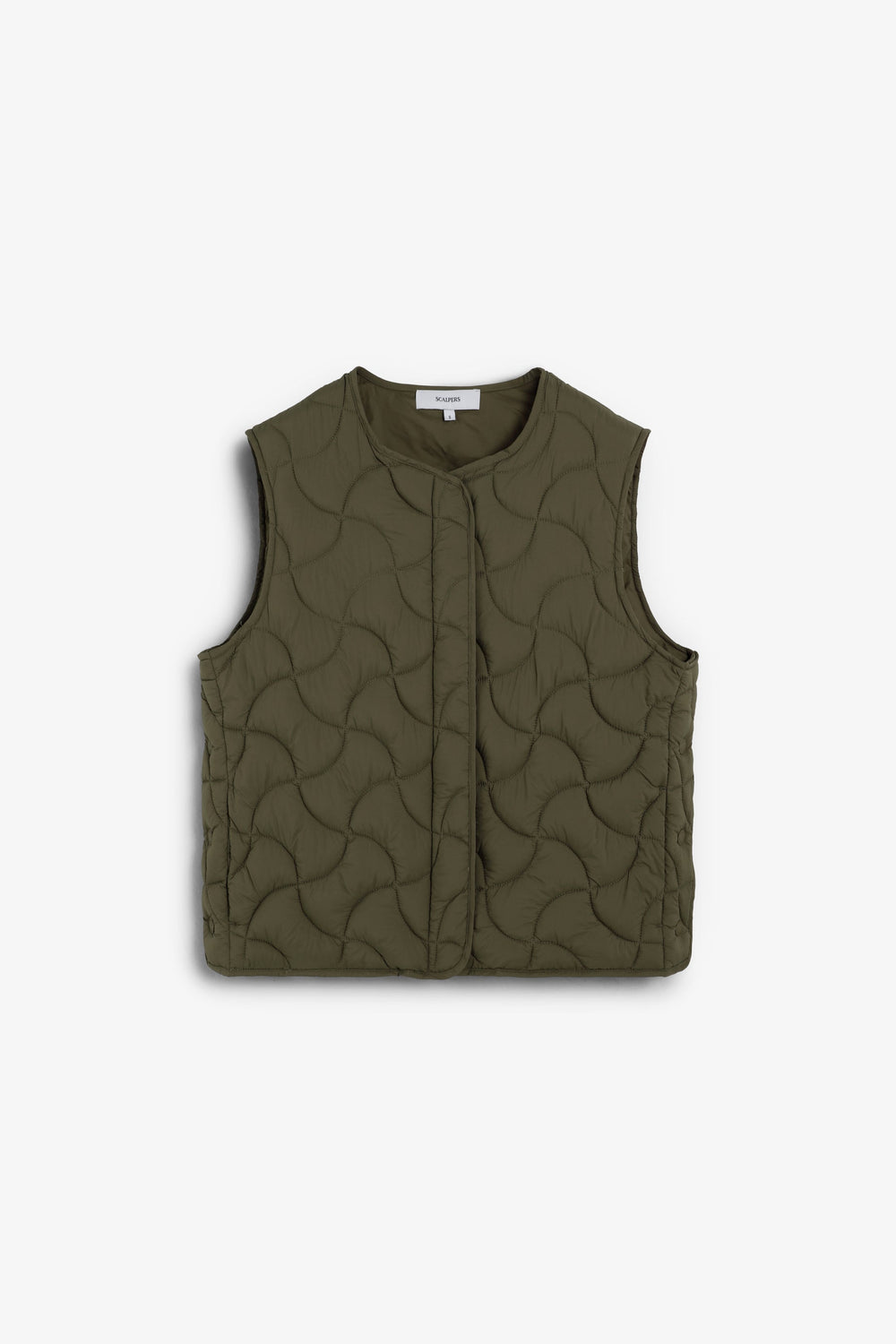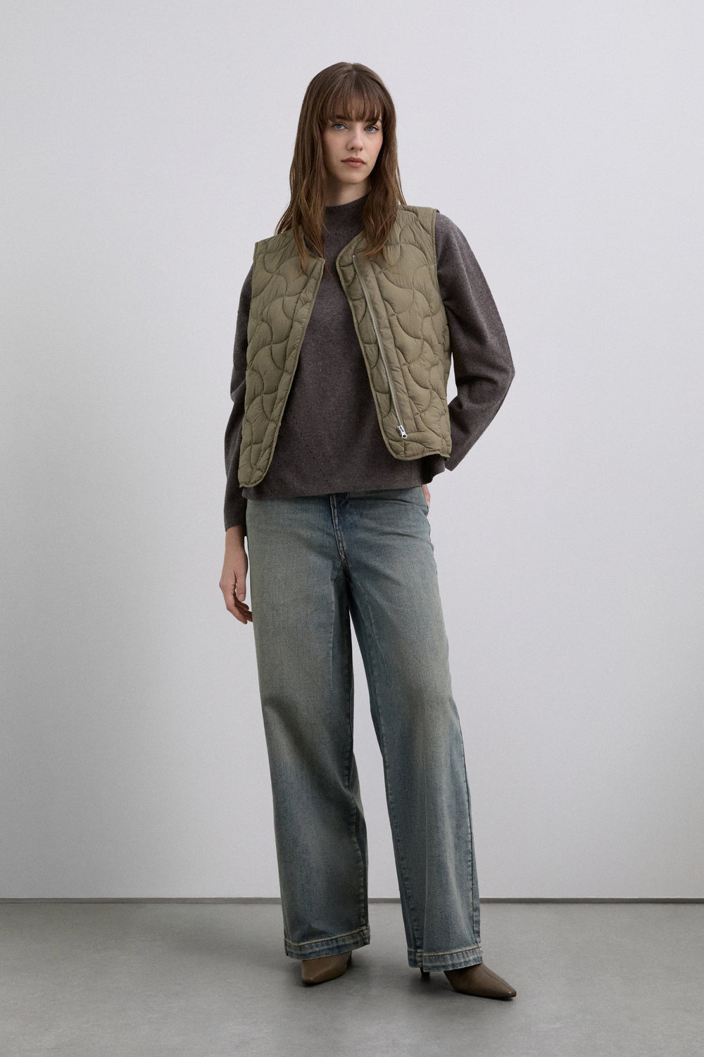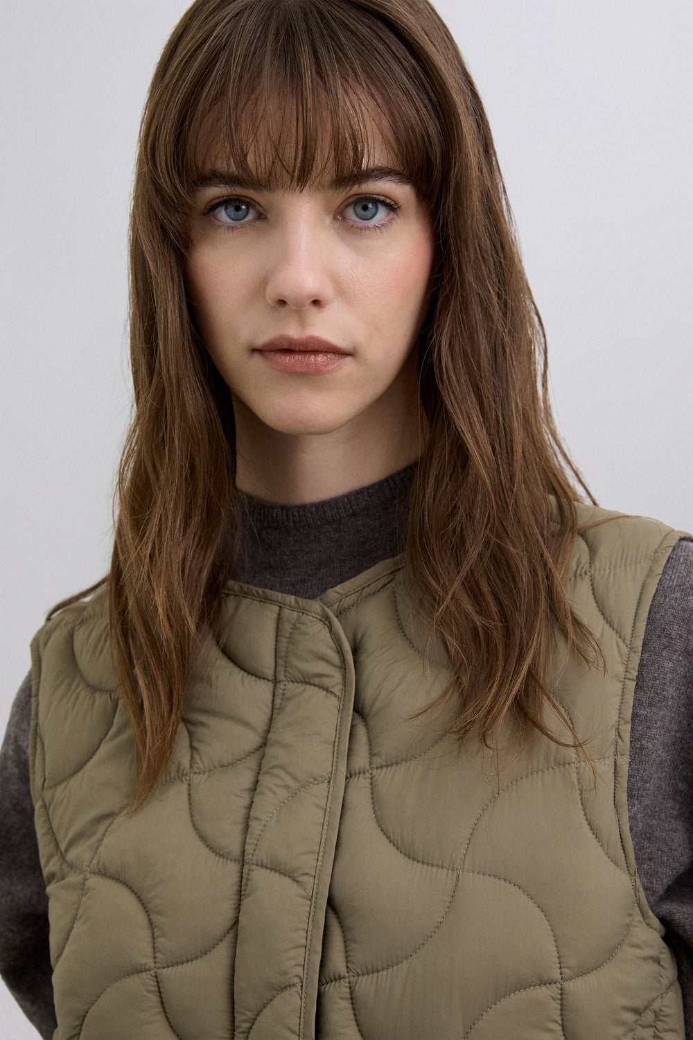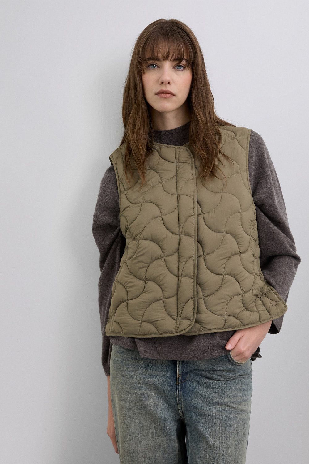 Quilted gilet with magnetic fastening on placket. Regular Fit. Round neck. Side opening with snaps, side seam pockets.