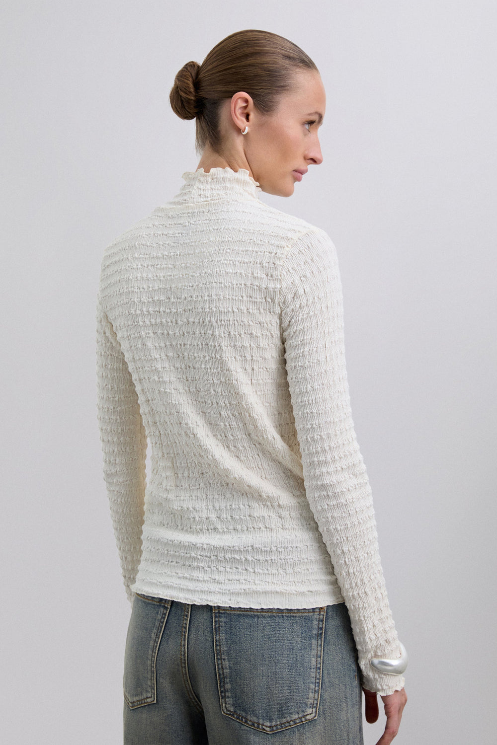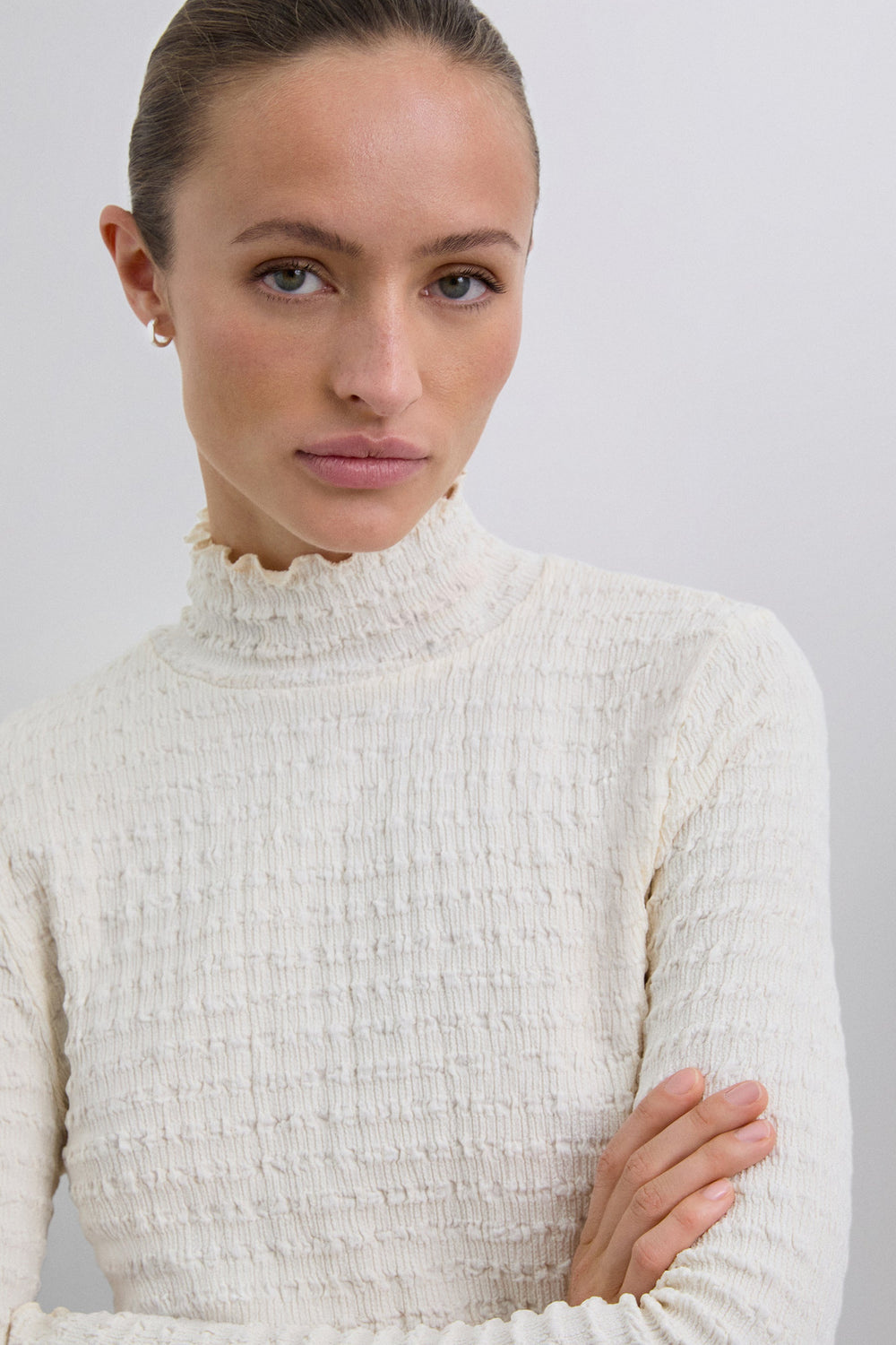 High neck top with long sleeves. Lightweight fabric with gathered texture.
