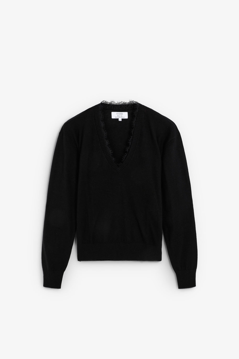 Sweater made of a wool and viscose blend. Regular fit. V-neck with lace details. Long sleeves with ribbed cuffs and hem.