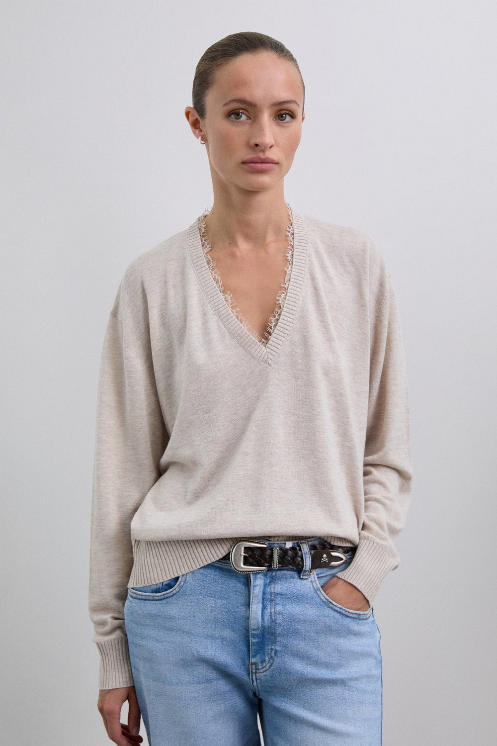 Sweater made of a wool and viscose blend. Regular fit. V-neck with lace details. Long sleeves with ribbed cuffs and hem.