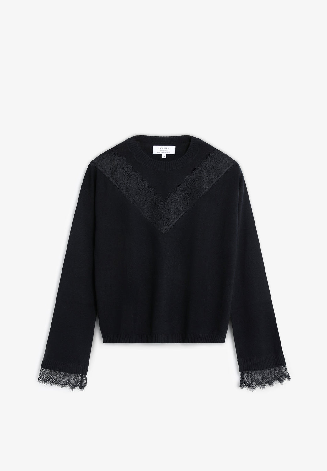Sweater made of a wool and viscose blend. Regular fit. Round neck and long sleeves with ribbed trim. Lace details on chest and cuffs.