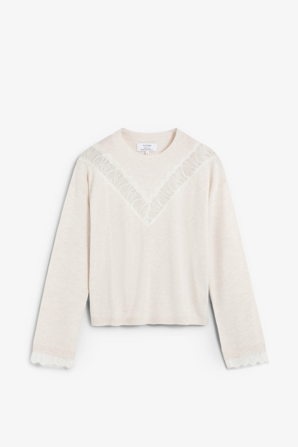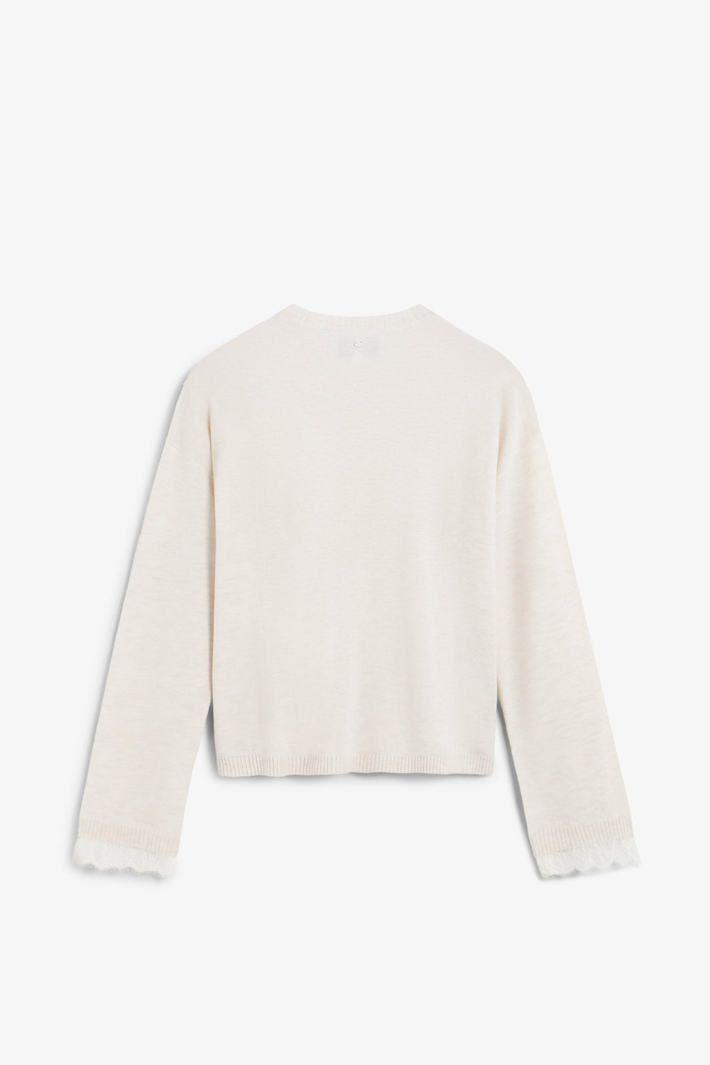 Sweater made of a wool and viscose blend. Regular fit. Round neck and long sleeves with ribbed trim. Lace details on chest and cuffs.