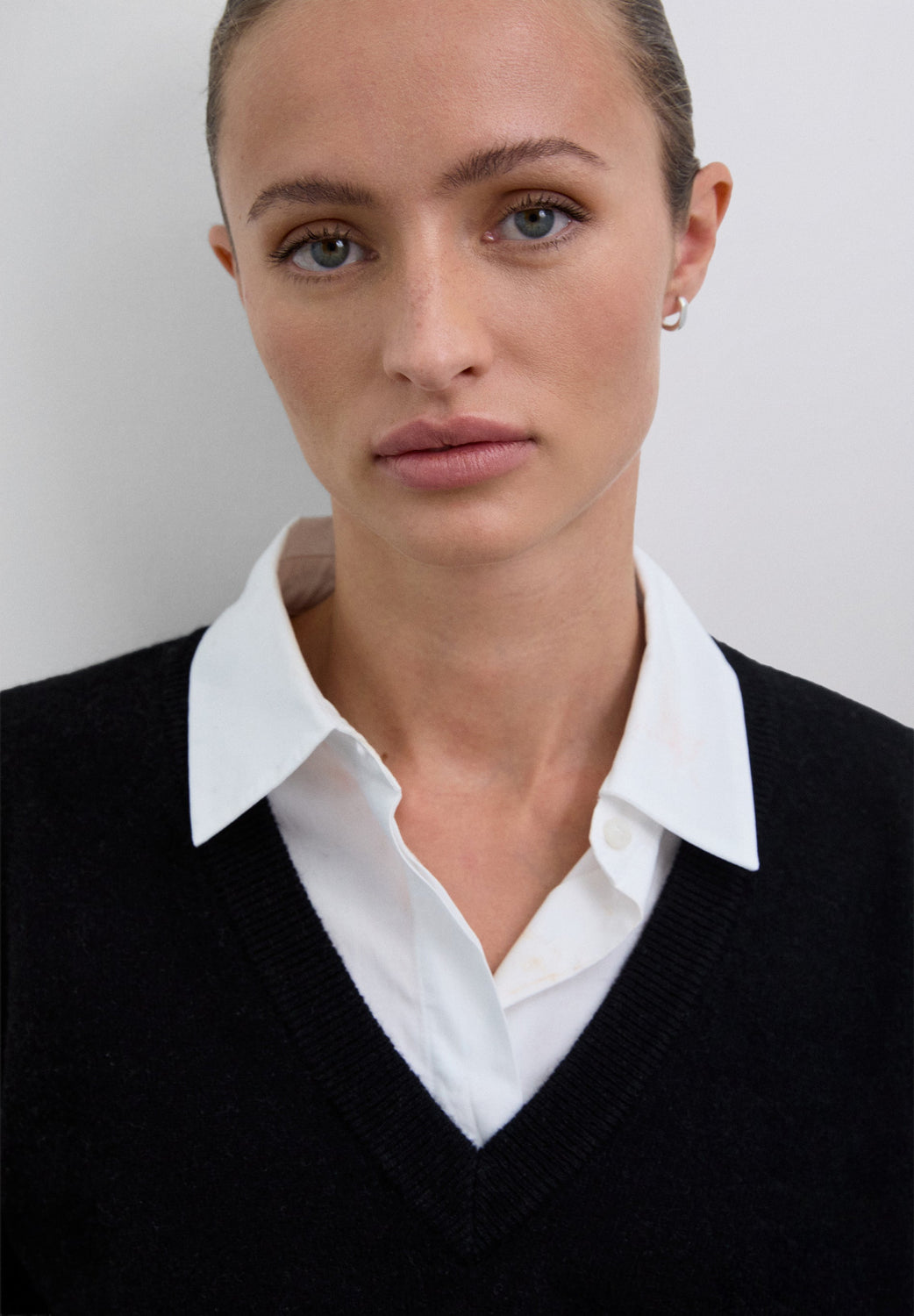 Sweater made of a wool blend with V-neck. Regular fit. Long, slightly puffed sleeves with ribbed cuffs. Matching embroidered skull detail on the back.