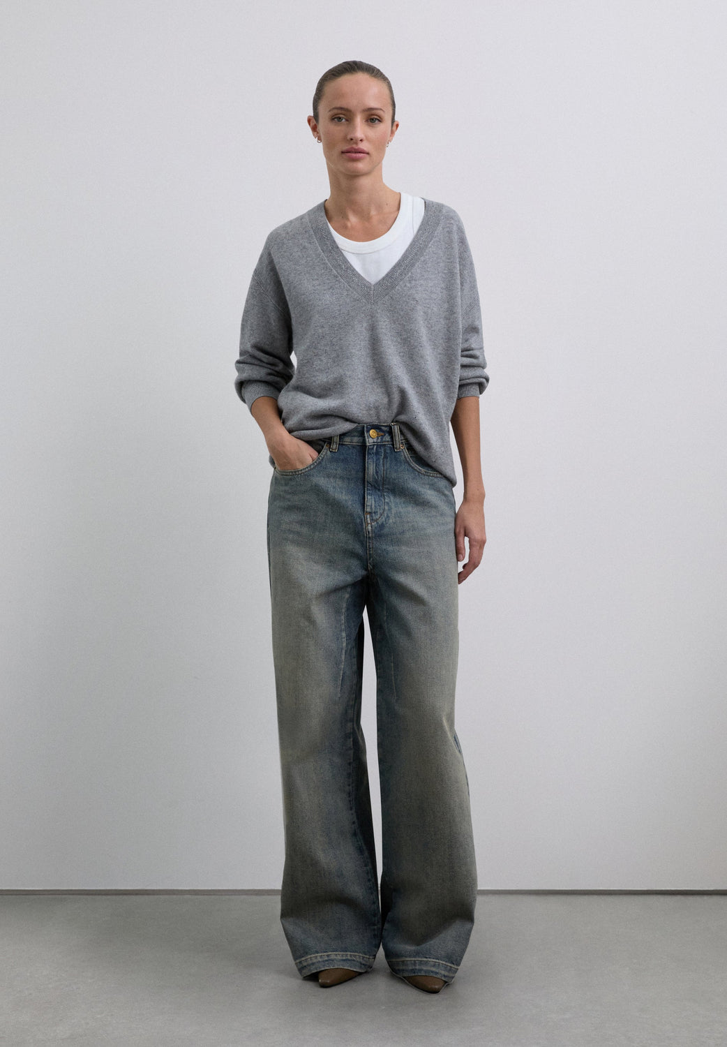 Sweater made of wool. V-neckline with a slightly loose fit. Mini hole details near the top hem. Ribbed finish on collar, cuffs and belt. Metal logo plate detail on back.