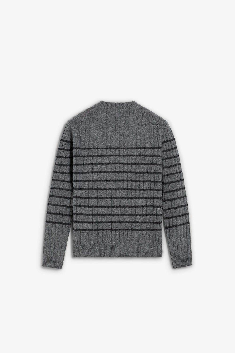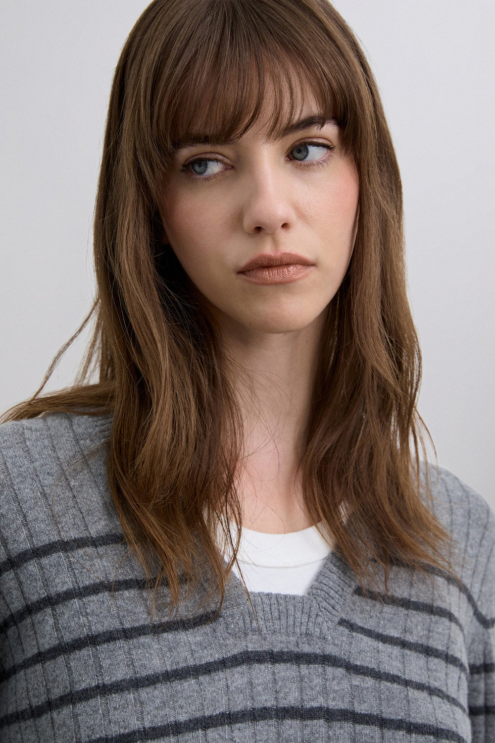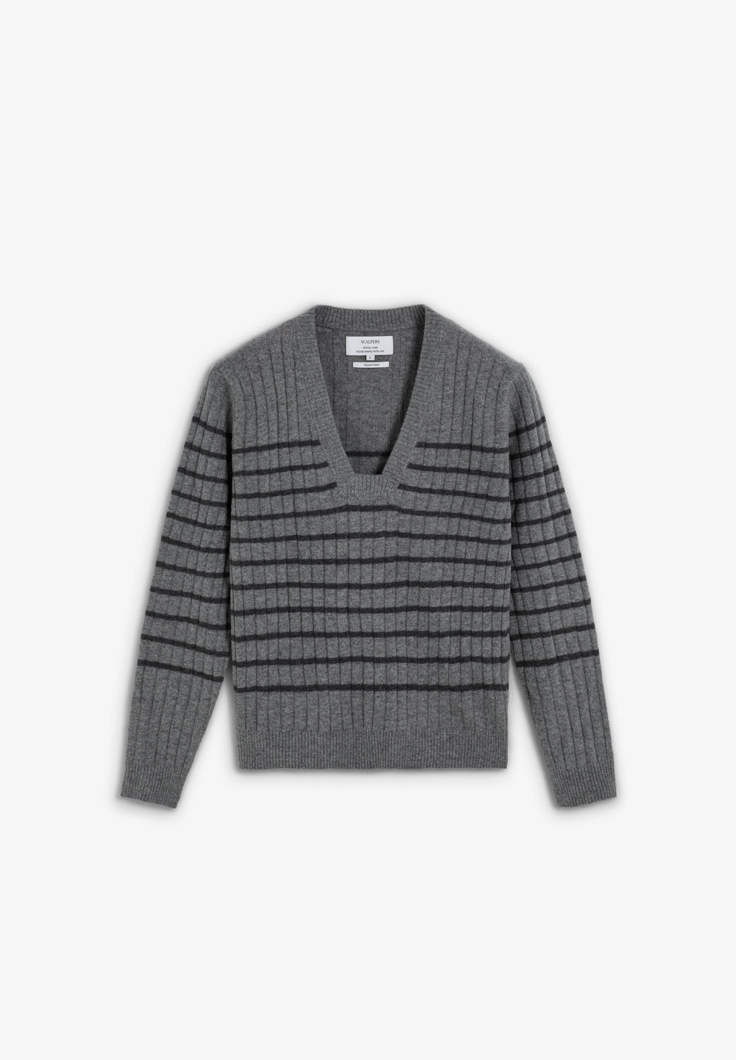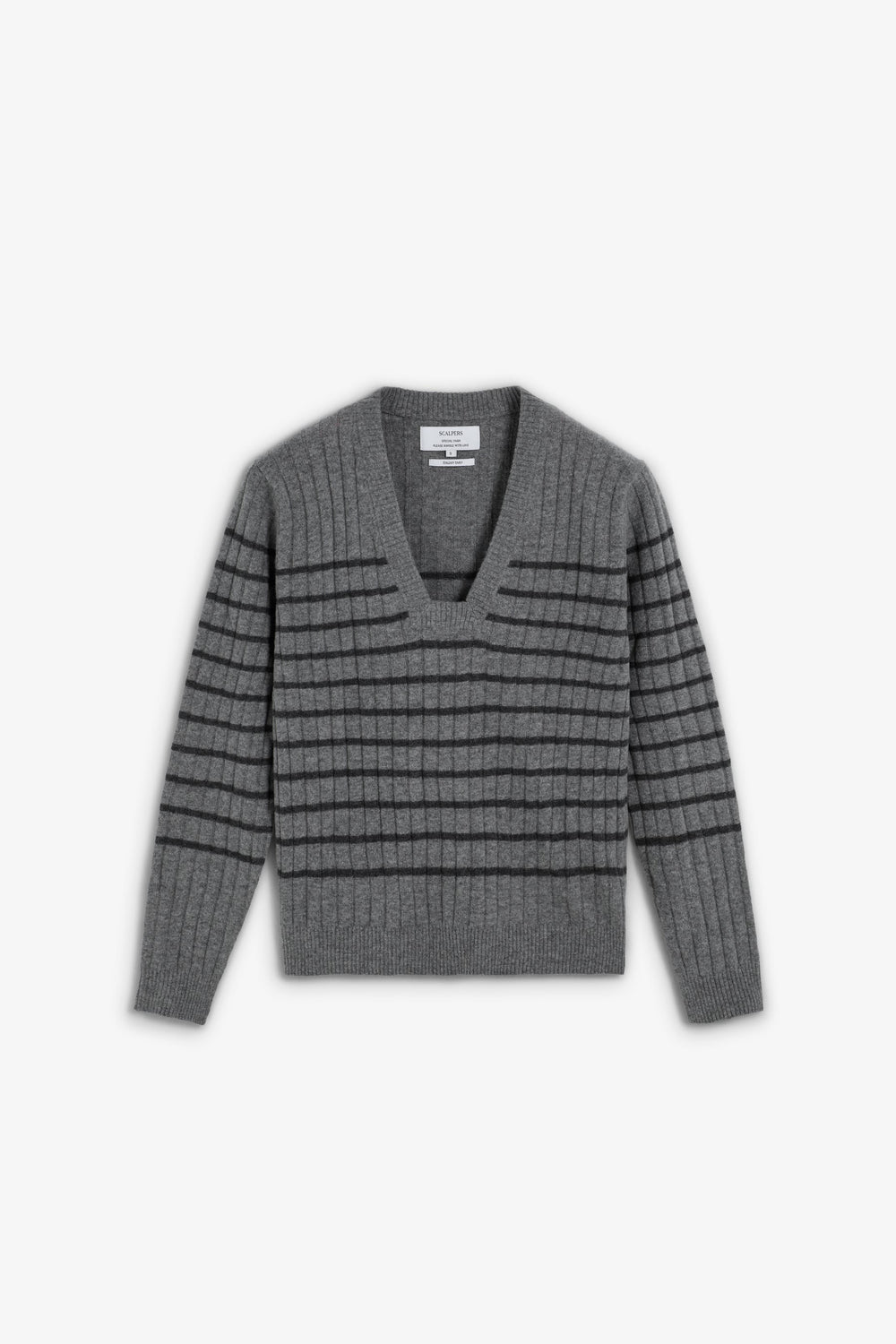Sweater made of ribbed wool blend with striped print. Regular fit, slightly squared V-neck design. Long sleeves.