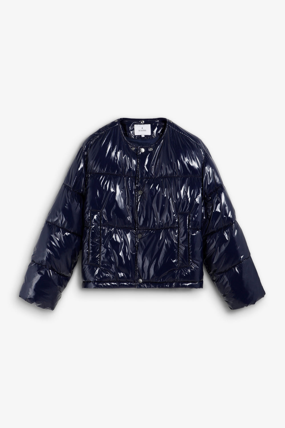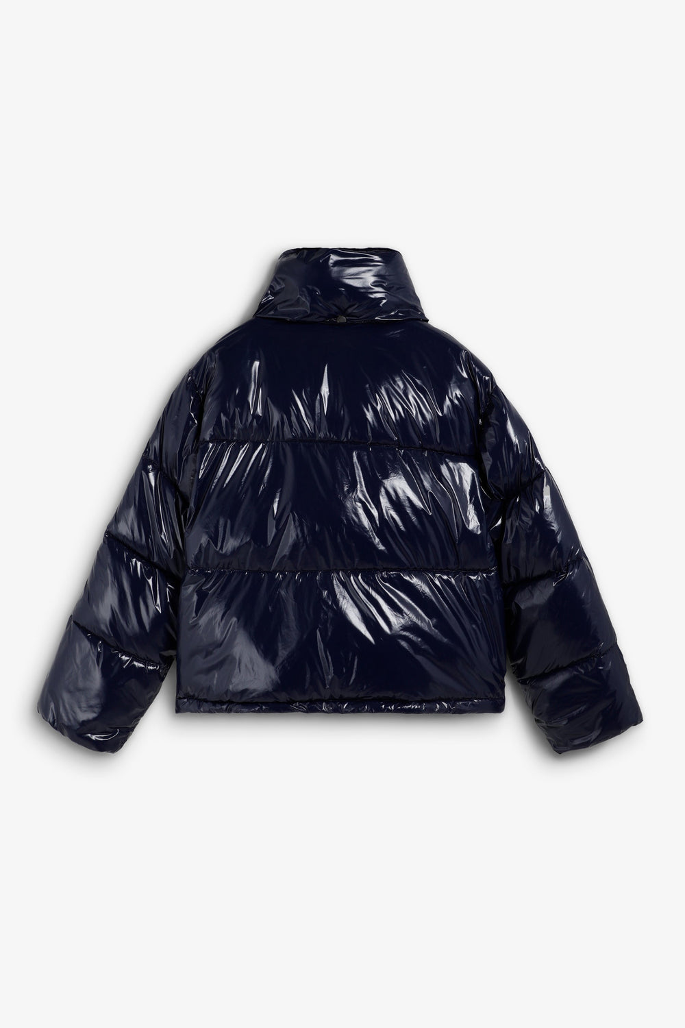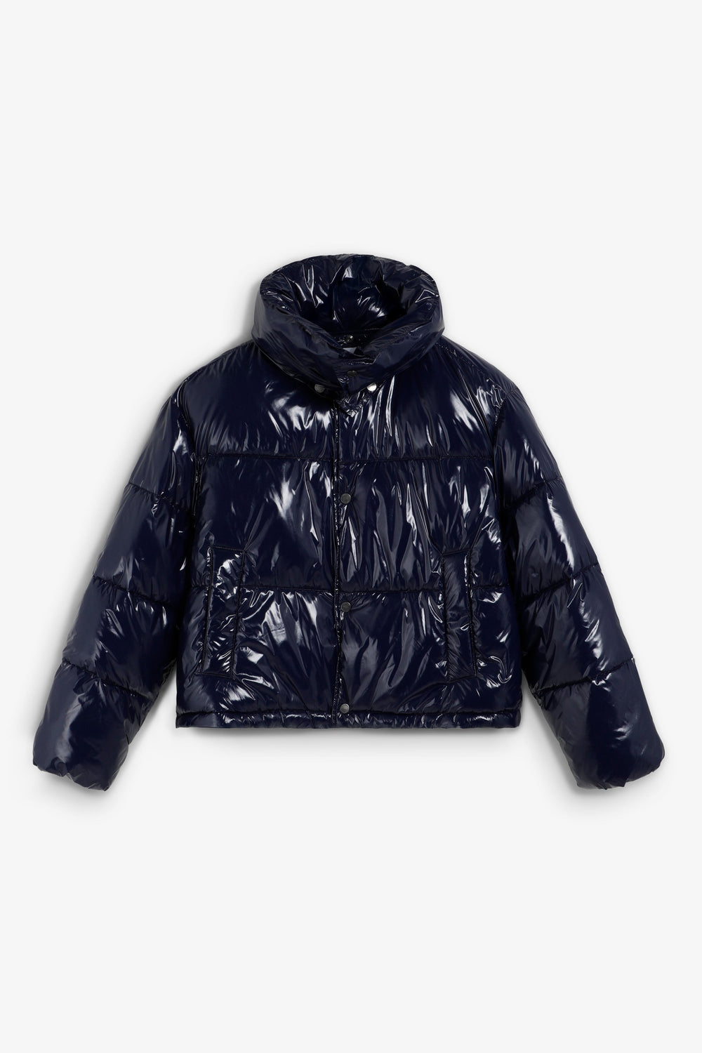 Quilted down jacket made of nylon with shiny finish. Regular fit. High collar. Long sleeves. Side slant pockets. Snap button fastening.