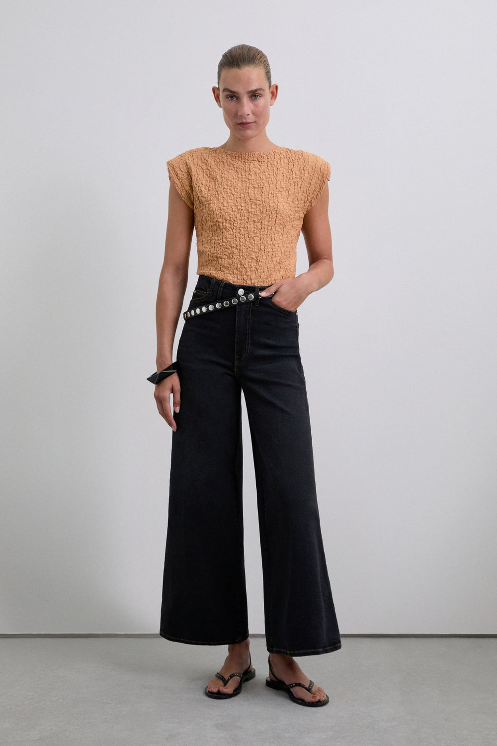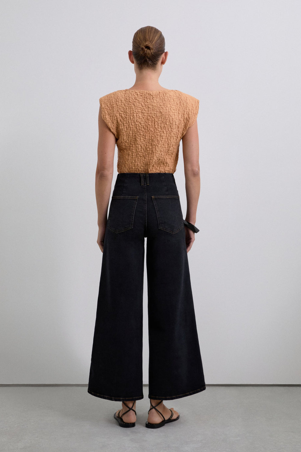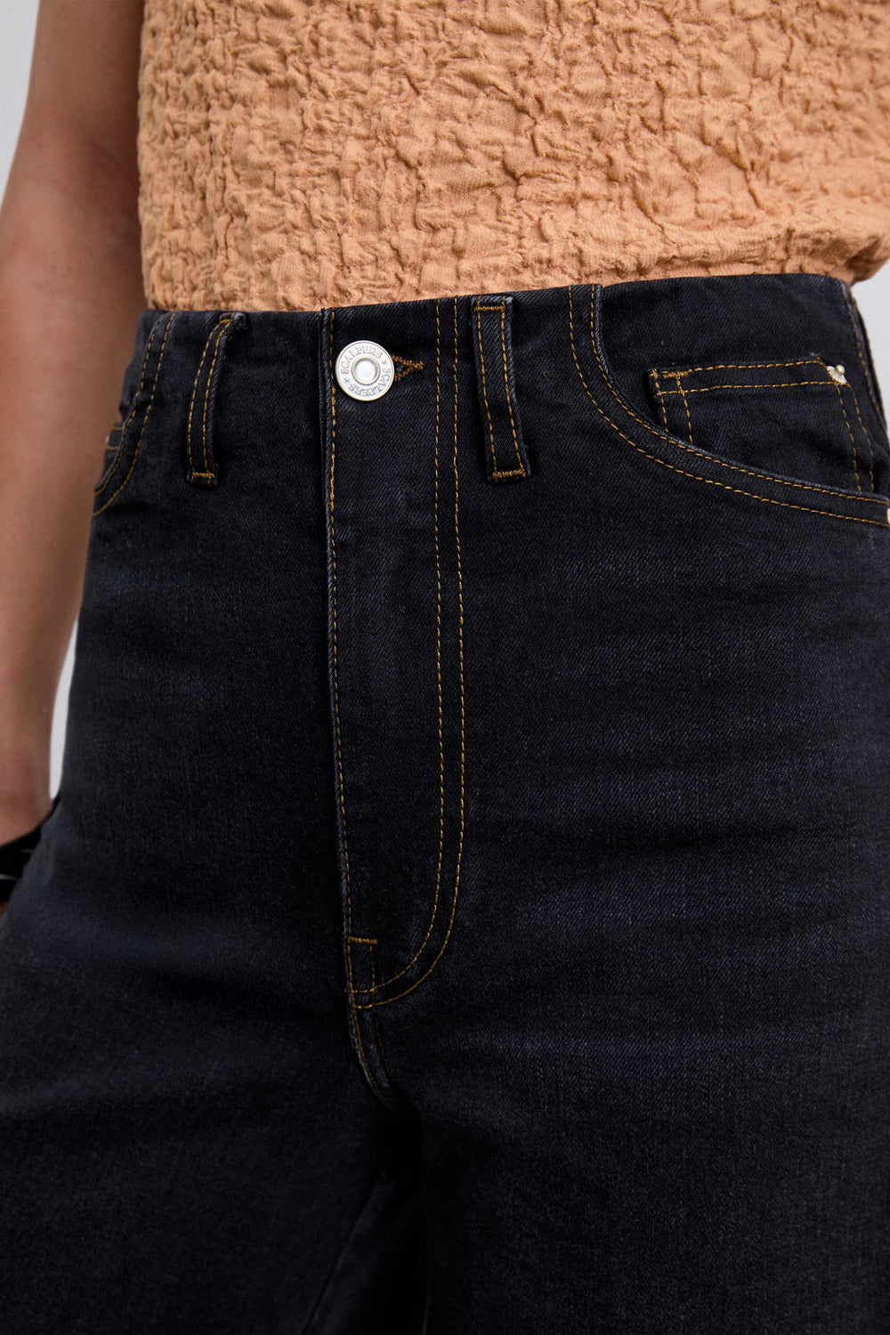 Jeans made of a slightly stretch cotton fabric. Culottes with high waist and zip and button fastening. Front and back pockets.