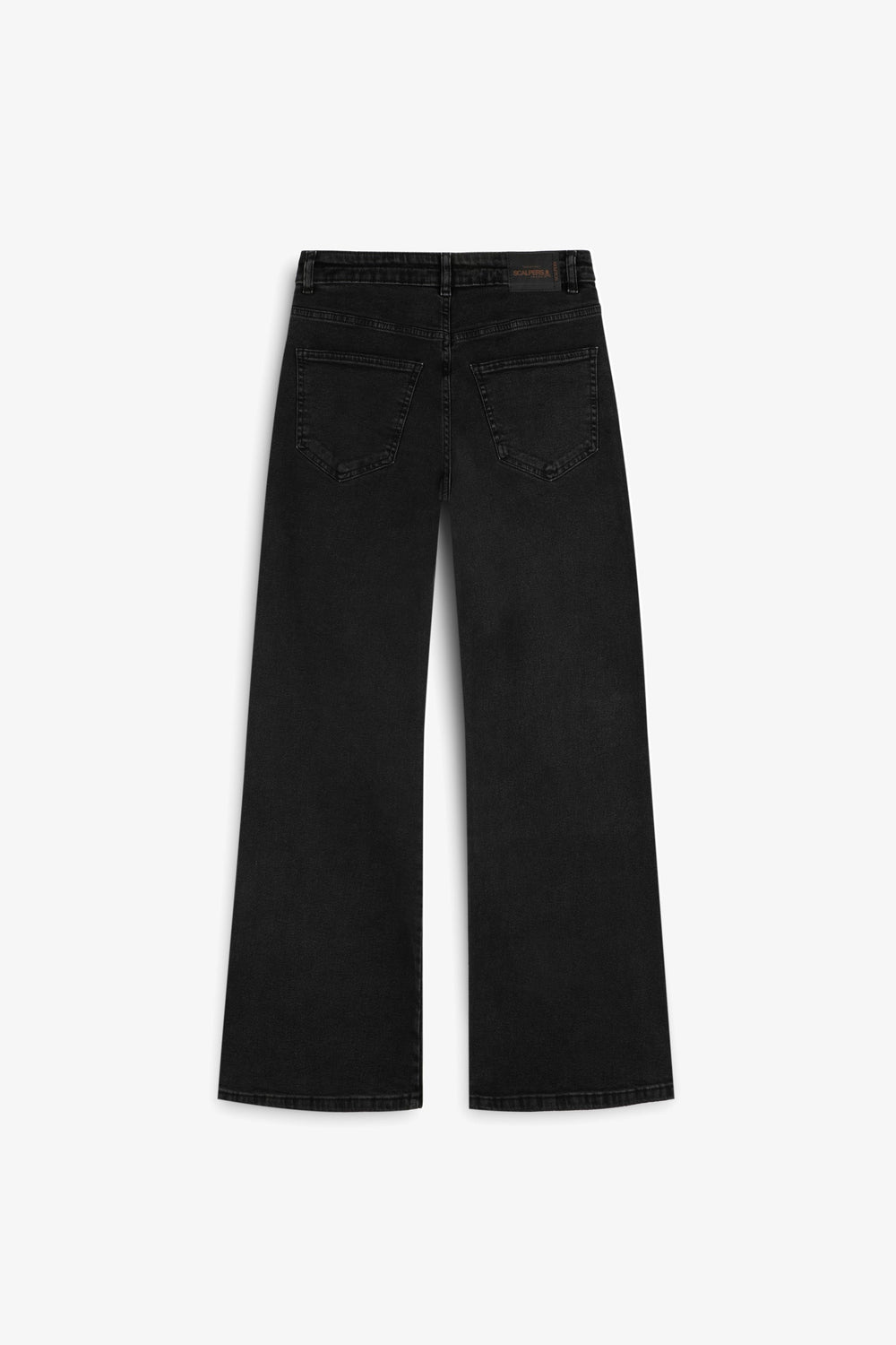 Black mid-rise trousers with belt loops. Full length, front zip and button fastening. Back and front pockets.