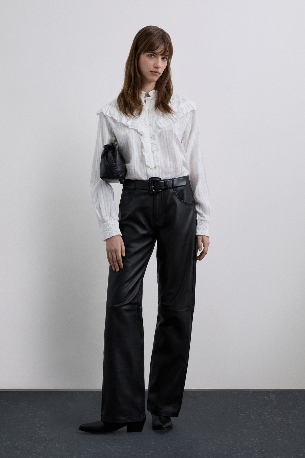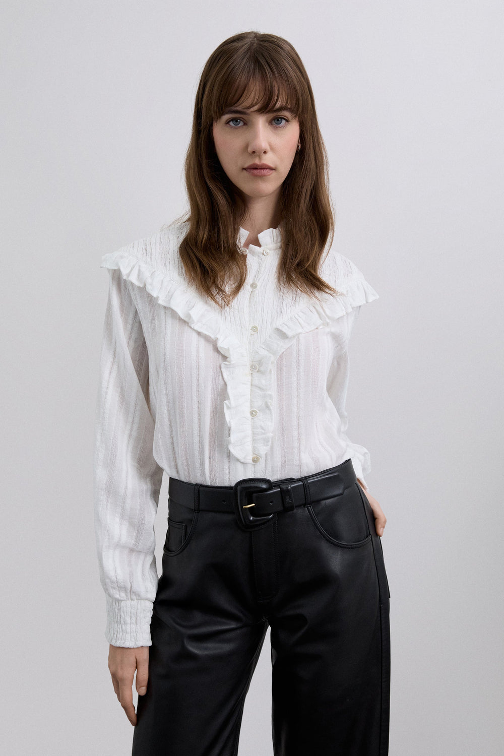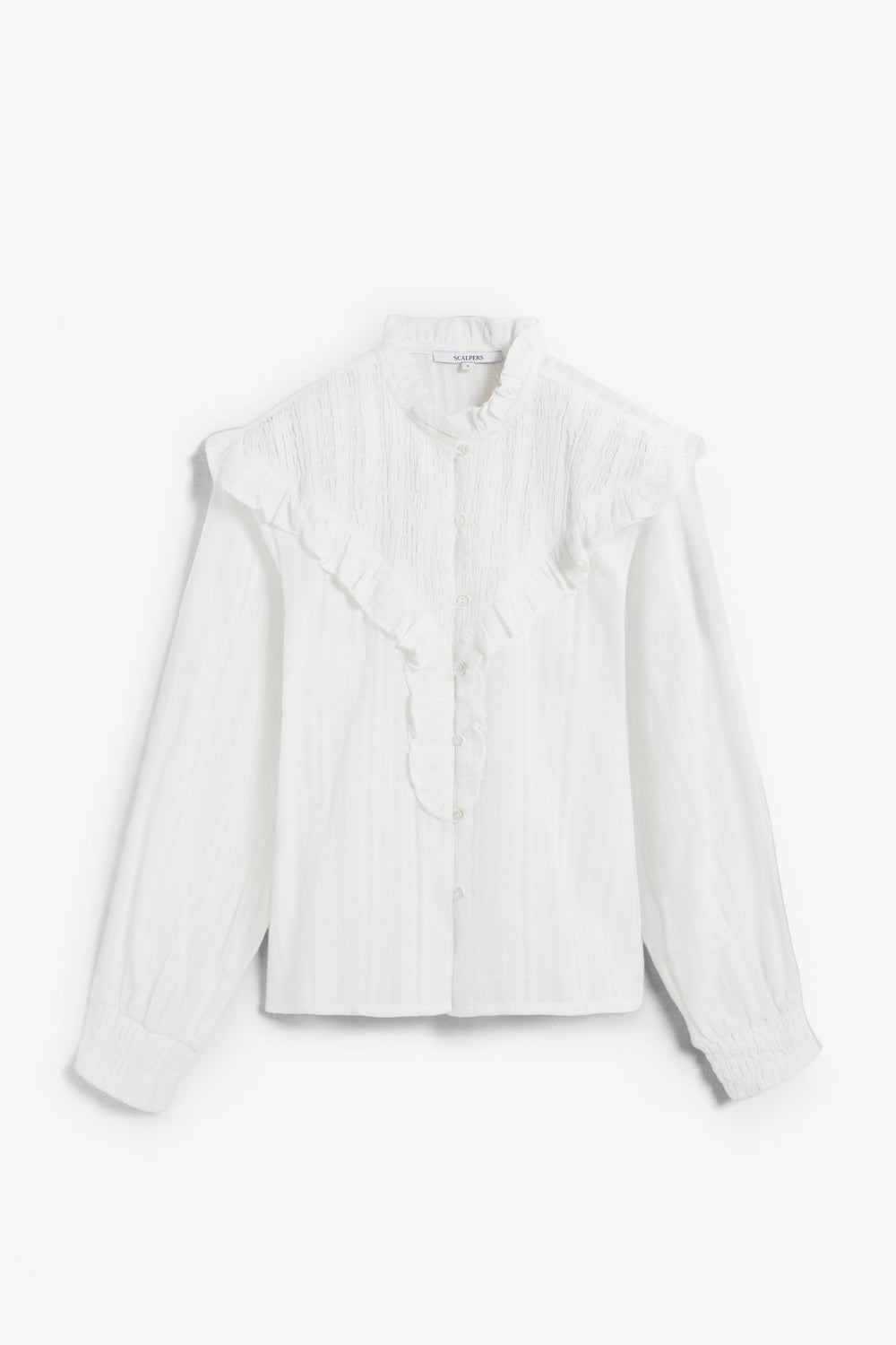 Long sleeve blouse made of 100% cotton. Classic collar and ruffle in smocked fabric. Mother-of-pearl buttons.