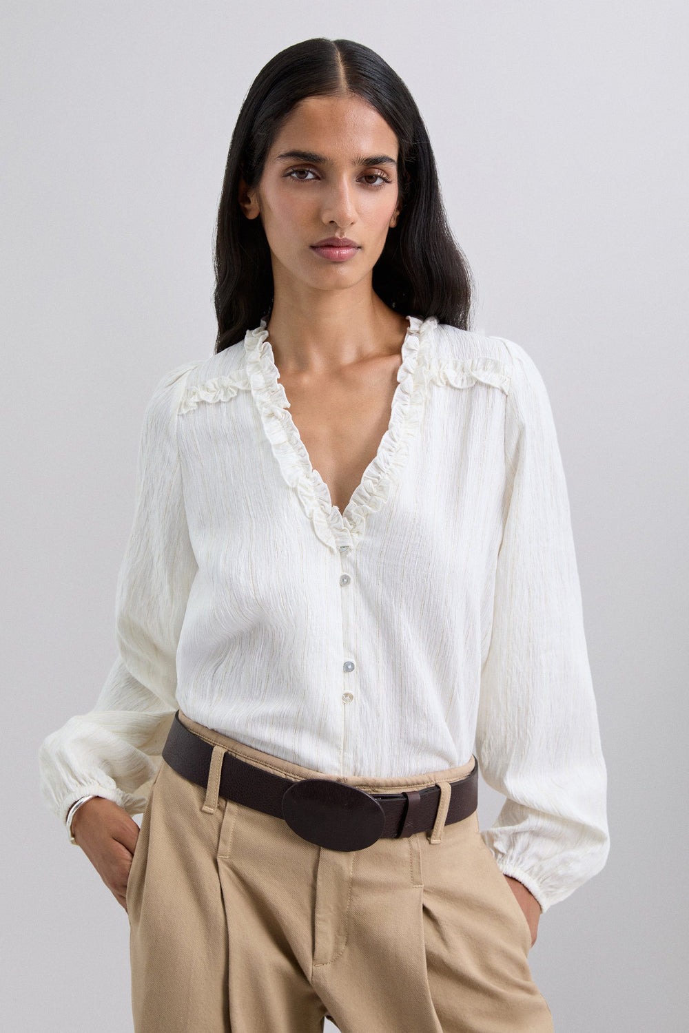 METALLIC THREAD BLOUSE WITH RUFFLES