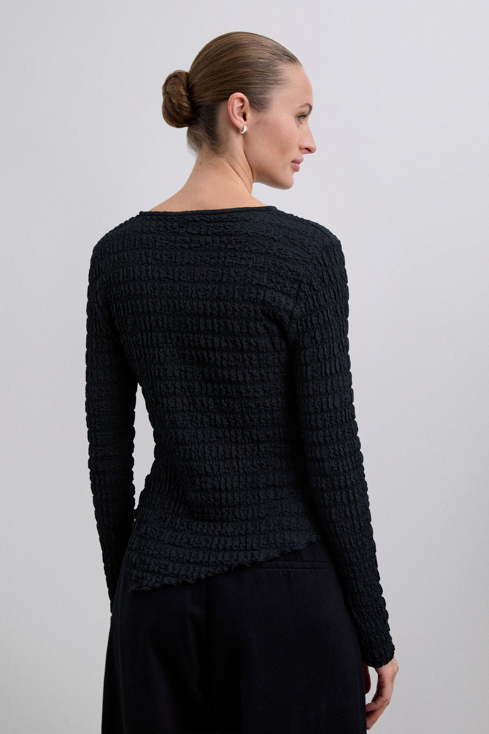 Round neck top with long sleeves. Lightweight fabric with gathered texture.