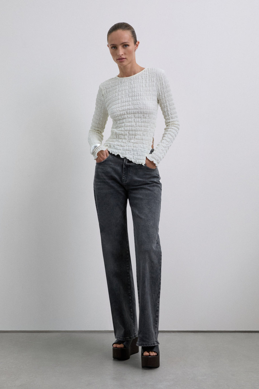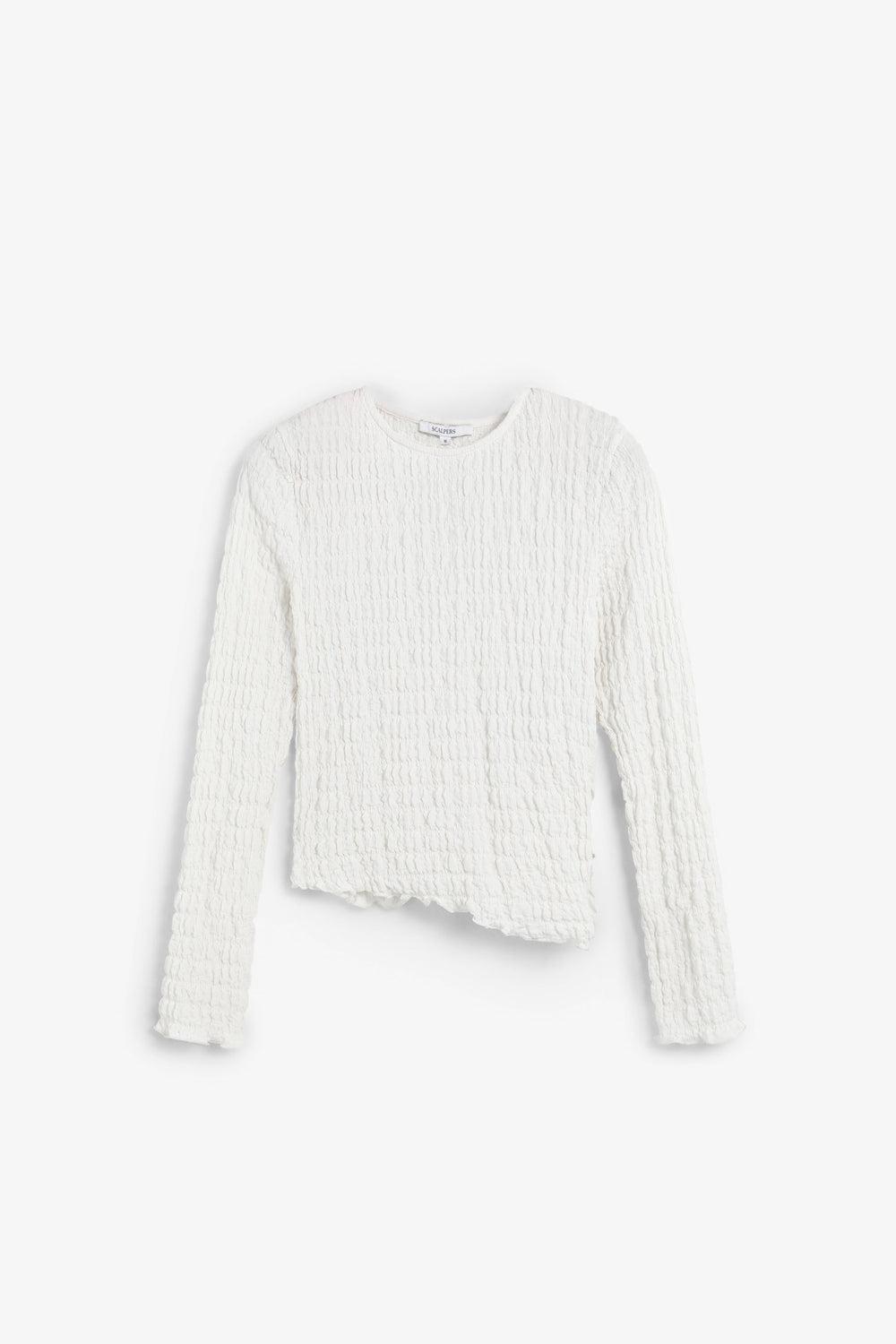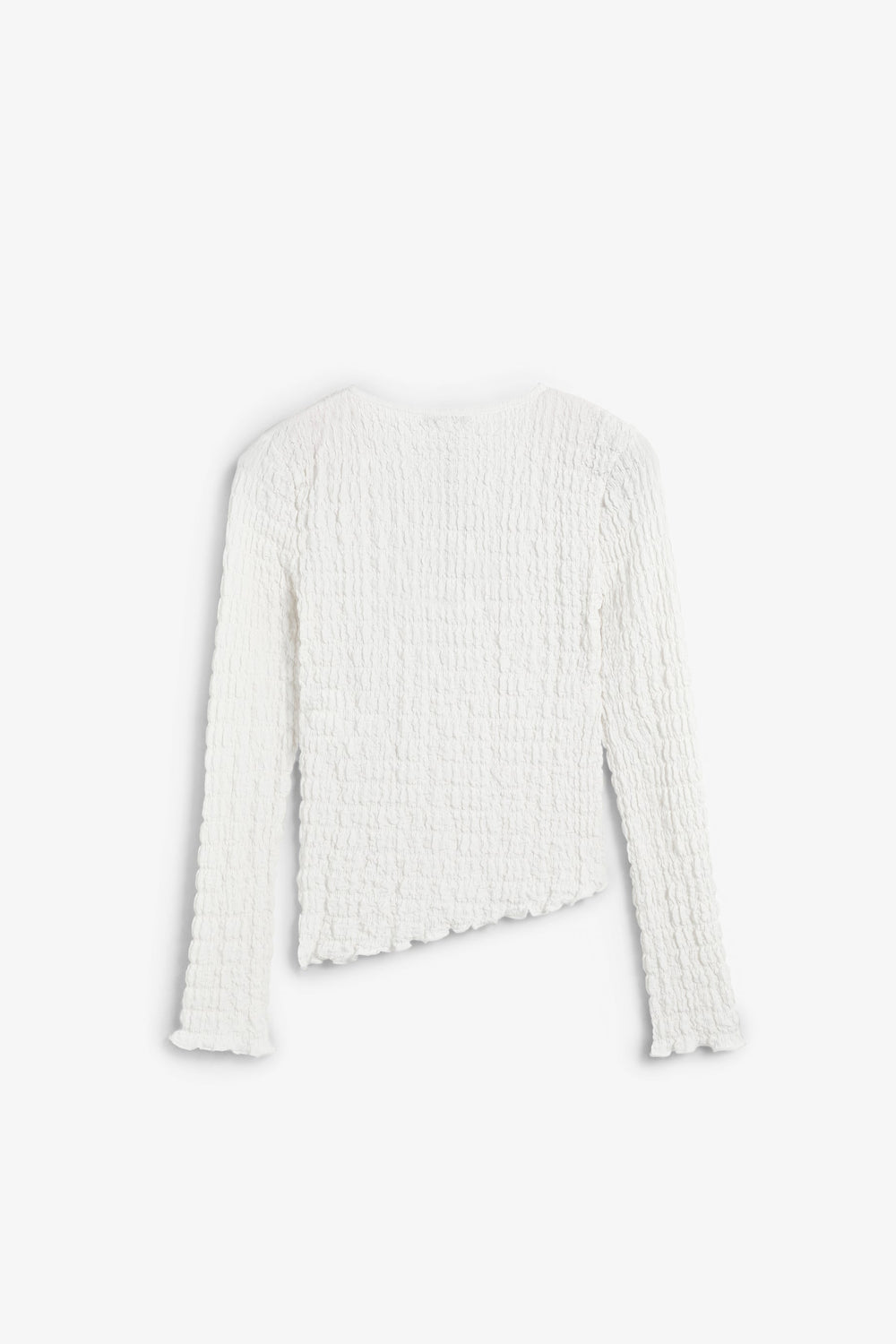 Round neck top with long sleeves. Lightweight fabric with gathered texture.