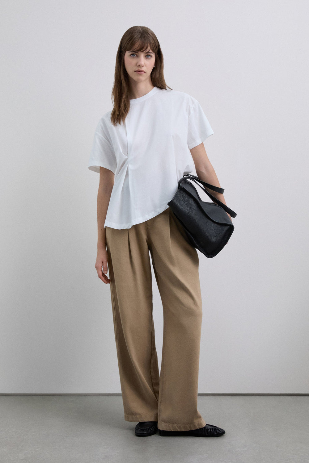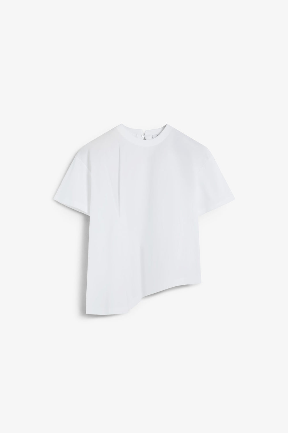 Short sleeve asymmetric-style T-shirt made of 100% BCI cotton. It features a round neck and an overlapping front panel that creates a draped side effect. Back fastening with small opening.
