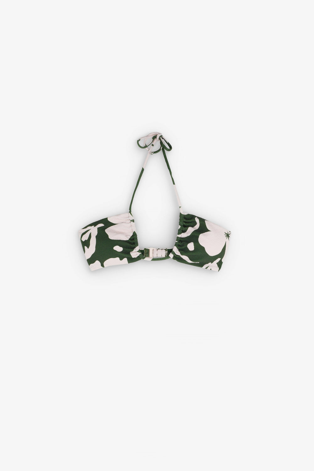 This bikini is designed in collaboration with Scalpers and belongs to the ROBIN x SCALPERS collection. This is a low-cut bandeau bikini with floral print on structure, in green and ecru. It has removable foam pads, multi-position shoulder straps and a multi-position hook-and-eye fastening at the back for a better fit. High-cut, fully lined bottom. Also available with a classic cover bottom with side ties.