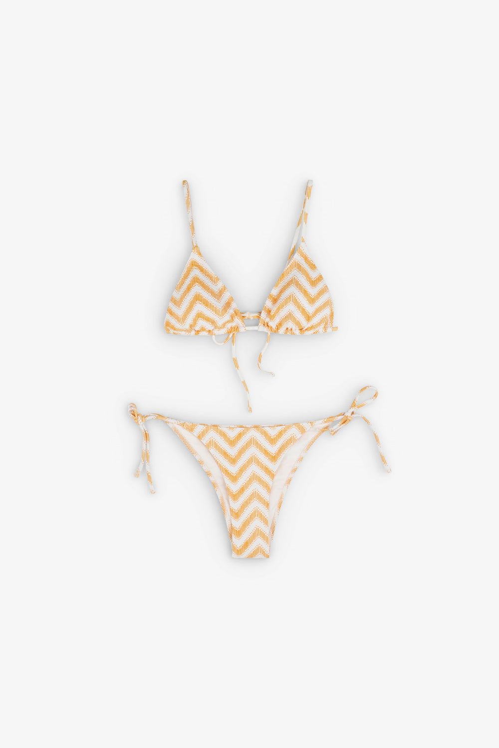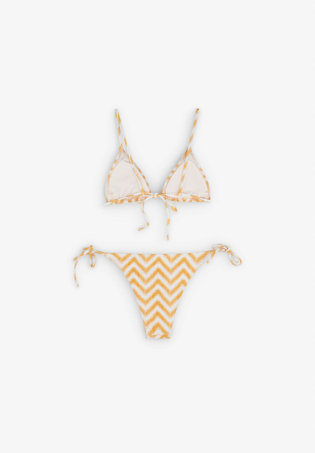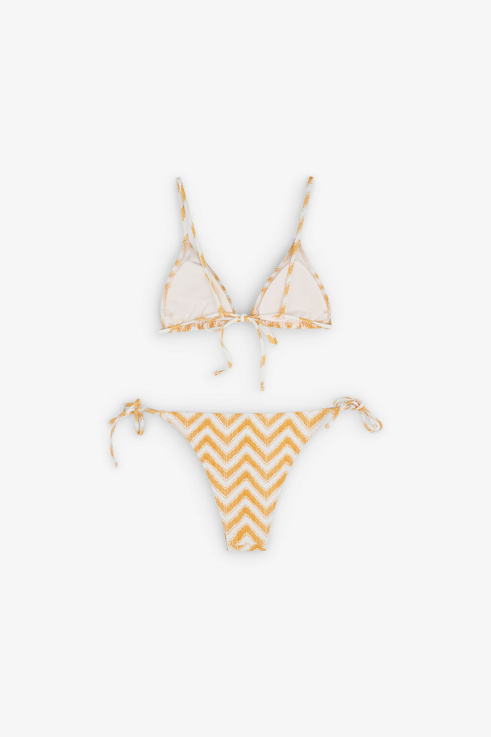 This bikini is designed in collaboration with Scalpers and belongs to the ROBIN x SCALPERS collection. This is a curtain bikini with a yellow zig zag ethnic print on a textured ecru background. It has removable foam pads, knotted at the neck or back for greater comfort. Bottom with classic coverage and side ties, fully lined.