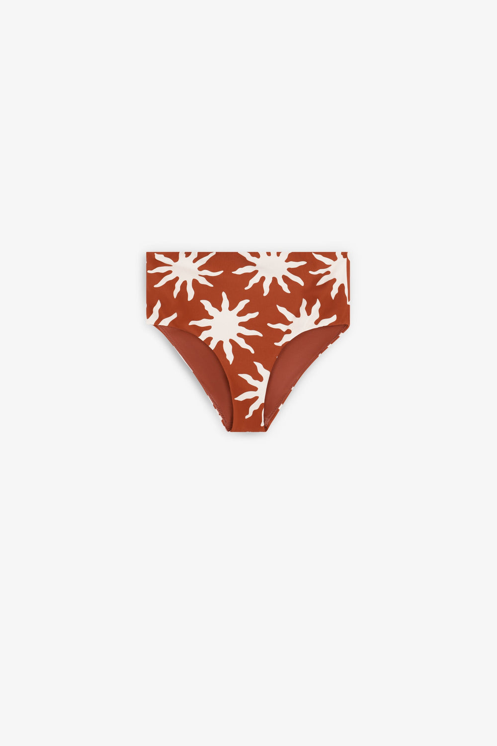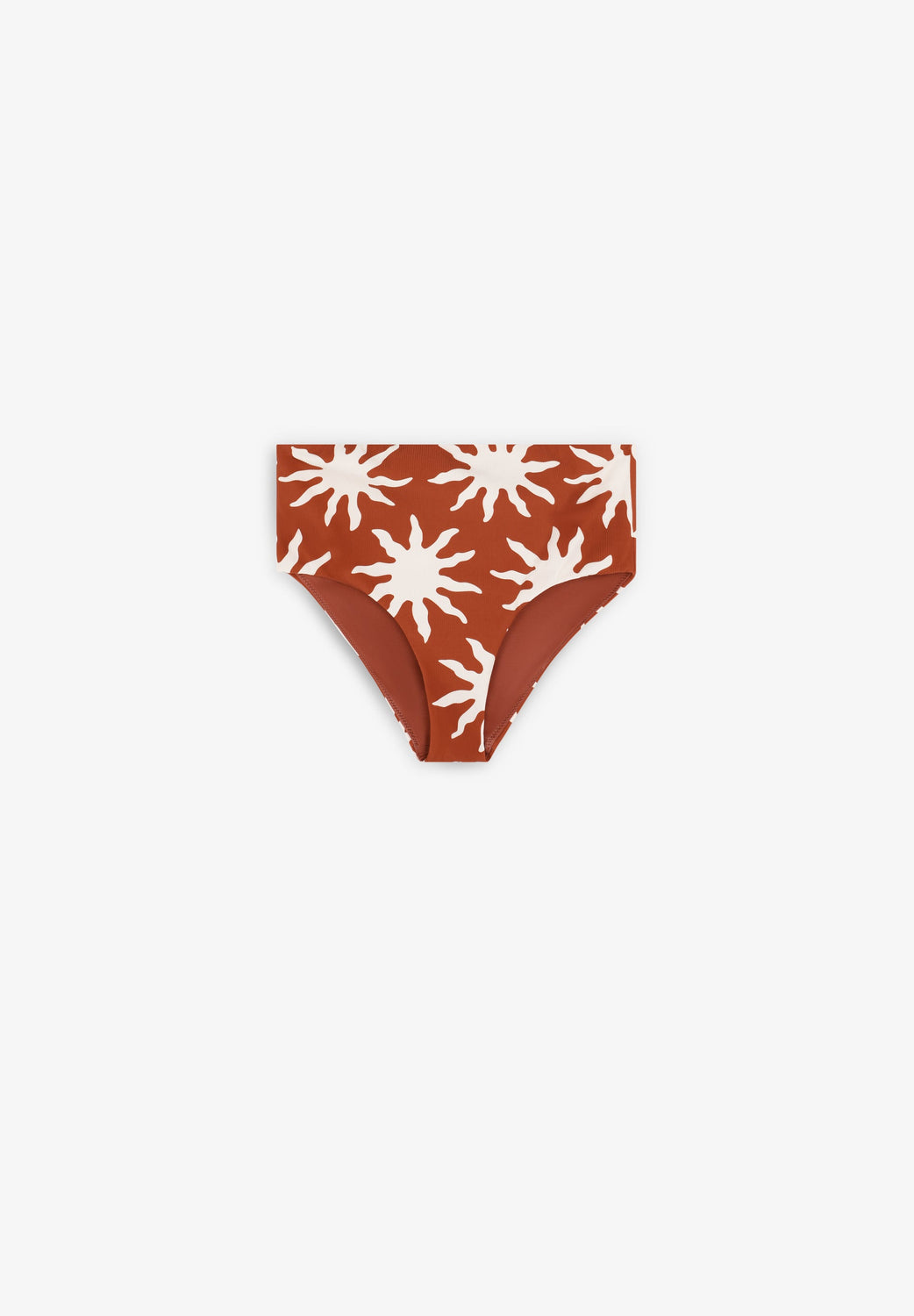 This bikini is designed in collaboration with Scalpers and belongs to the ROBIN x SCALPERS collection. This is a triangle bikini with sun print in ecru on a terracotta background in a ribbed structure. With removable foam pads and chest strap. Adjustable shoulder straps and a multi-position hook-and-eye fastening at the back for a better fit. High-cut, fully lined bottom.