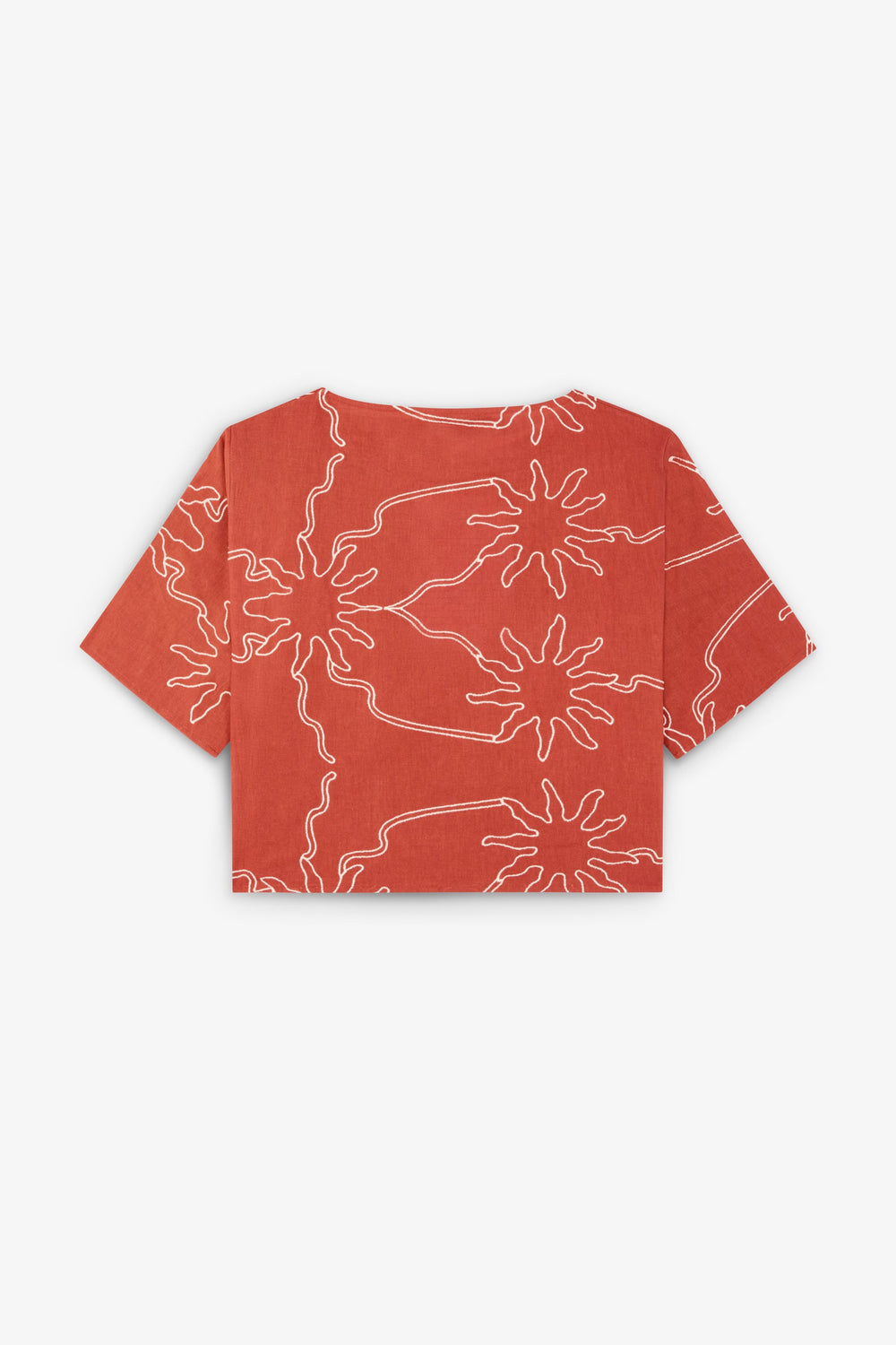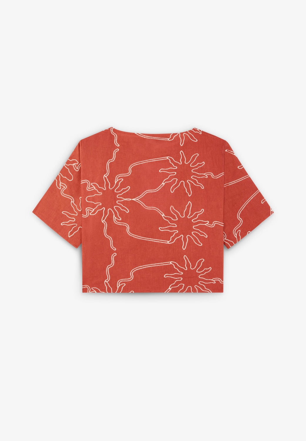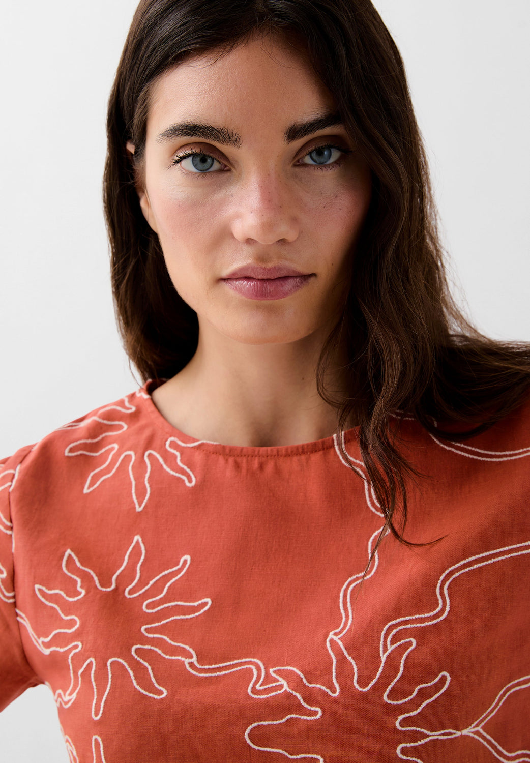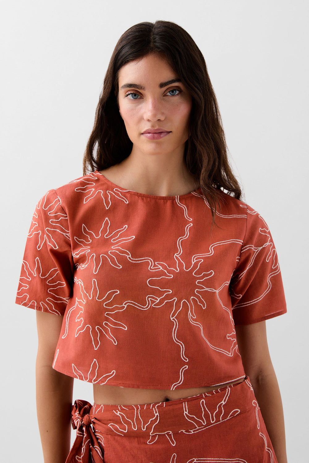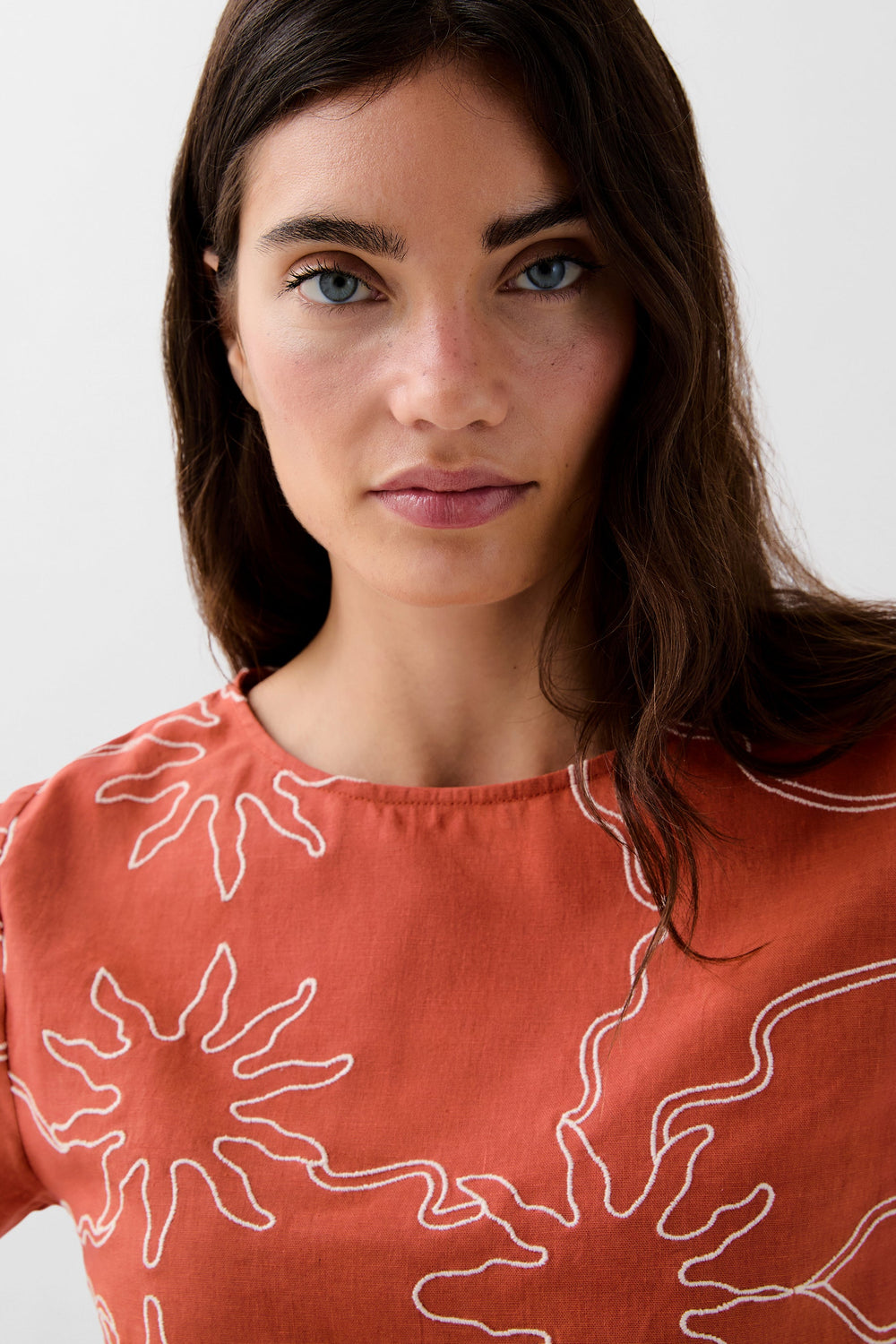 This top is designed in collaboration with Scalpers and belongs to the ROBIN x SCALPERS collection. Organic cotton and linen top. Short sleeve. Round neck. Contrast embroidered motifs.