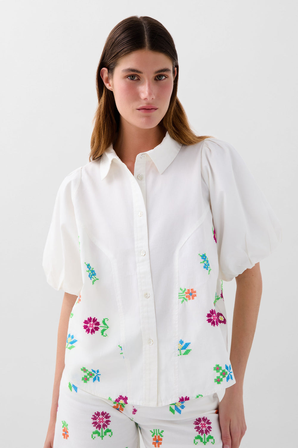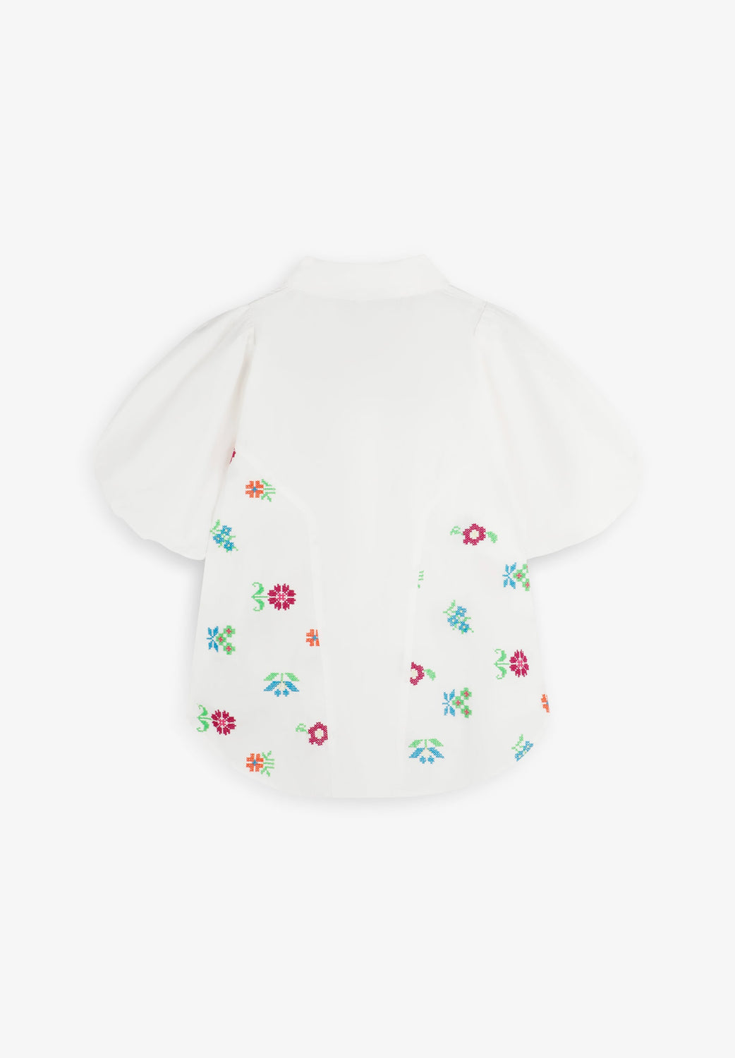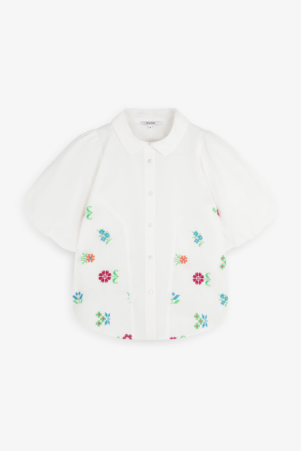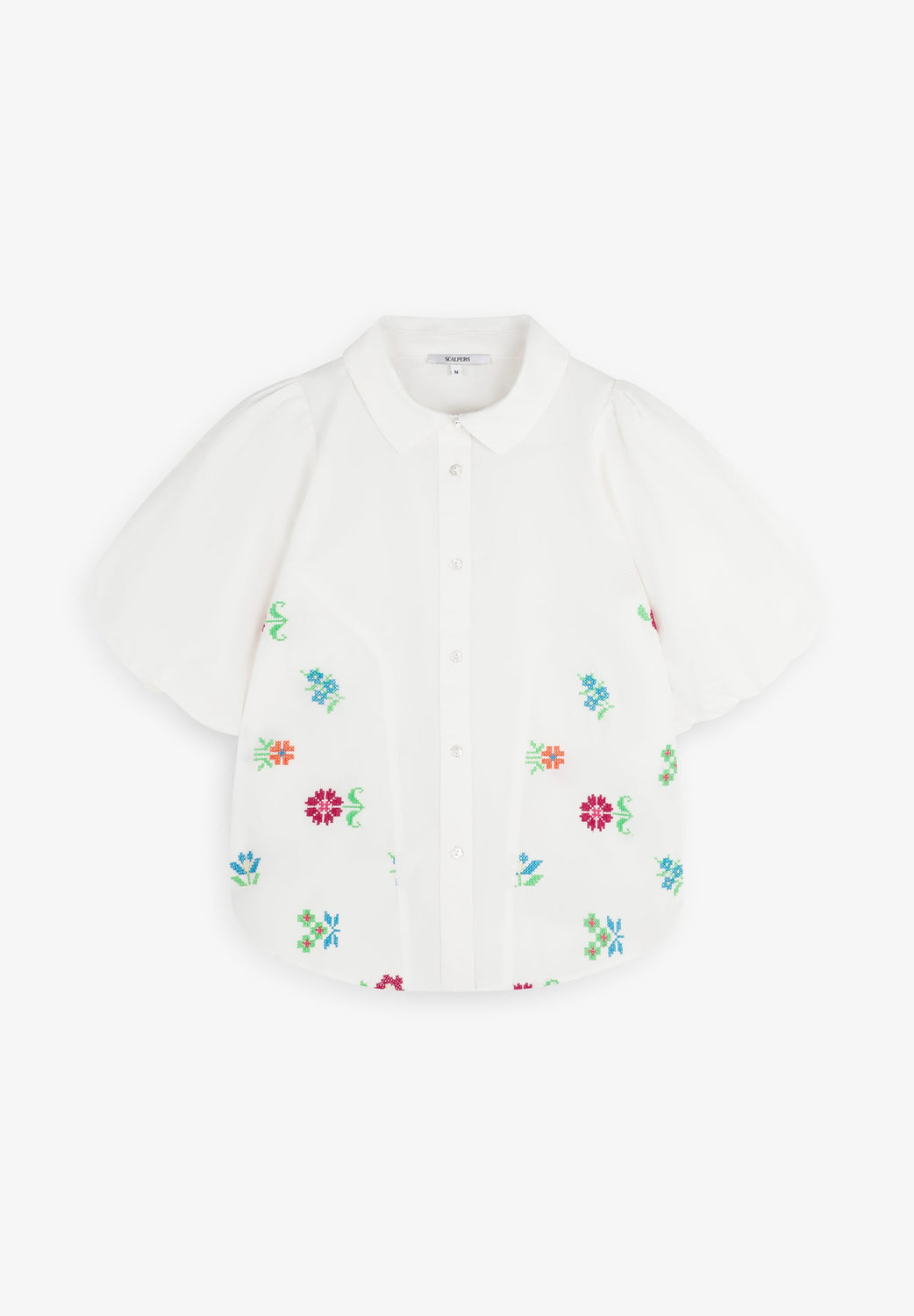 Shirt made of 100% cotton with embroidered details. Regular fit, short puff sleeves, classic collar and button fastening.