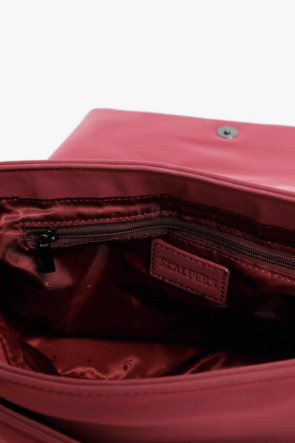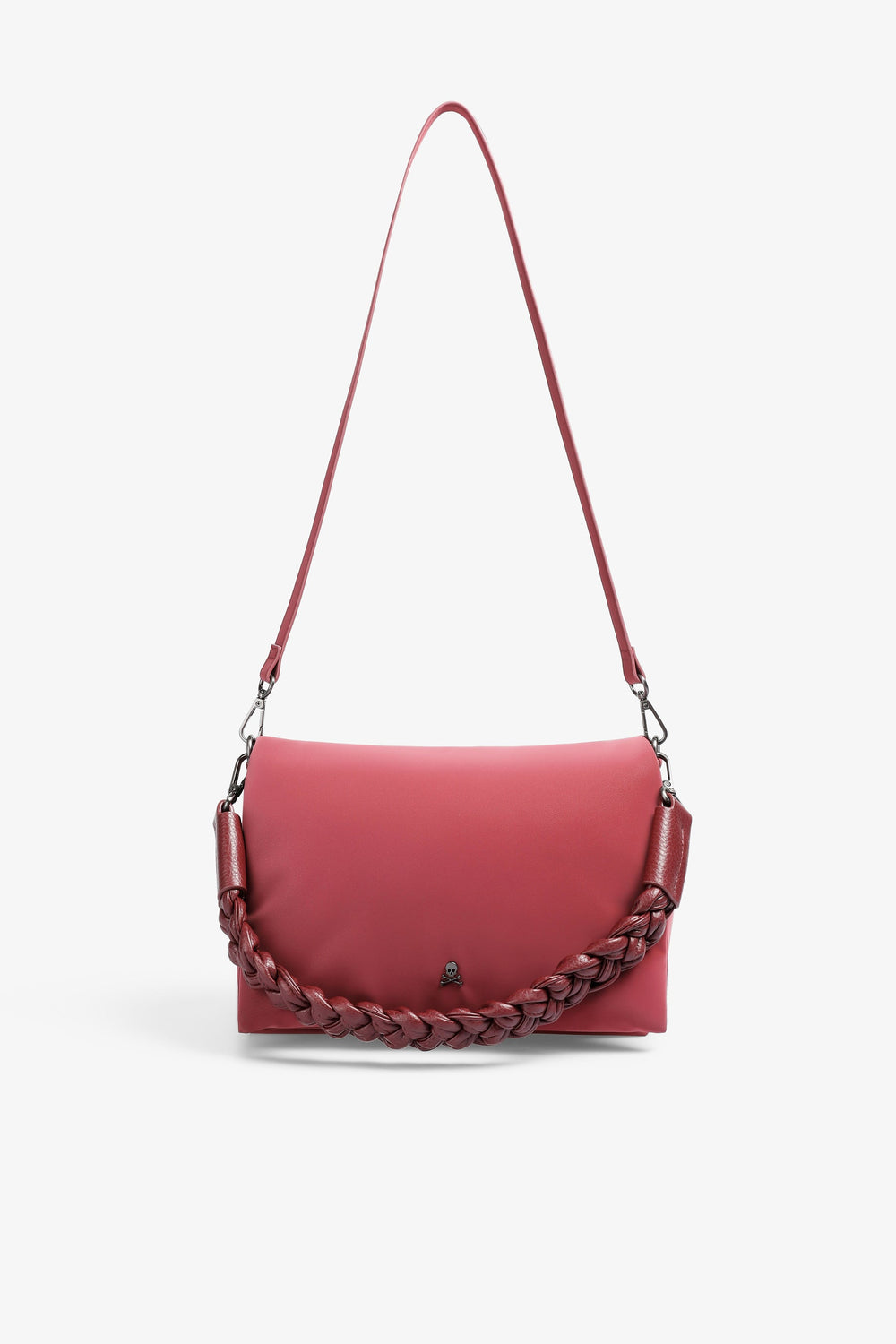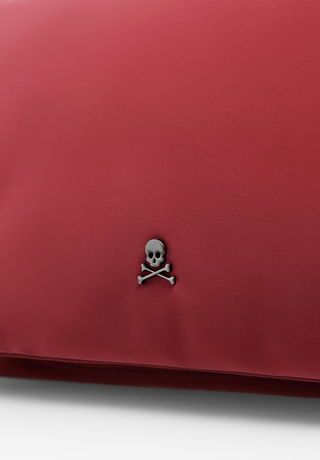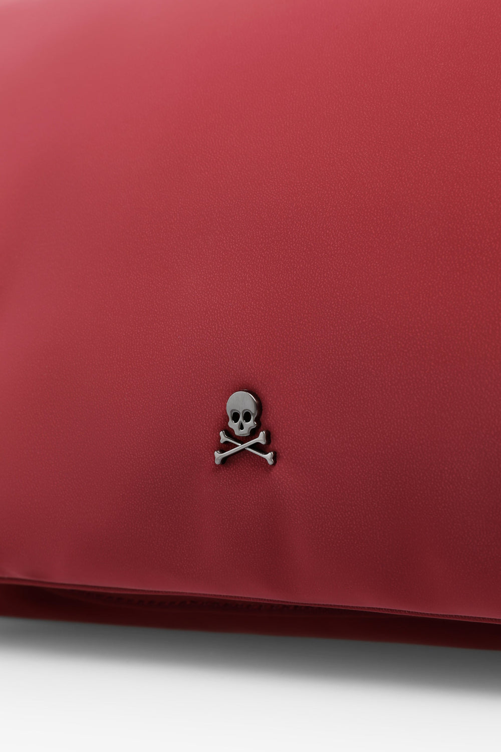 Bag made of polyurethane. Magnetic button fastening. Short braided handle with metallic details and long adjustable strap. Metallic patch with skull on front. Inner lining and pocket with zip closure and logo detail.