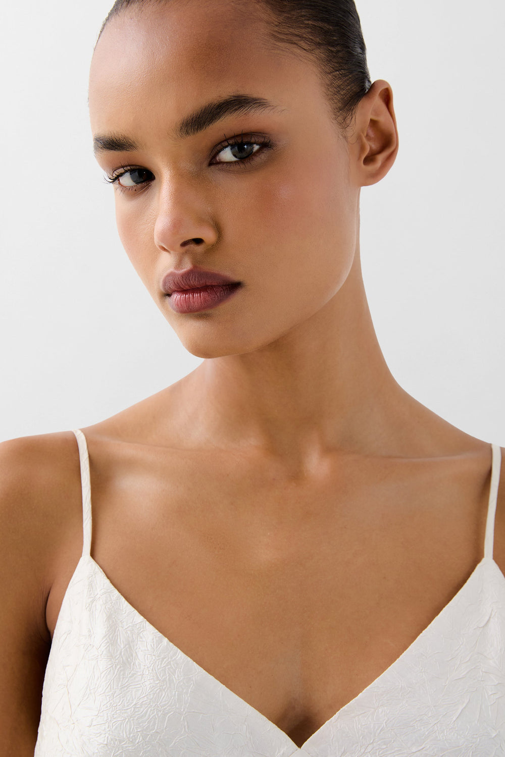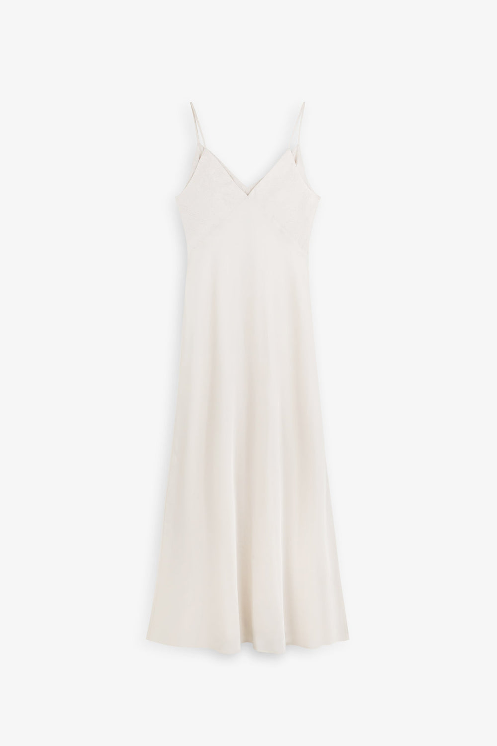 Dress made of flowing textured fabric. Slim fit, long cut, with adjustable thin straps. V-neckline.