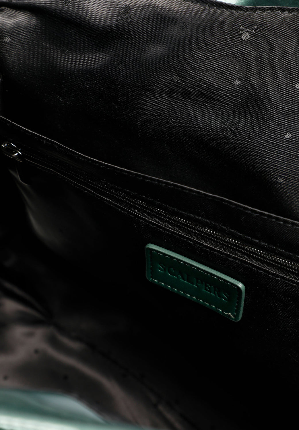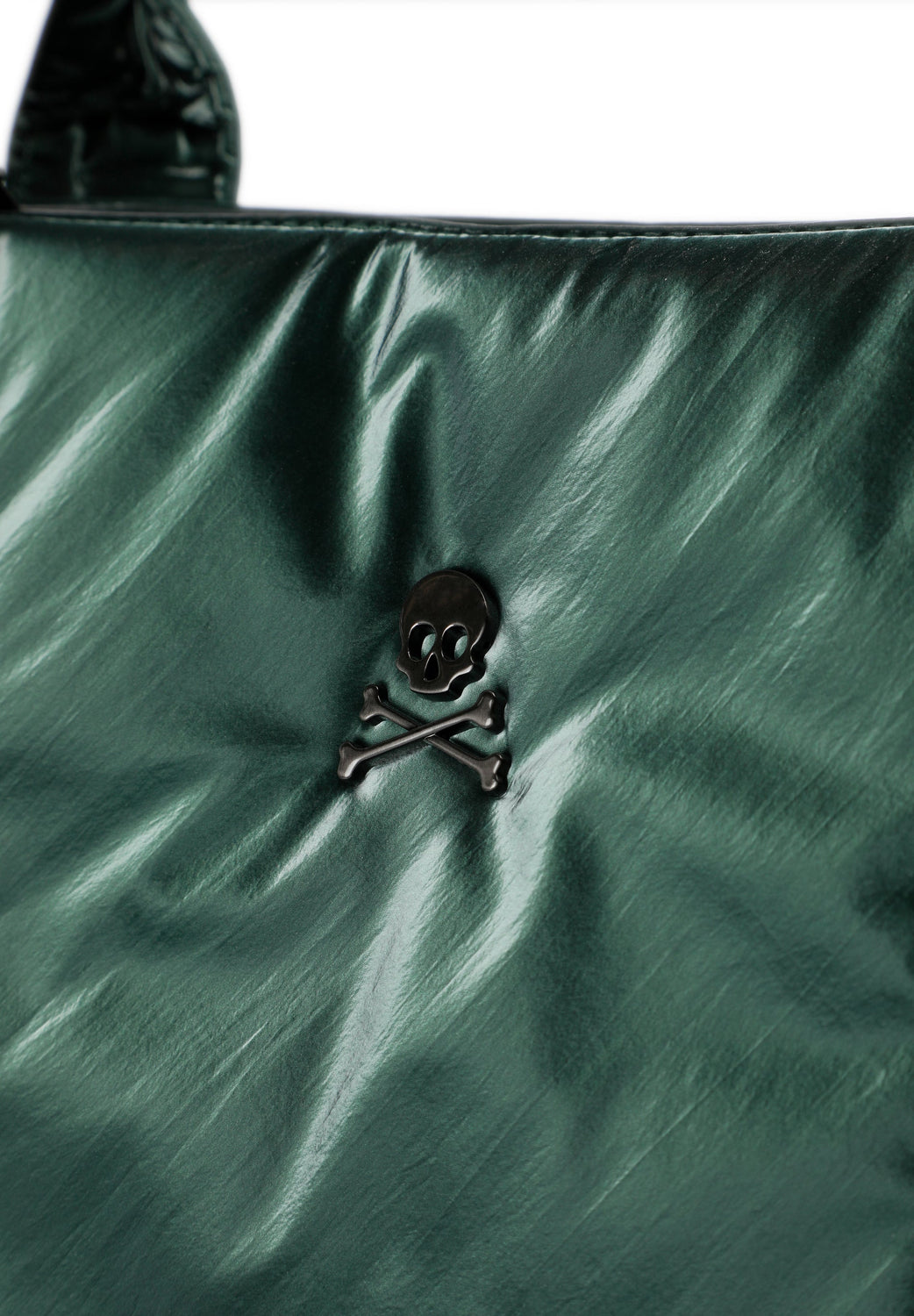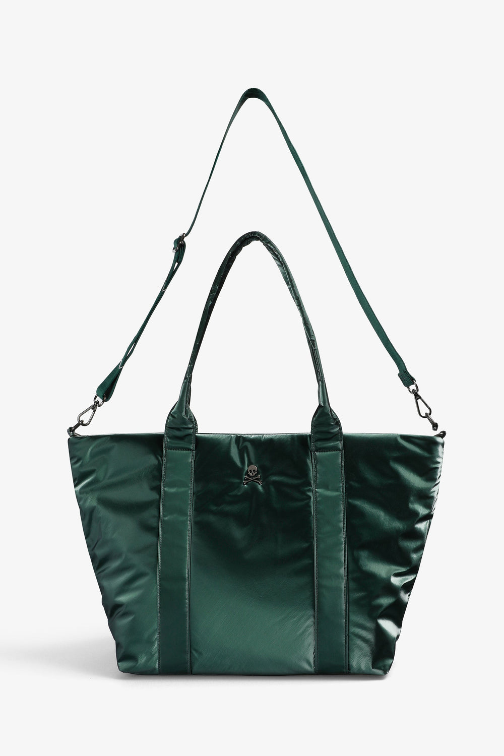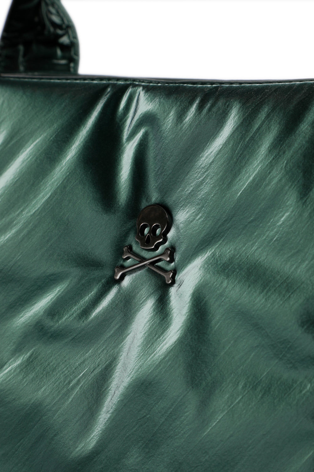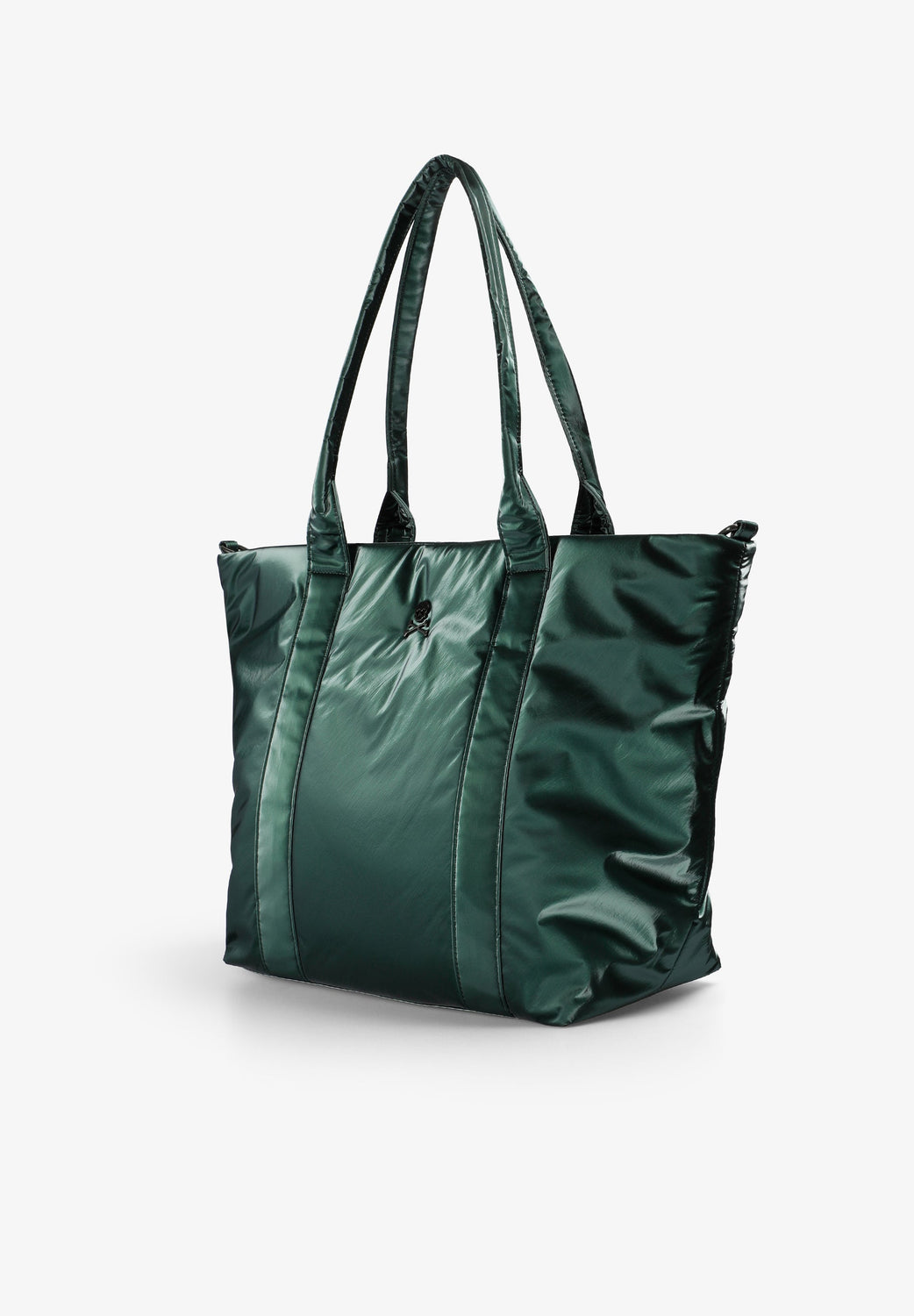 Metallic PU tote bag. Lightly padded, inner lining with zipped pocket. Zip fastening. Double strap. Metallic logo patch detail on the front.