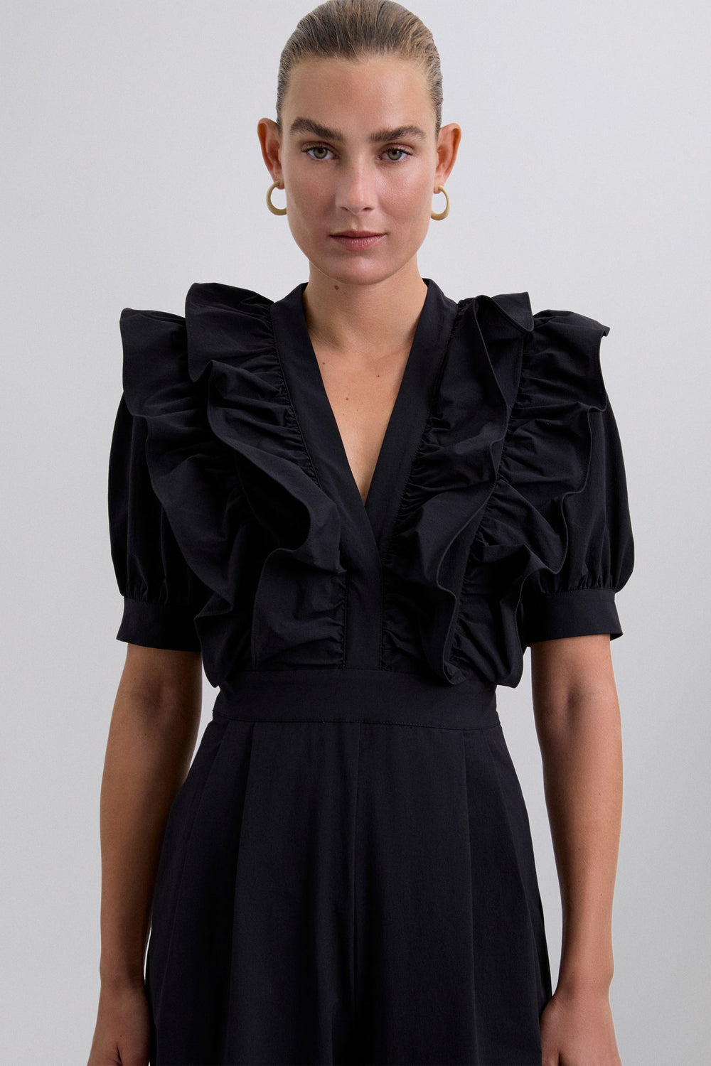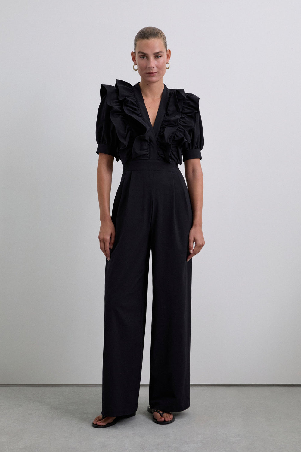 Black jumpsuit. Regular fit, V-neck with ruffle detail, puff sleeves with trim, fitted waist and full length trousers. Back zip fastening.