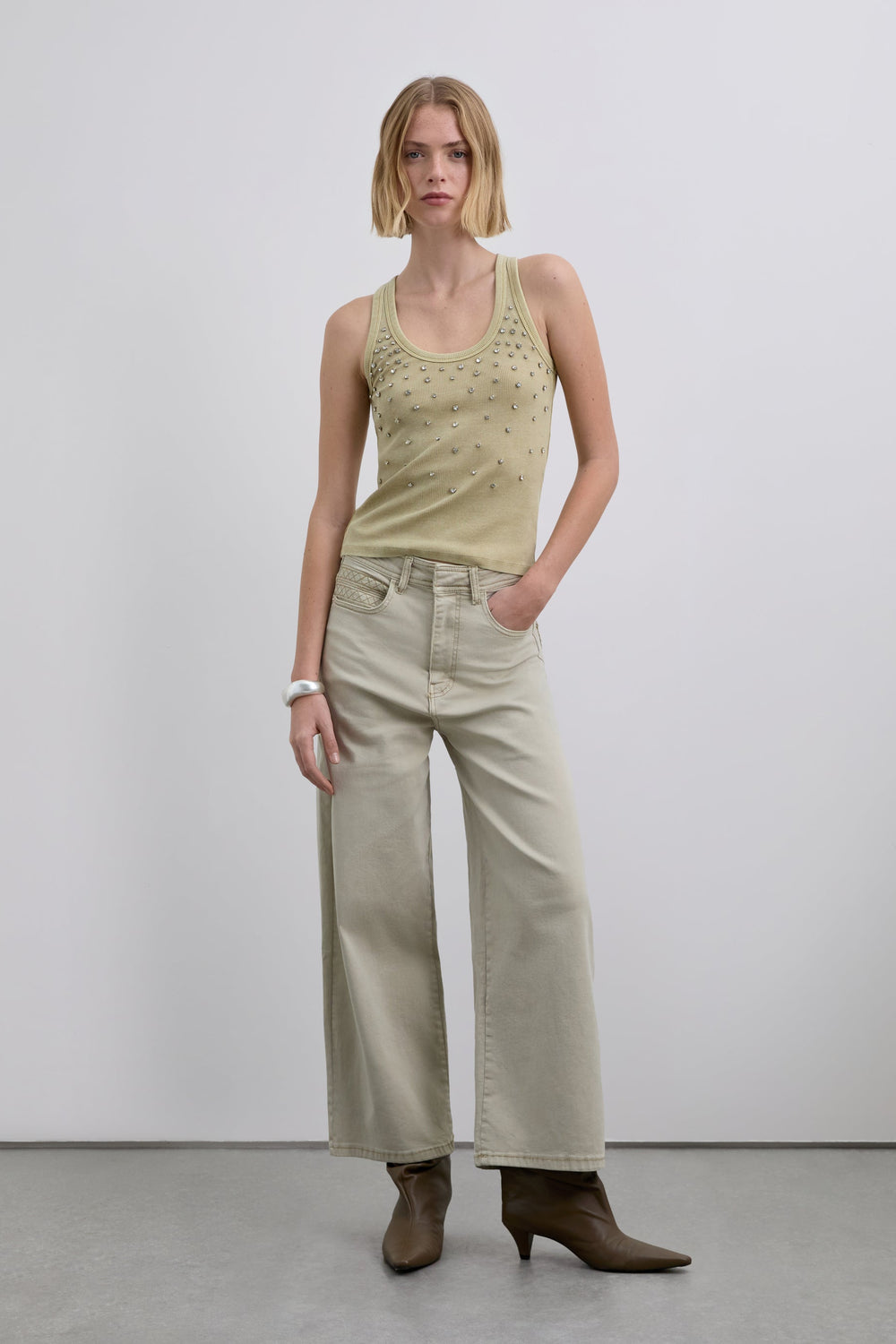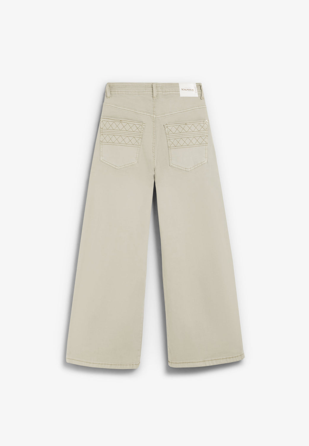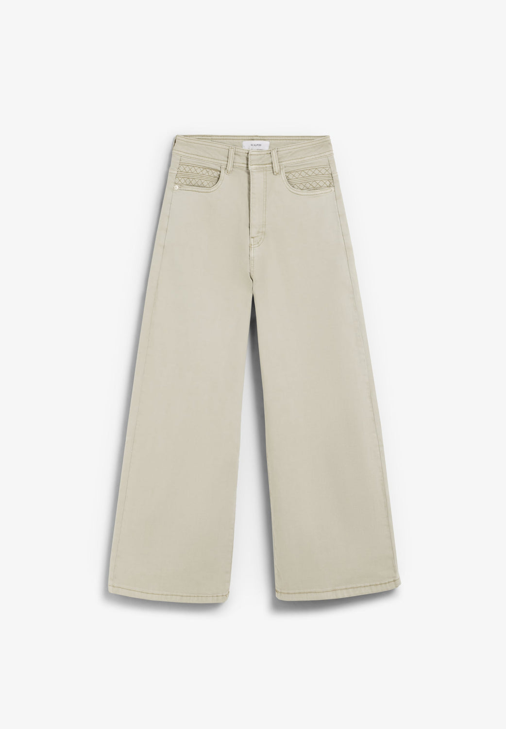 High-rise culottes in stretch twill. Embroidered details on the waistband and back pockets giving them a textured finish. Wide leg silhouette.