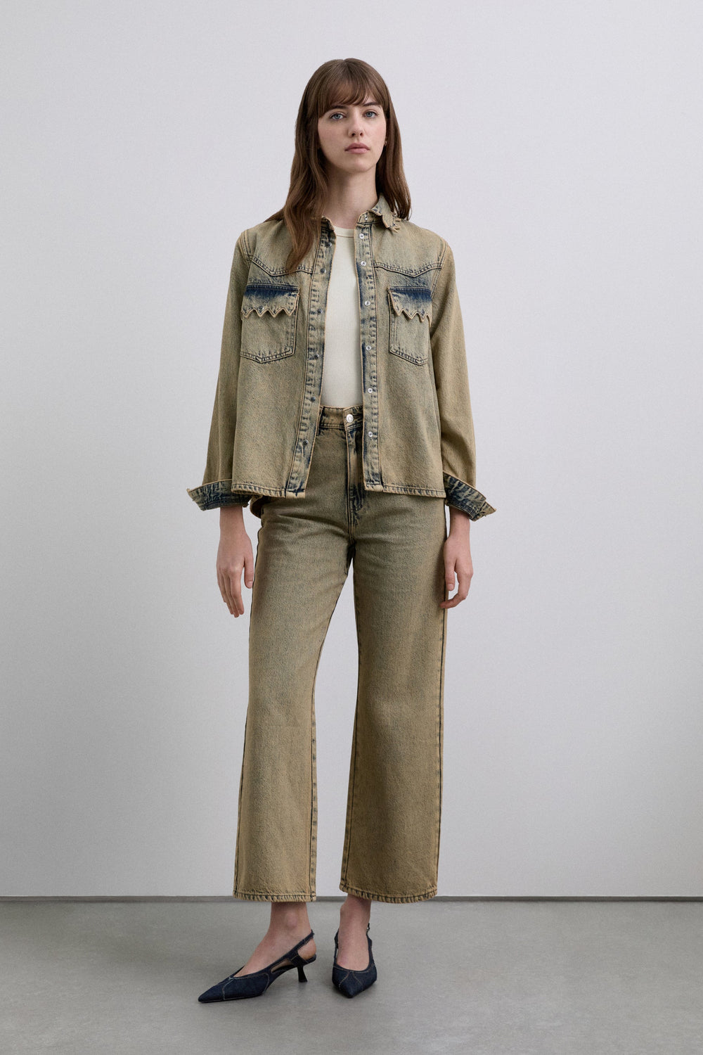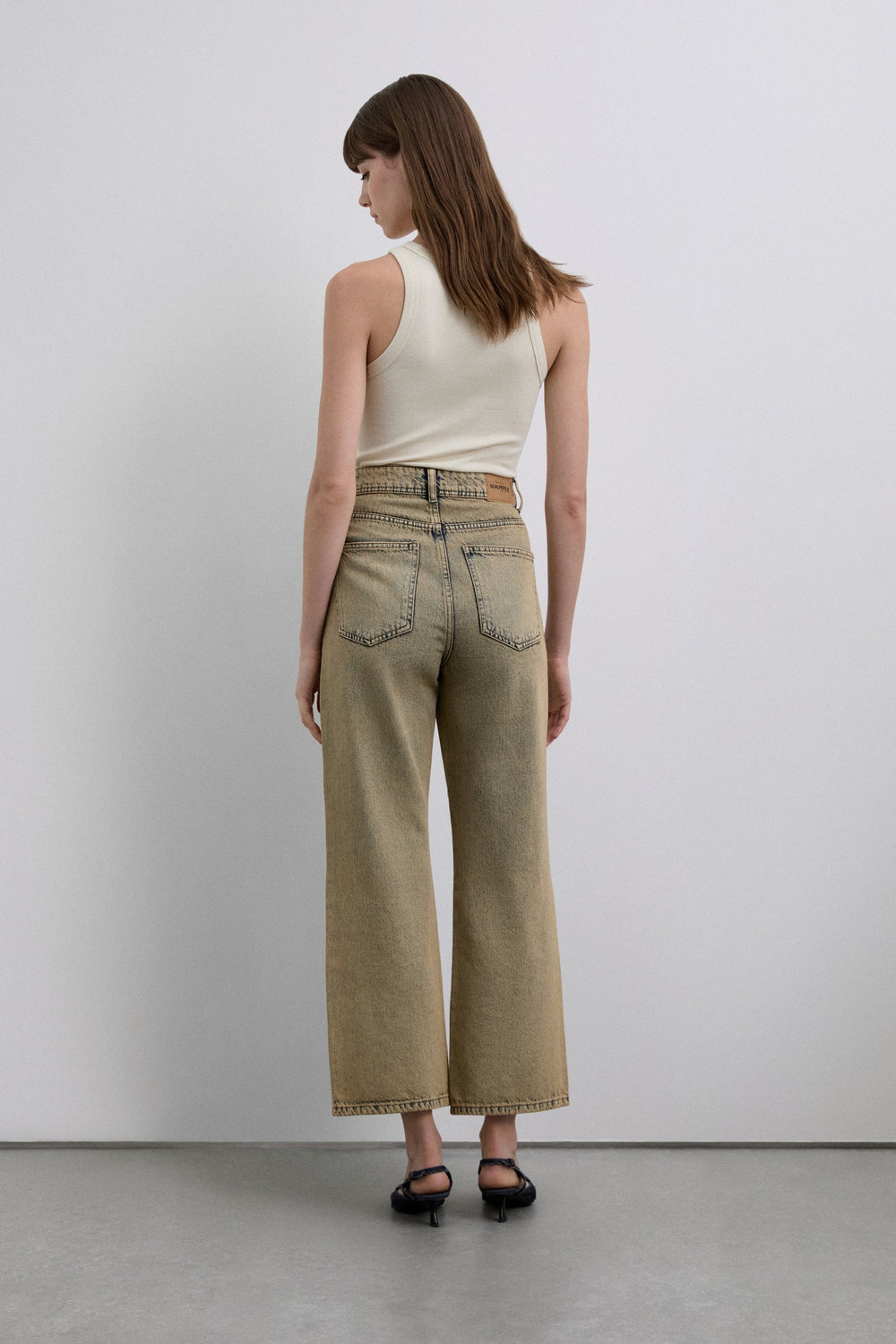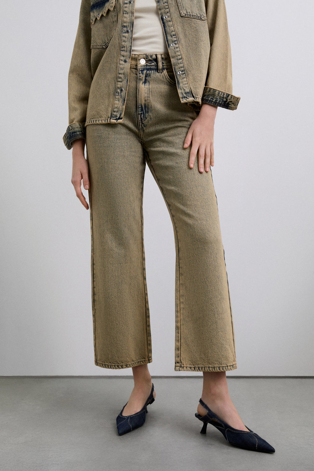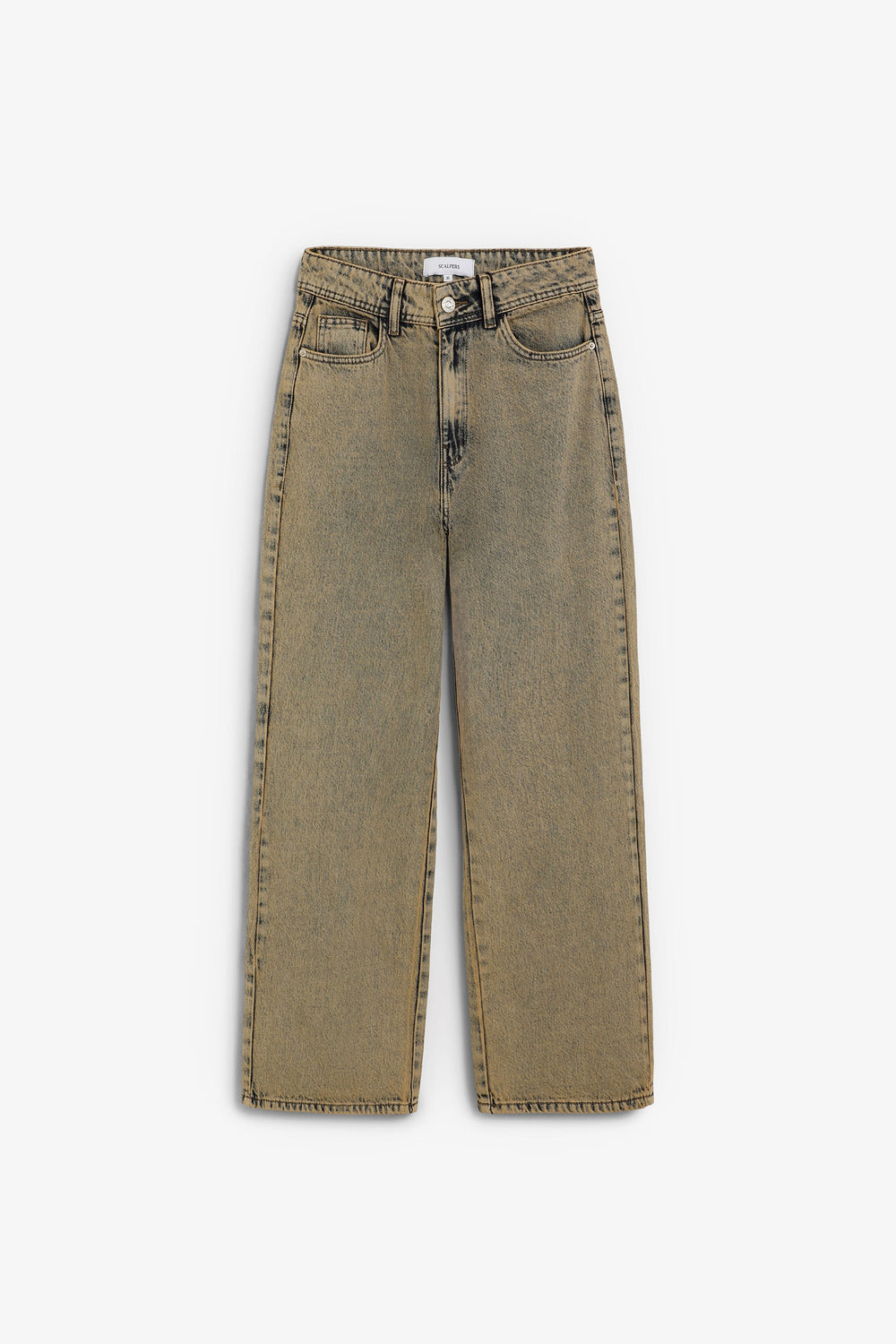Trousers made of 100% cotton. High-rise jeans with belt loops. . Straight leg. Front zip and button fastening.