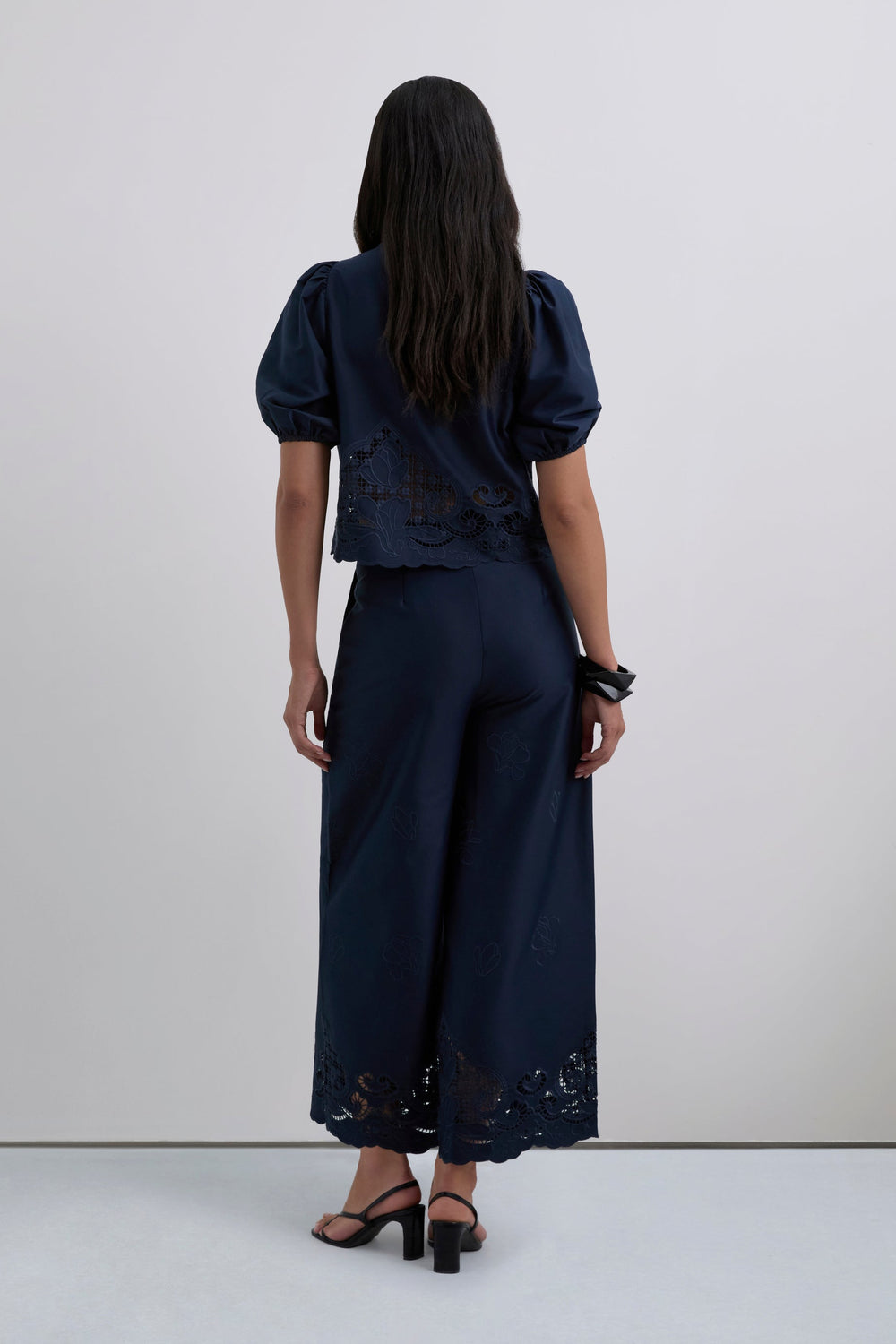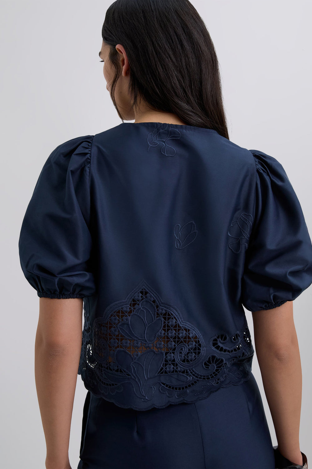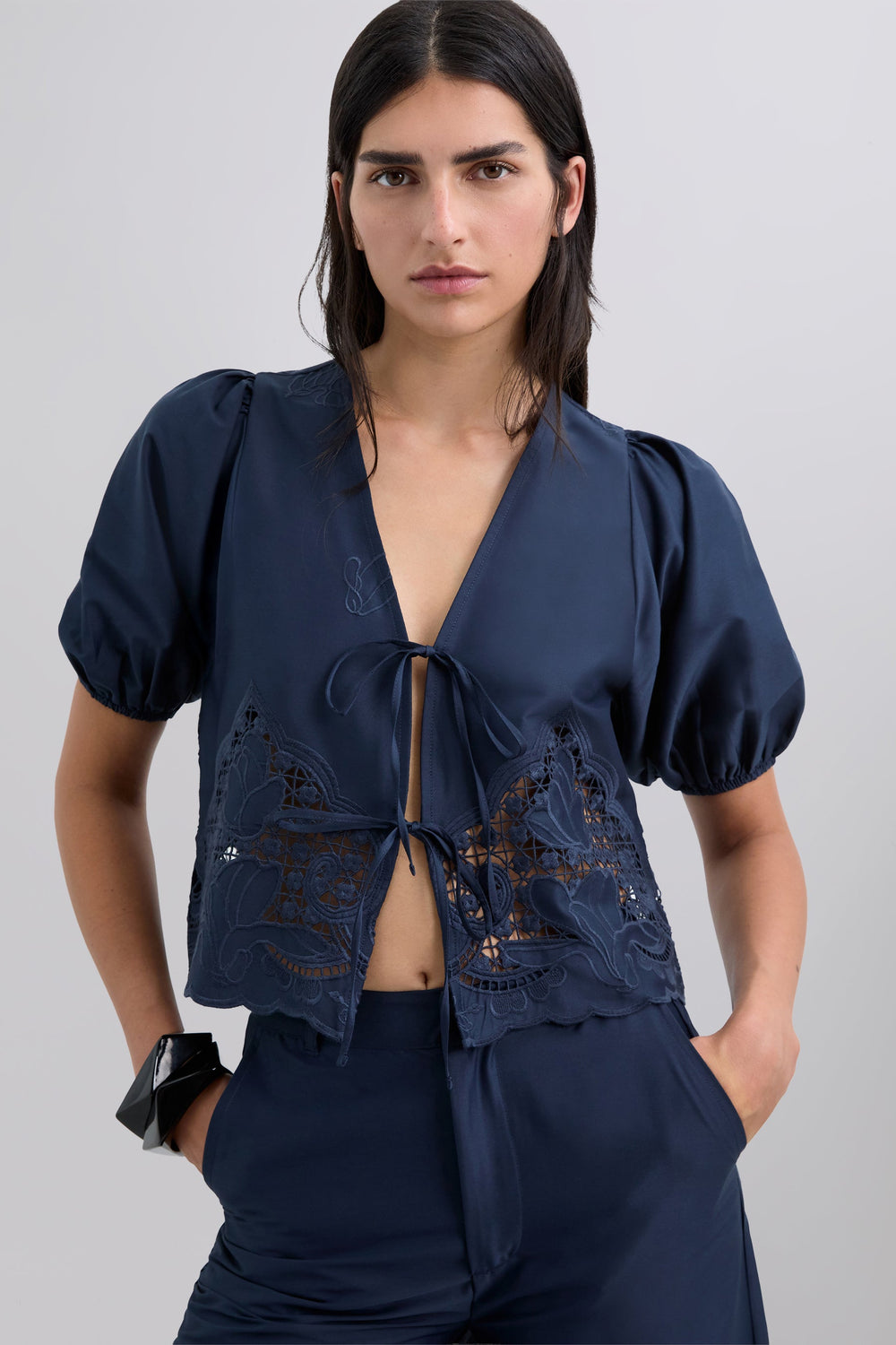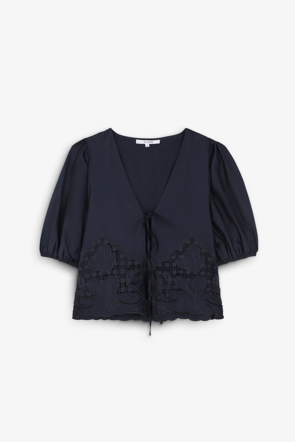 Short-sleeved blouse with slightly puffed sleeves and gathered cuffs. Fastens at front with ties. Openwork embroidery at the bottom.