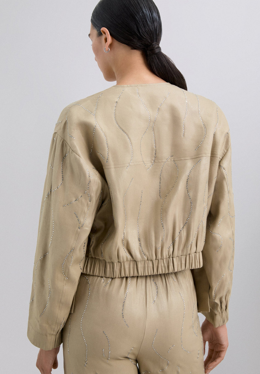 Bomber jacket with rhinestone detailing. Front zip and button fastening. Round neck. Gathered cuffs and hem. Flowing fabric with satin finish. Elasticated waistband with side tie details.