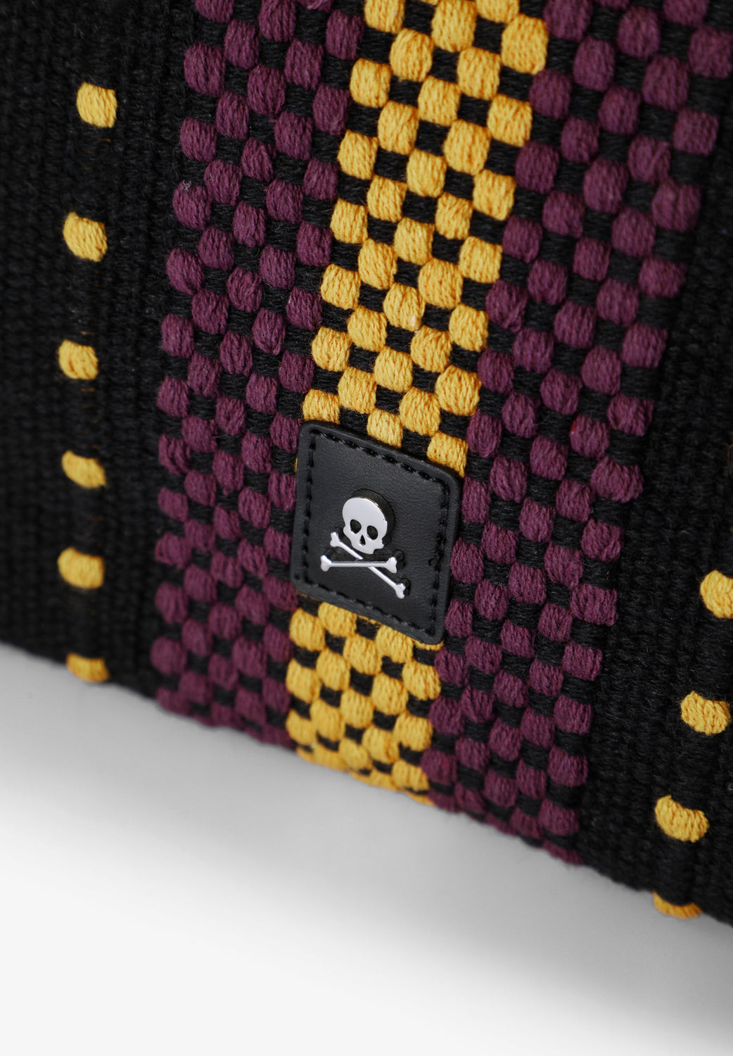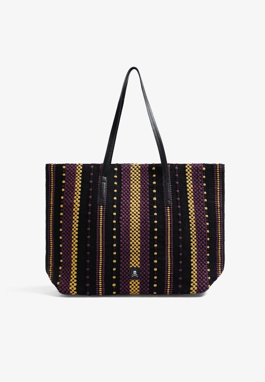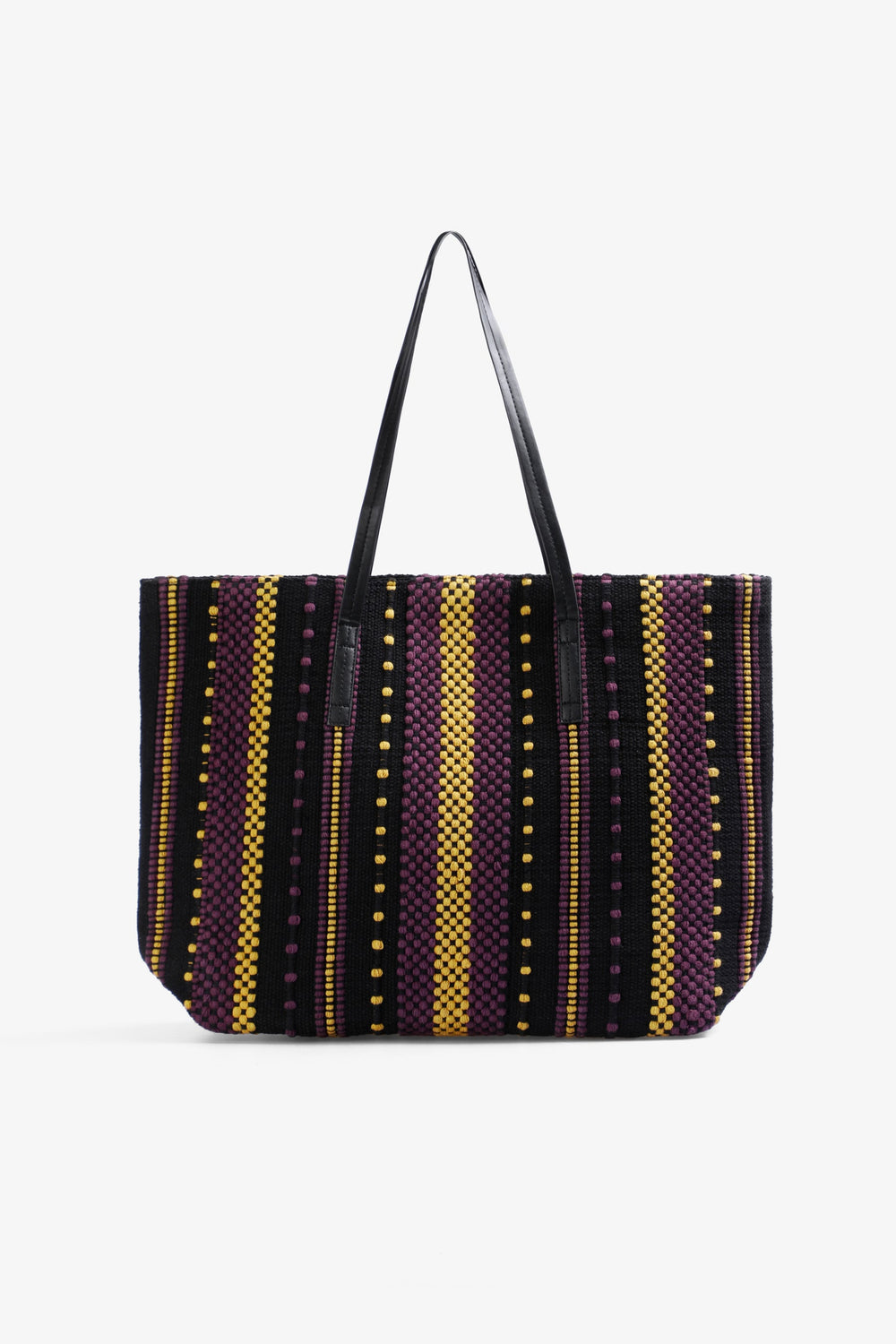 Shopper bag made of 100% organic cotton with ethnic print. Inner lining with pocket. Magnetic button fastening and logo patch detail on front.