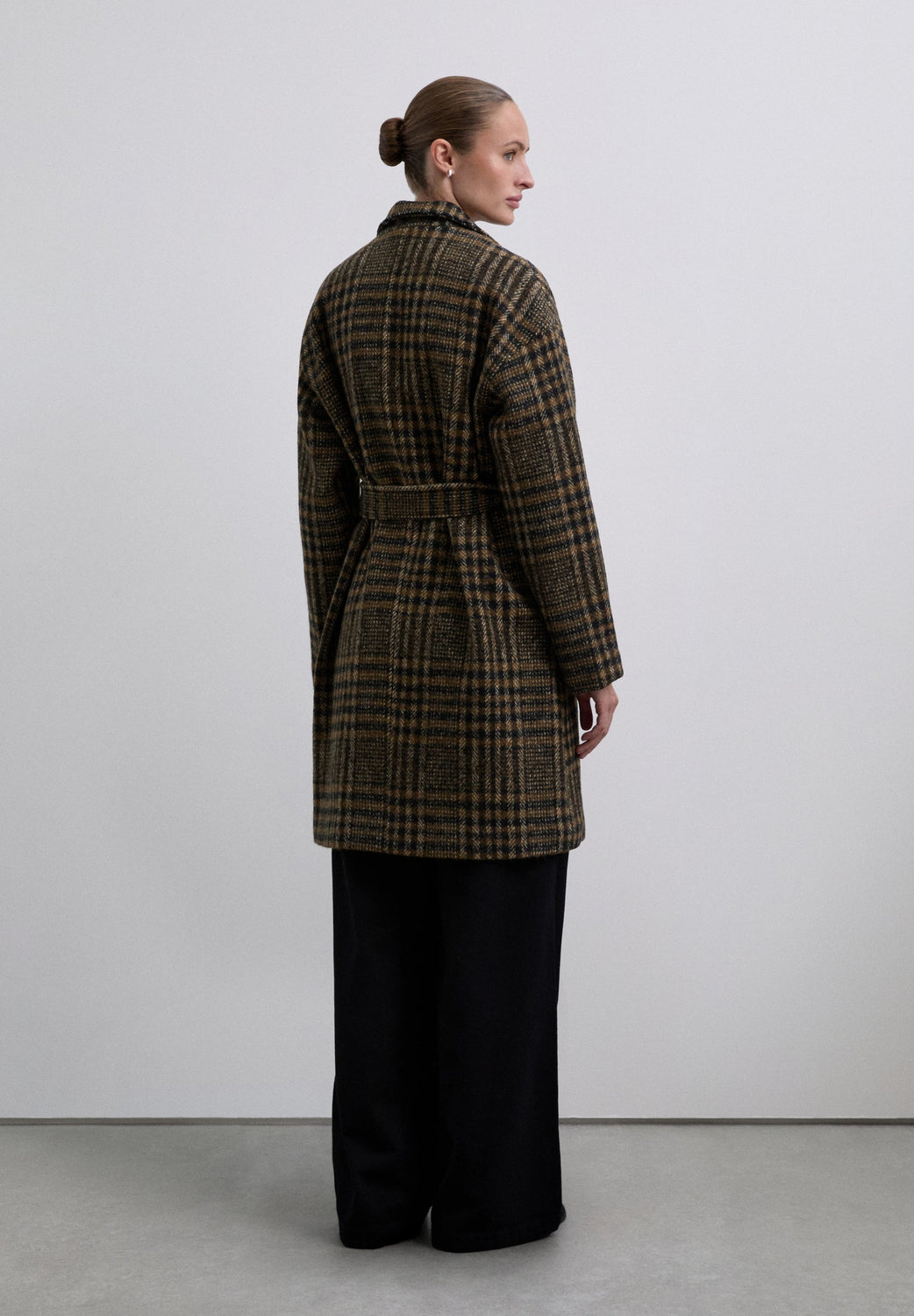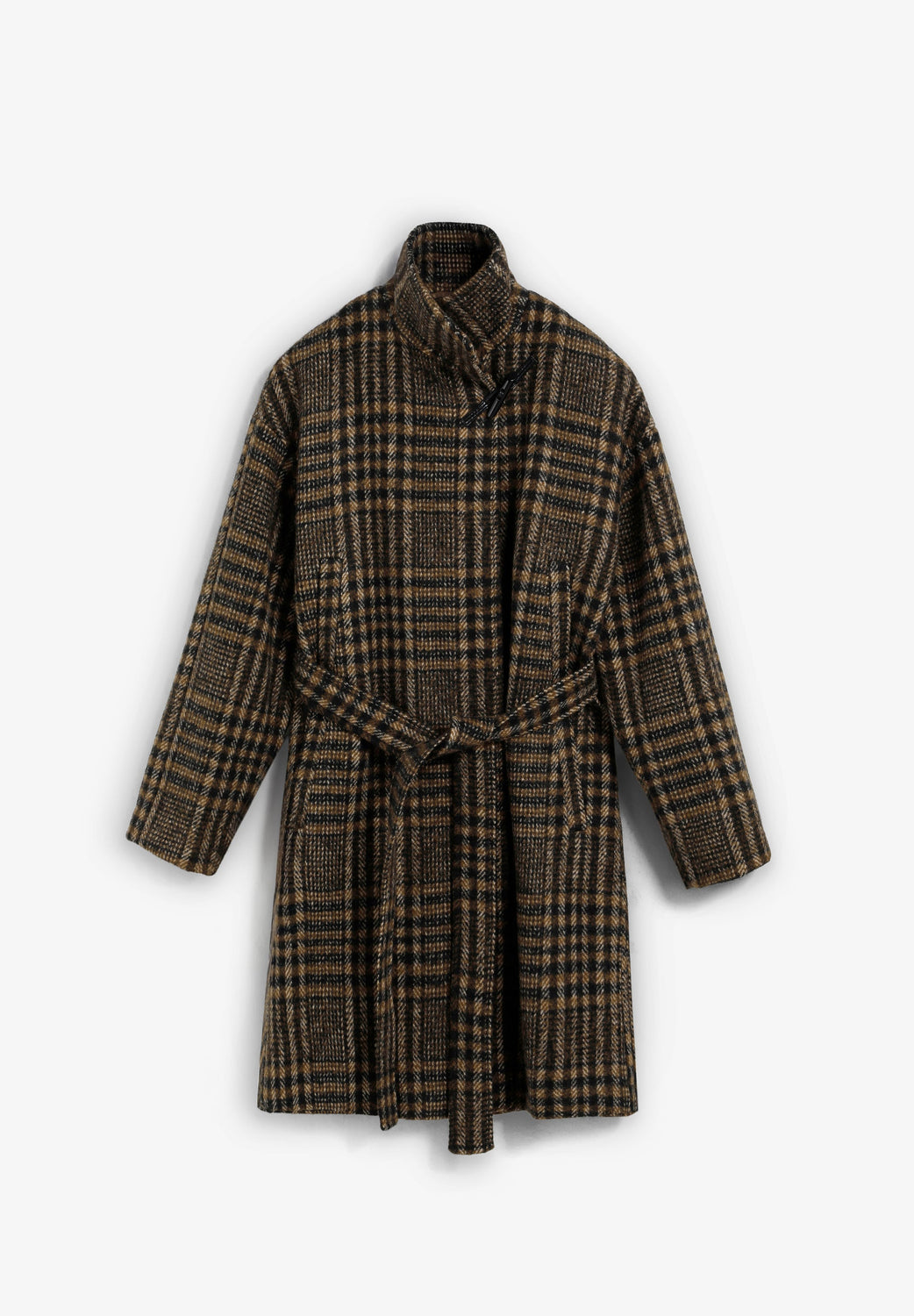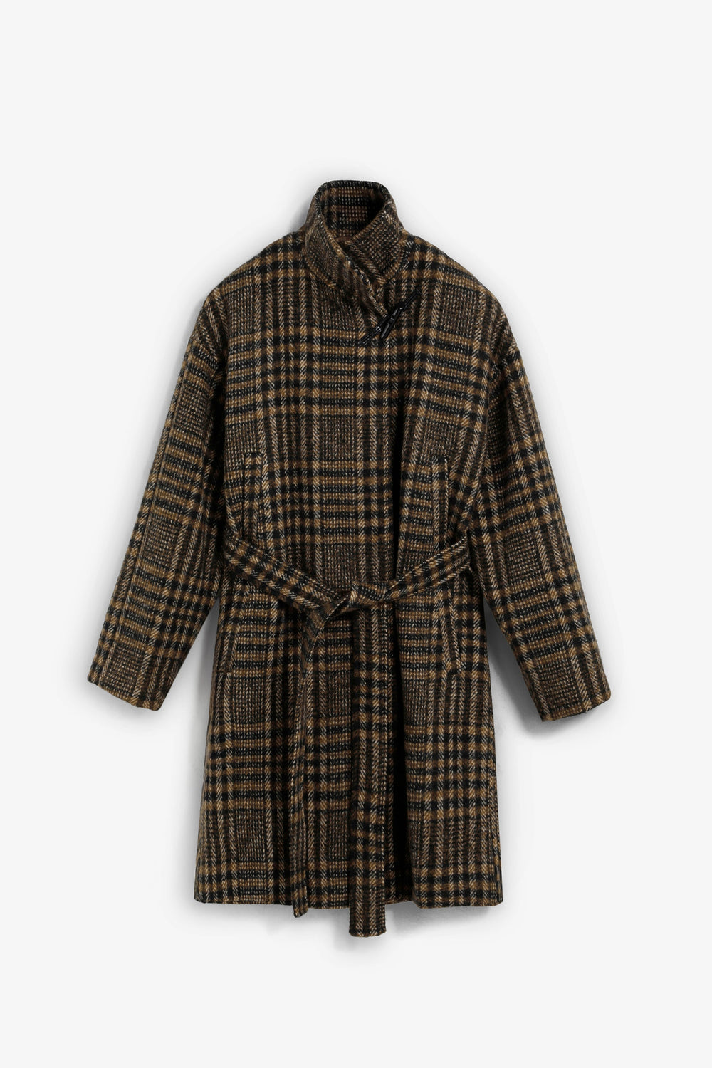 Cropped coat made of wool. Straight stand-up collar. Toggle style button at the top. Inner fastening with 2 buttons and outer fastening with adjustable belt. Long sleeves with turn-back cuffs.