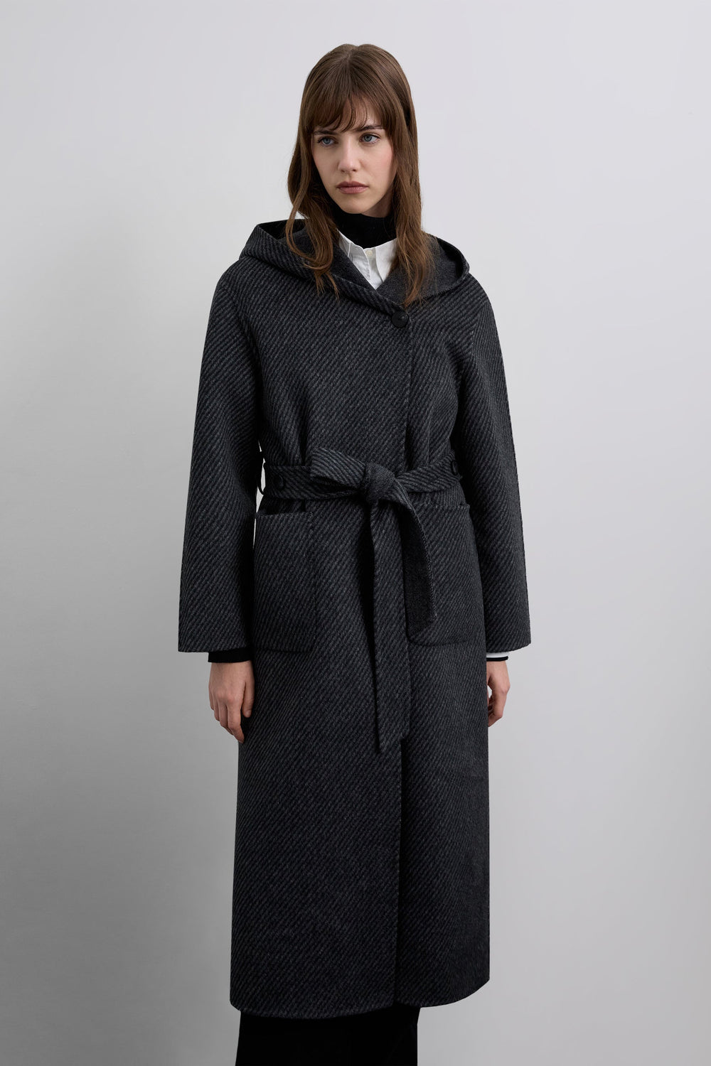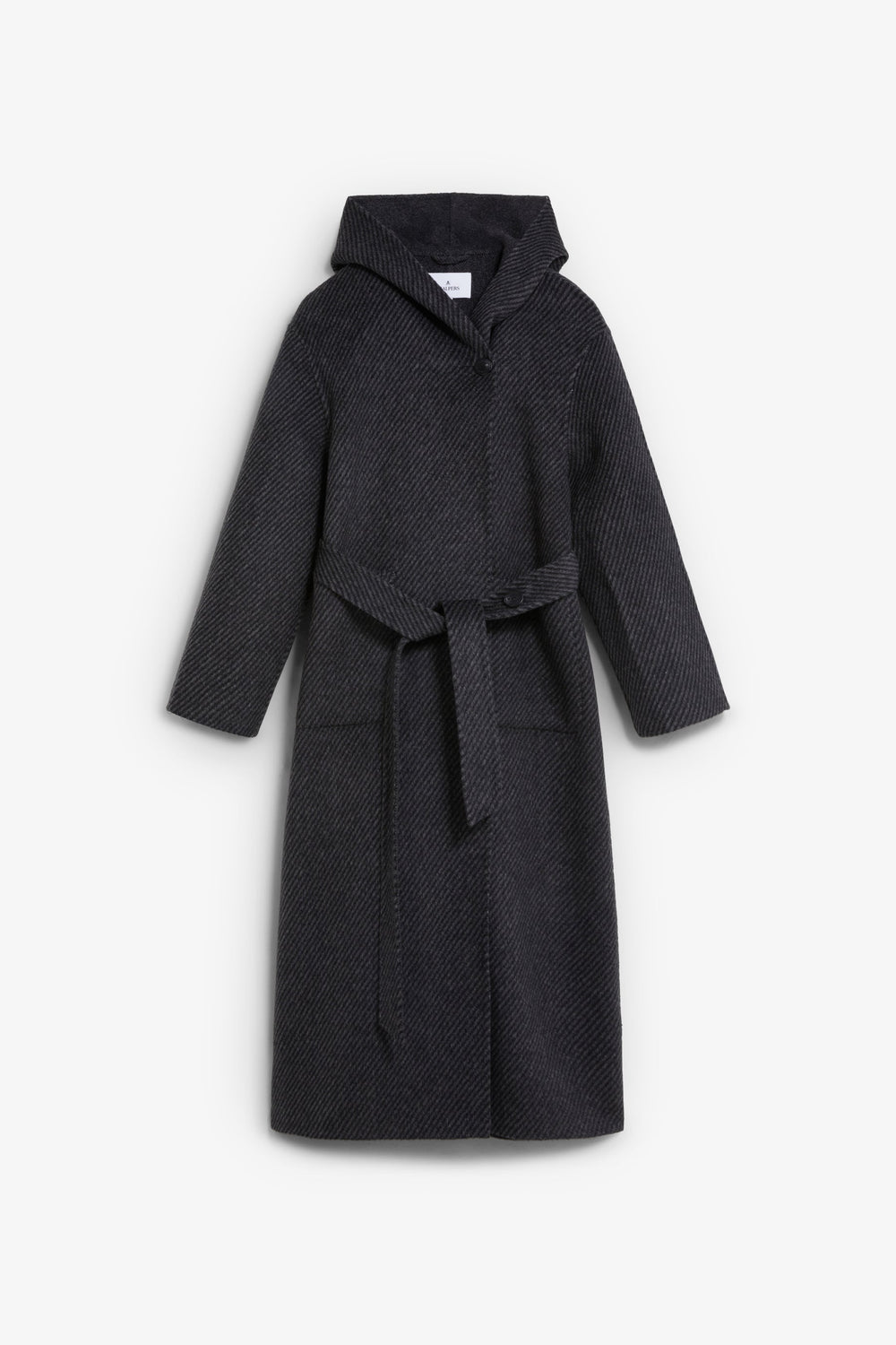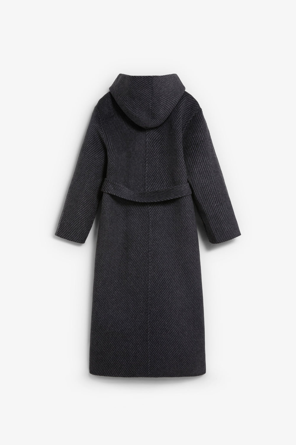 Long hooded coat made of a wool blend. Diagonal stripe on exterior. Two front pockets. Belt fastening.