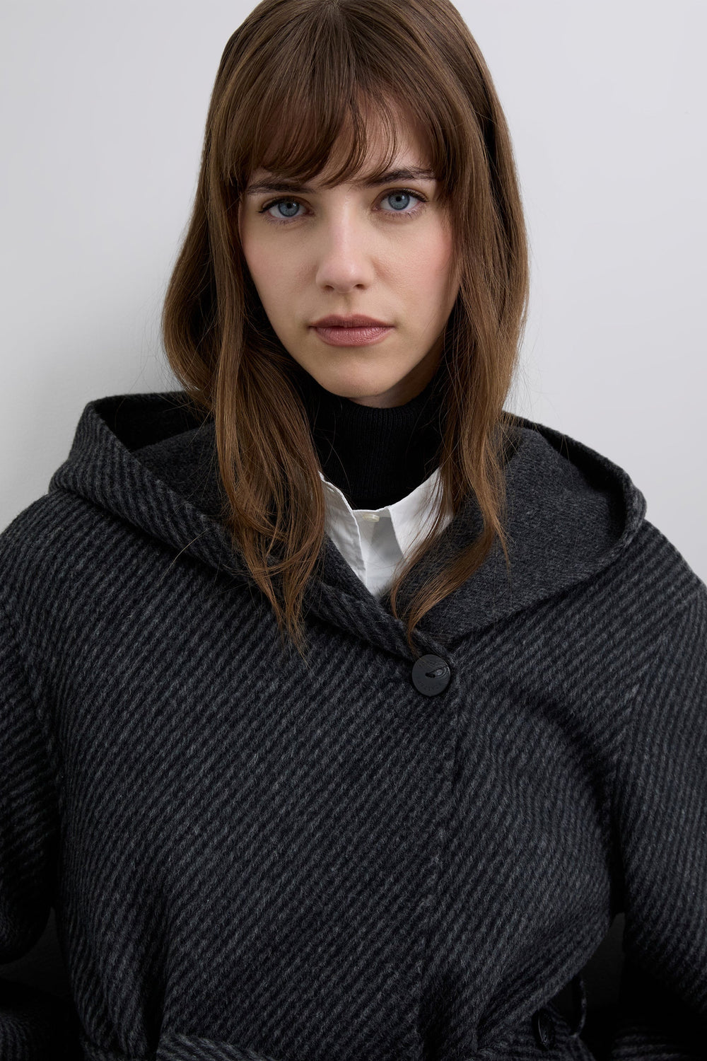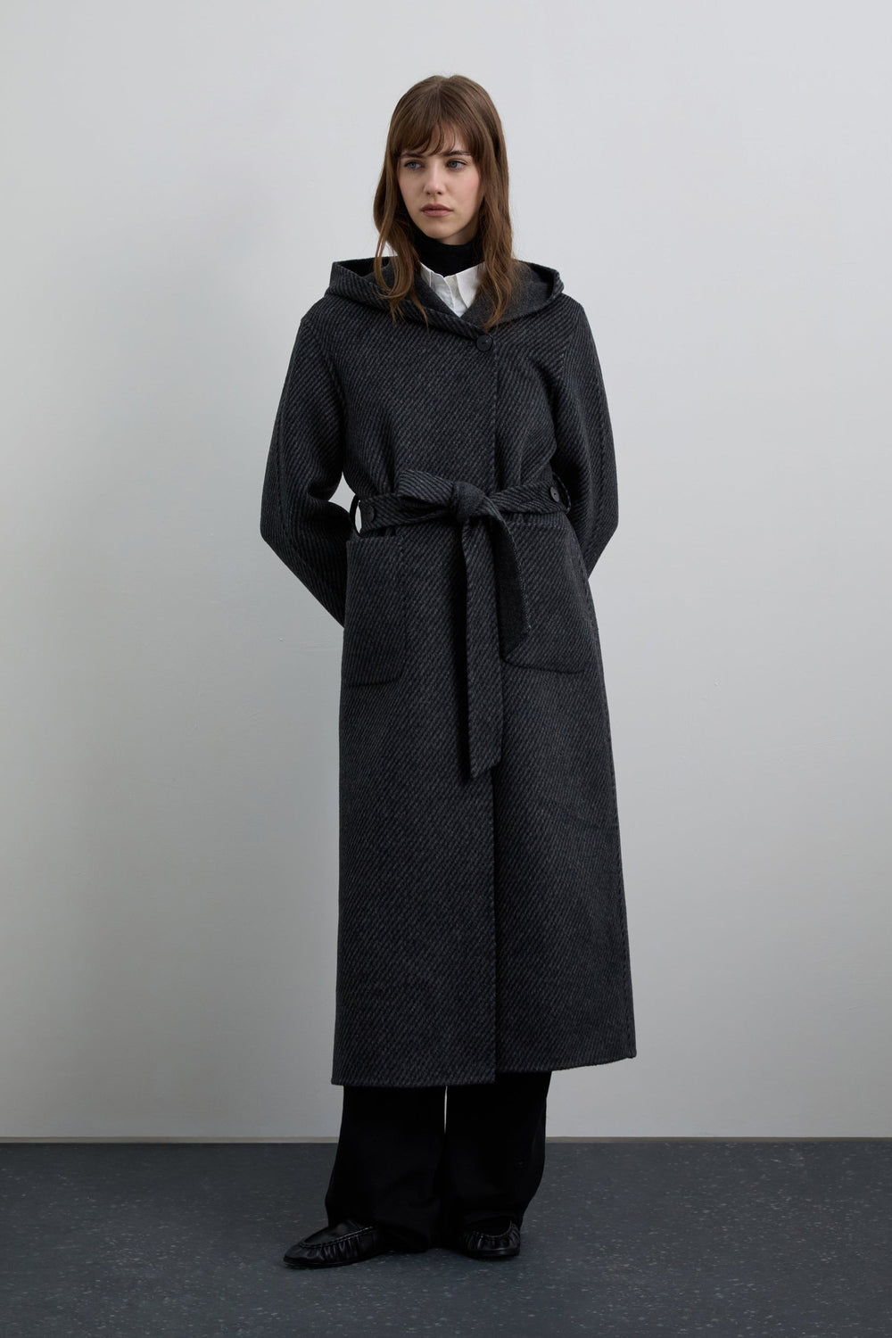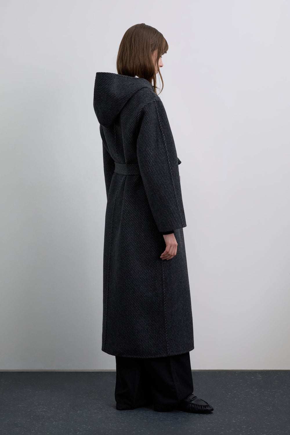 Long hooded coat made of a wool blend. Diagonal stripe on exterior. Two front pockets. Belt fastening.