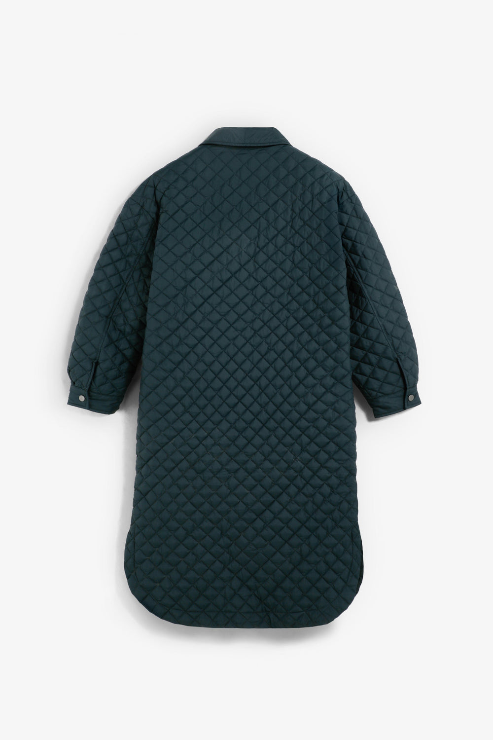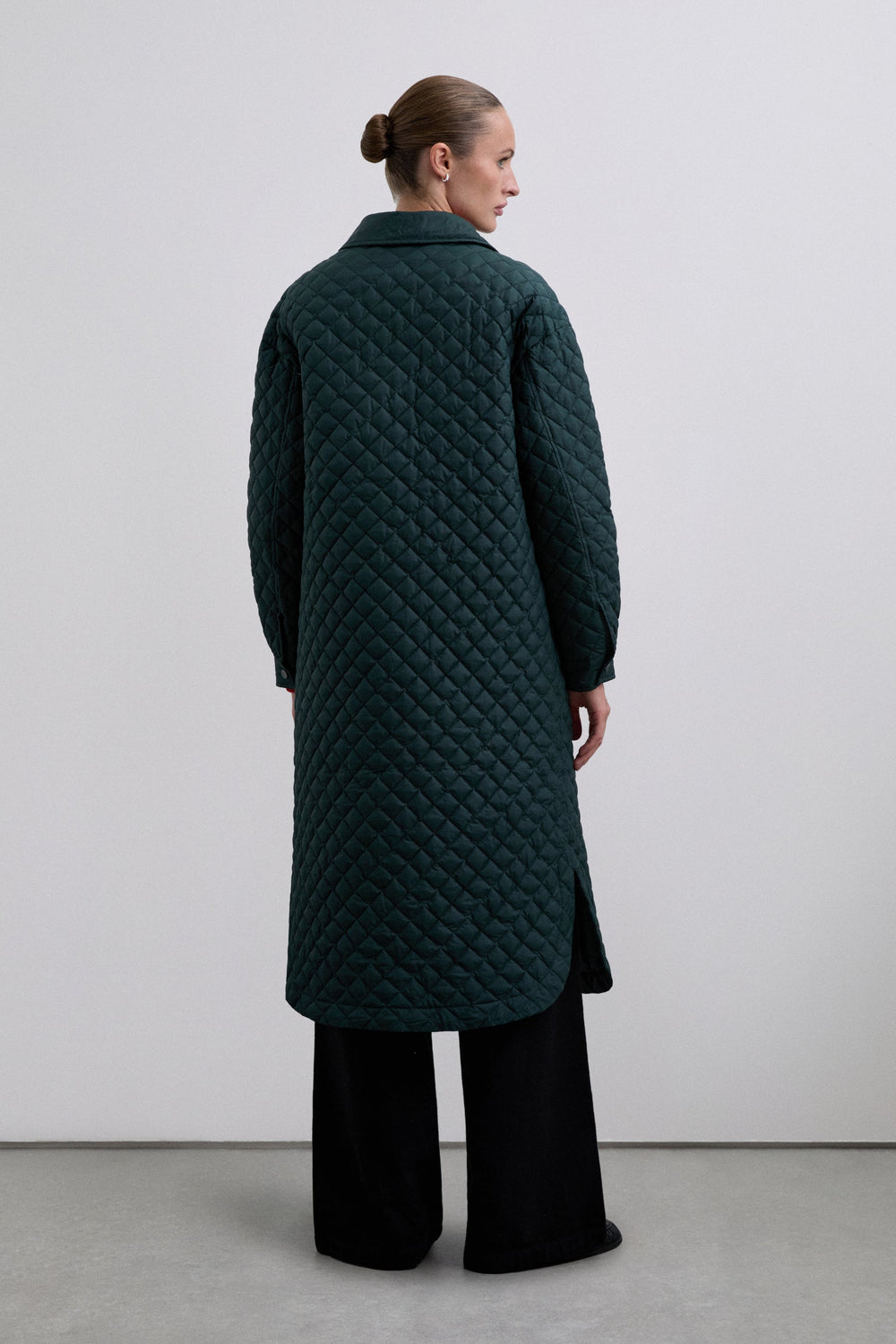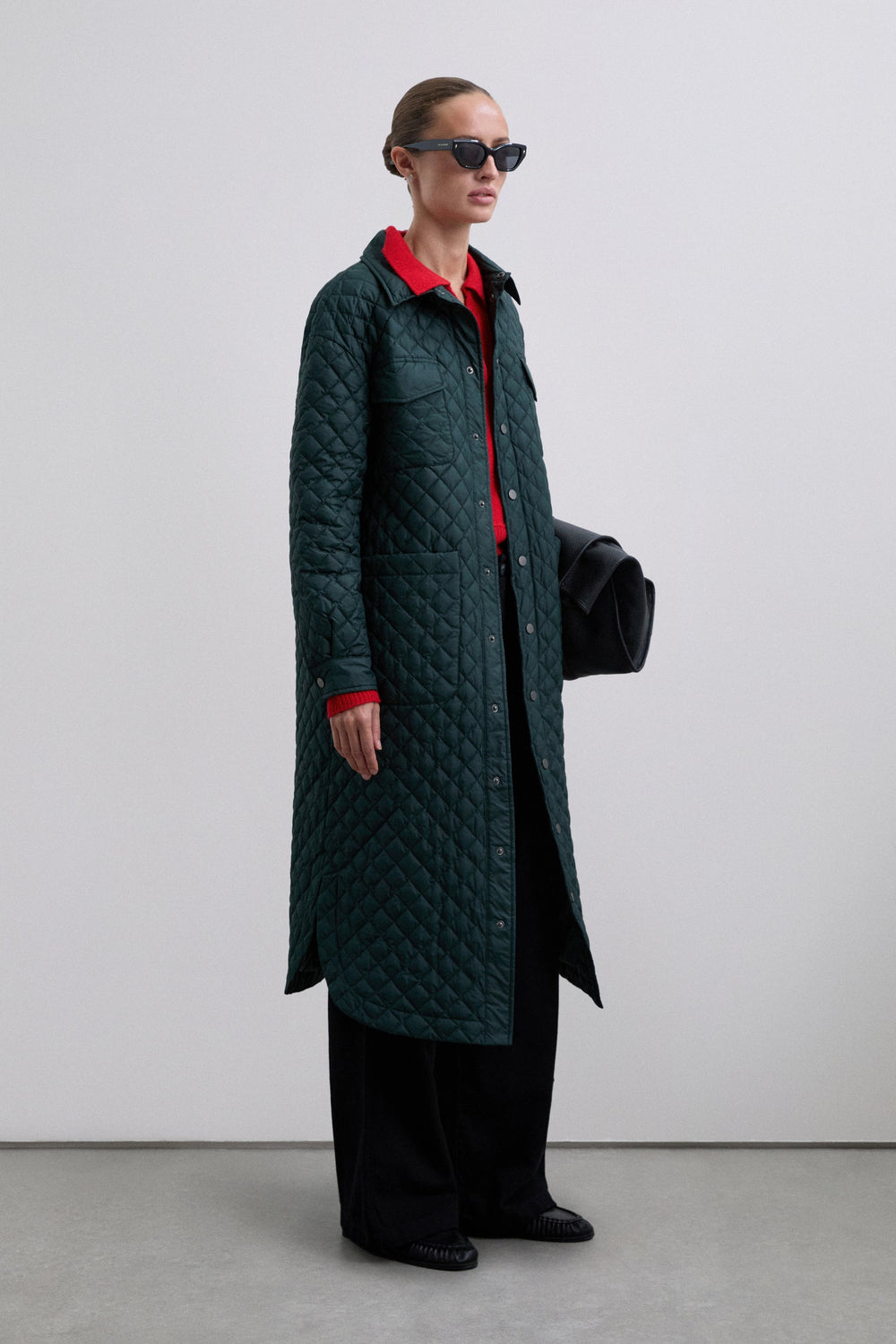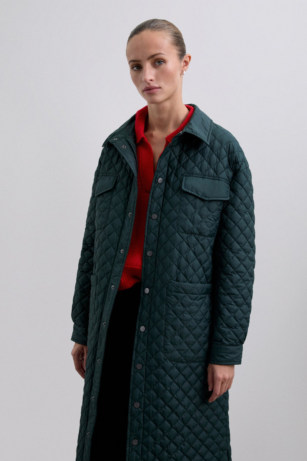 Quilted waterproof puffer coat with small diamond-shaped stitching. Long sleeves. Detachable high collar. Four front pockets: two lower and two upper flap pockets.