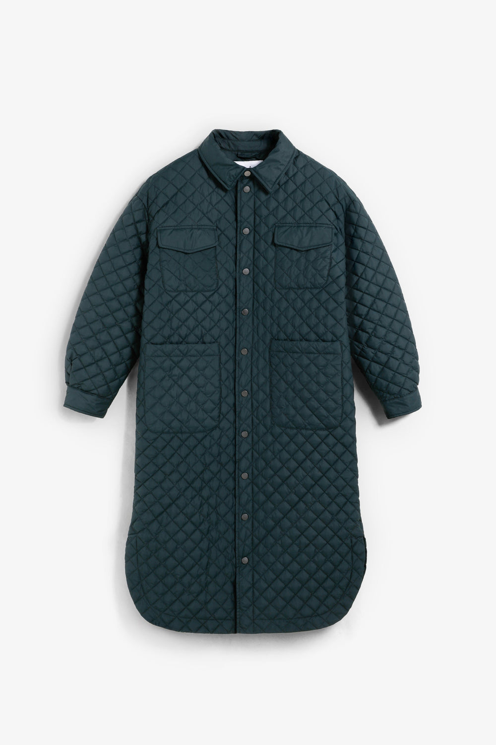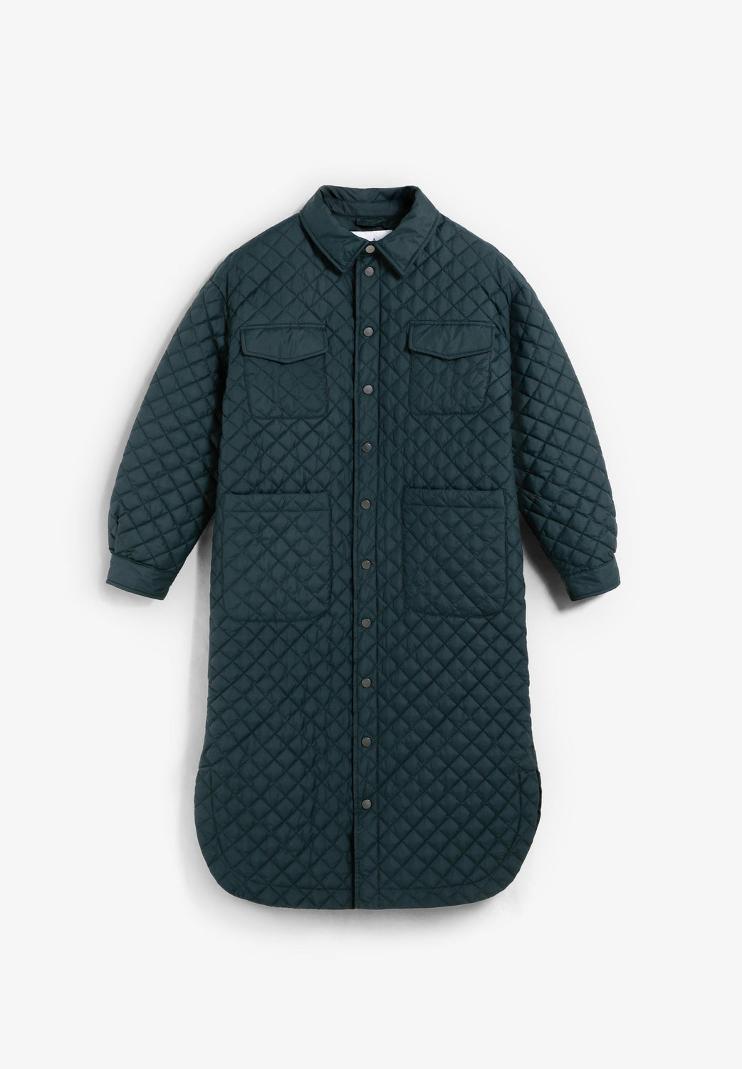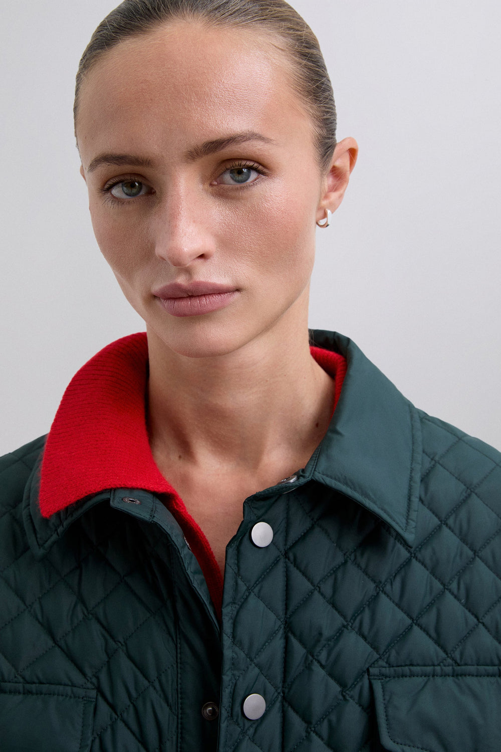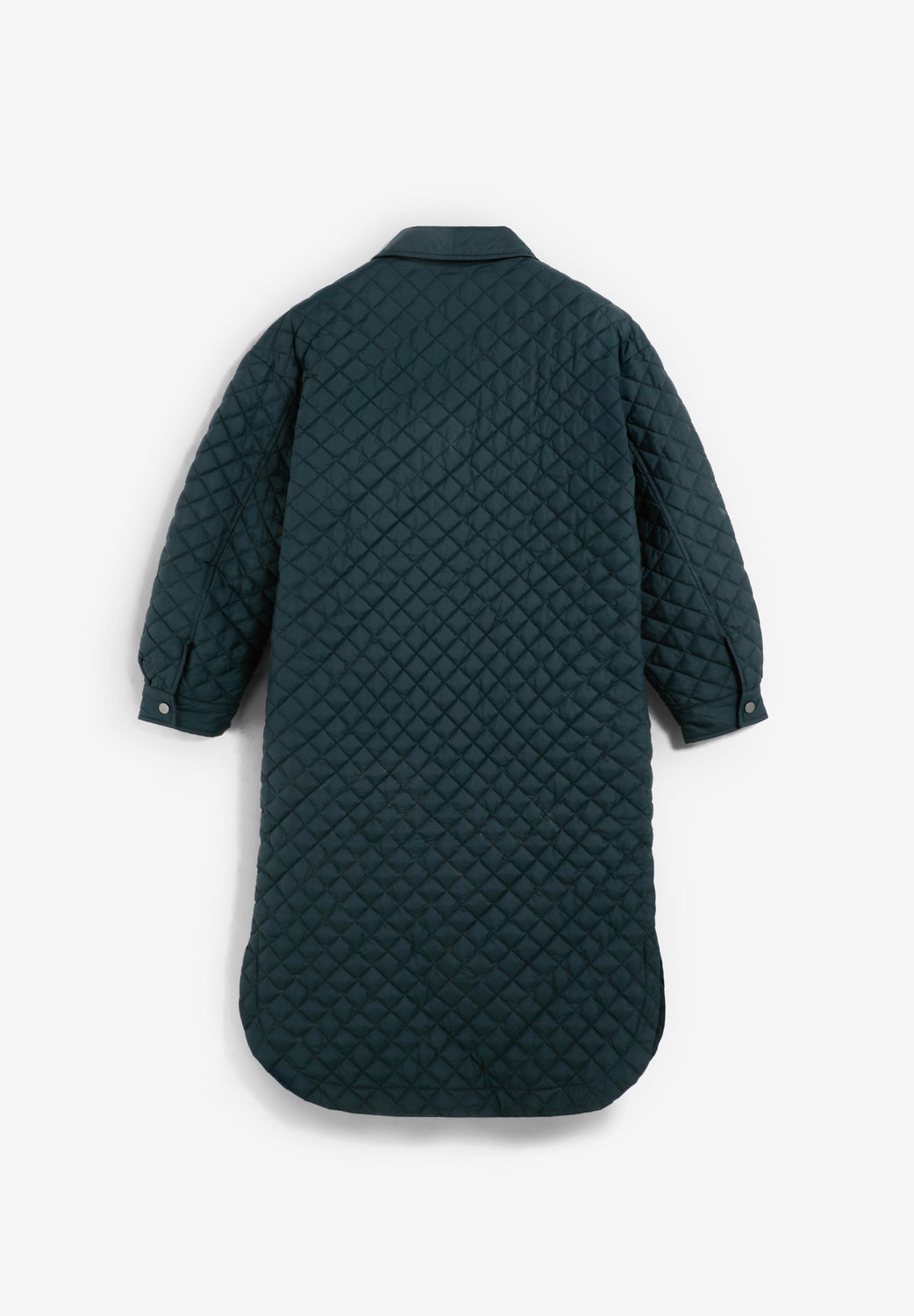 Quilted waterproof puffer coat with small diamond-shaped stitching. Long sleeves. Detachable high collar. Four front pockets: two lower and two upper flap pockets.