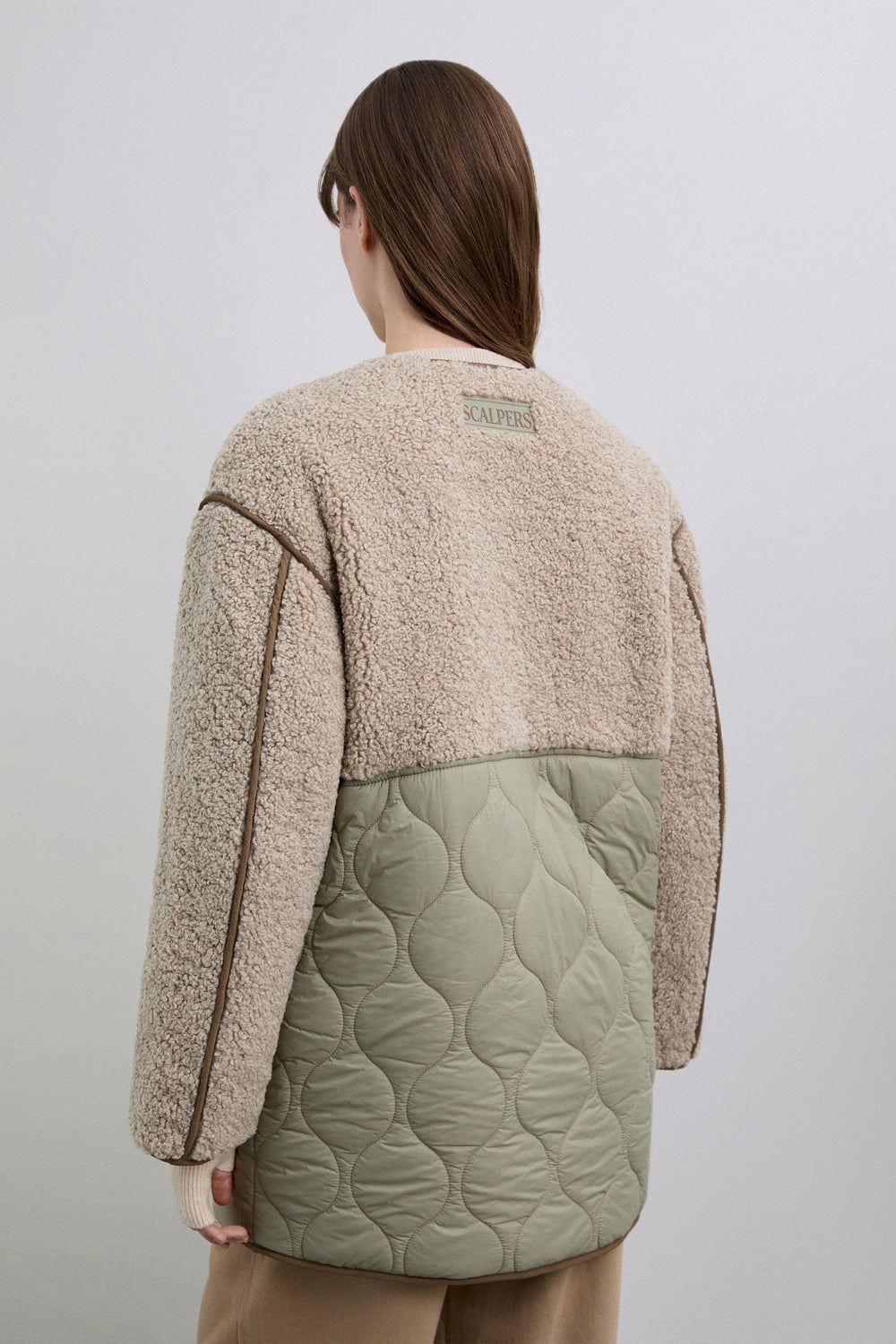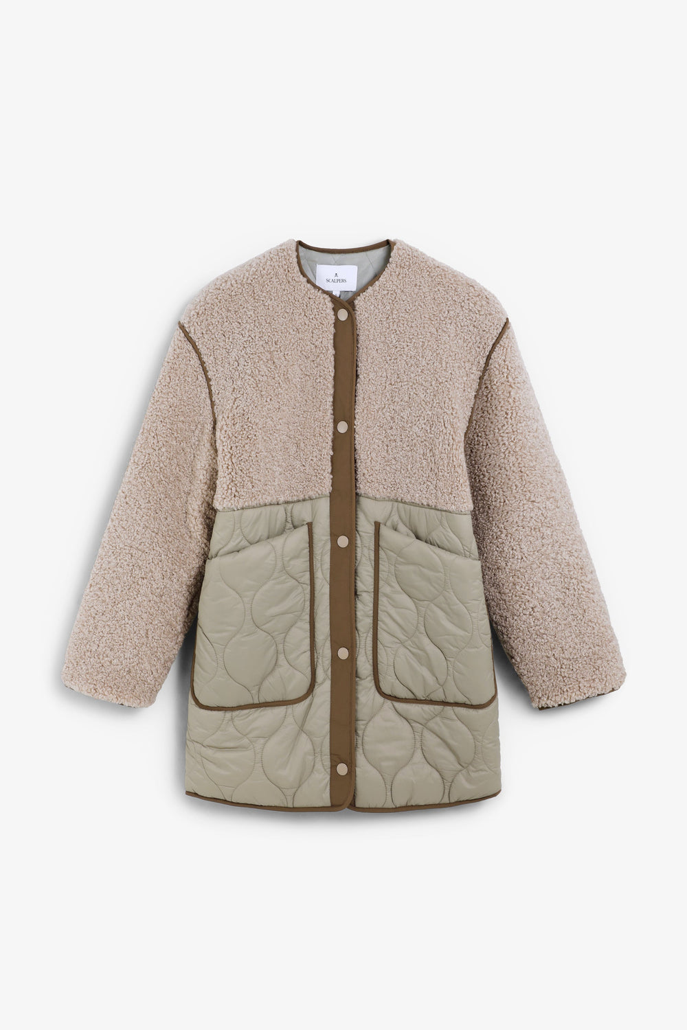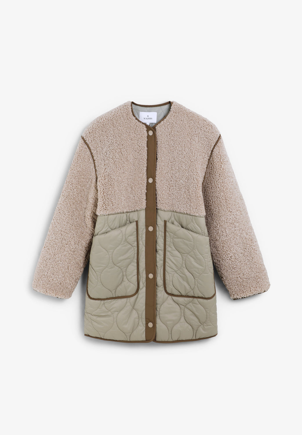 Coat made with synthetic sheepskin at the top with quilted nylon lower part featuring two large pockets. Front button fastening. Rubberised logo patch detail on the back.