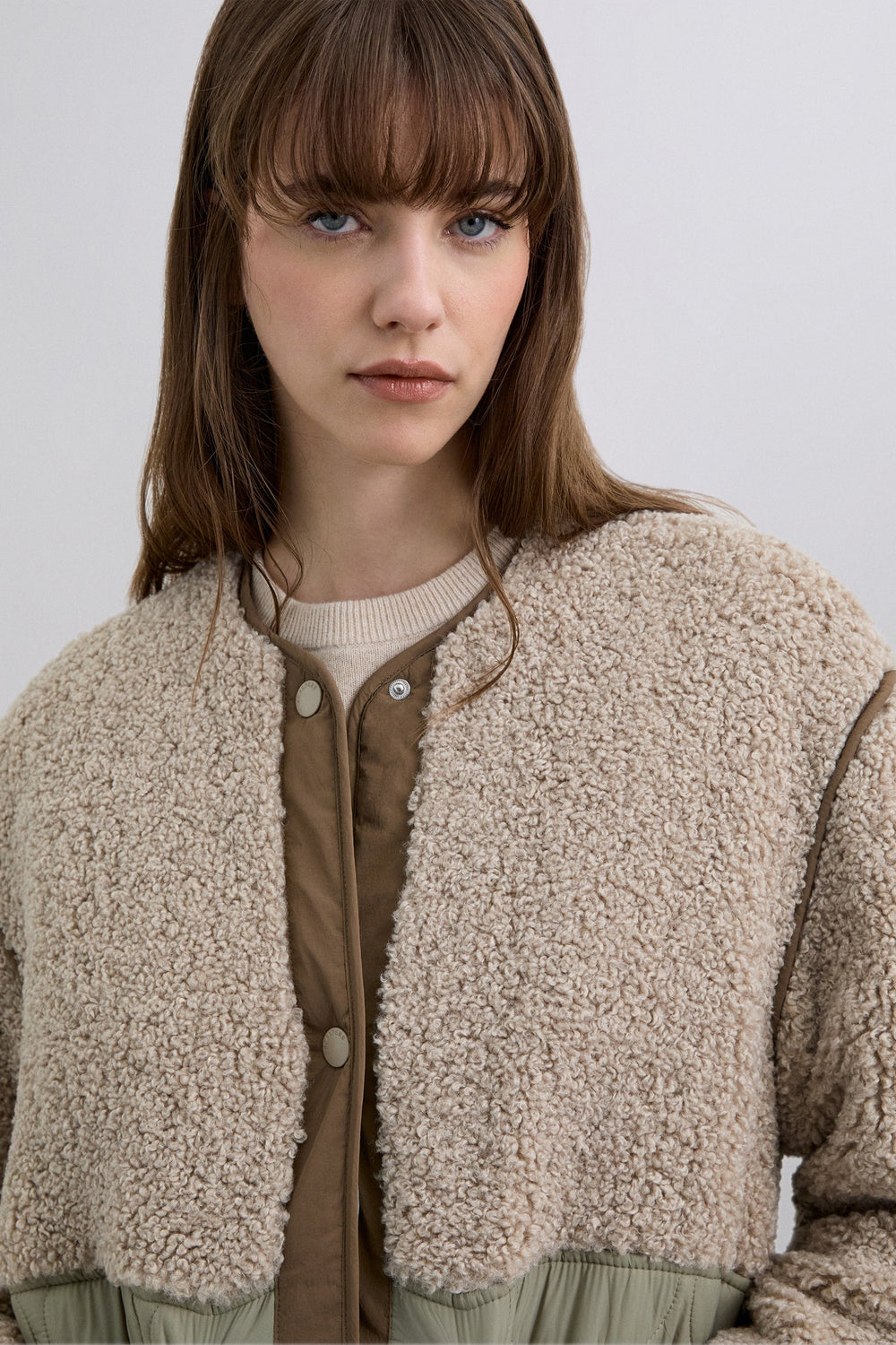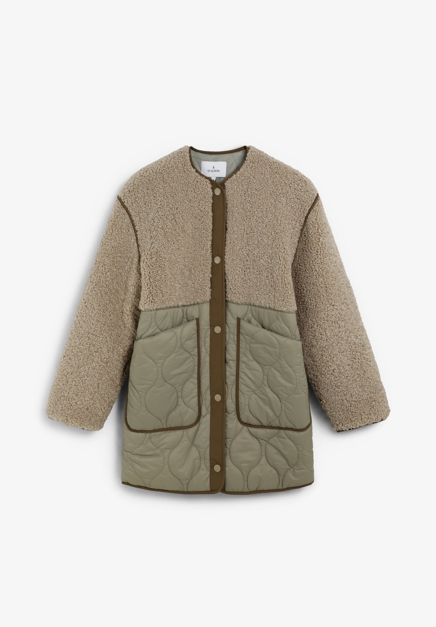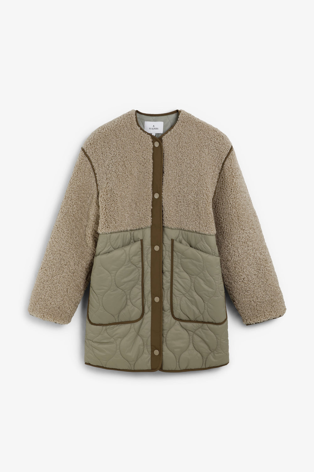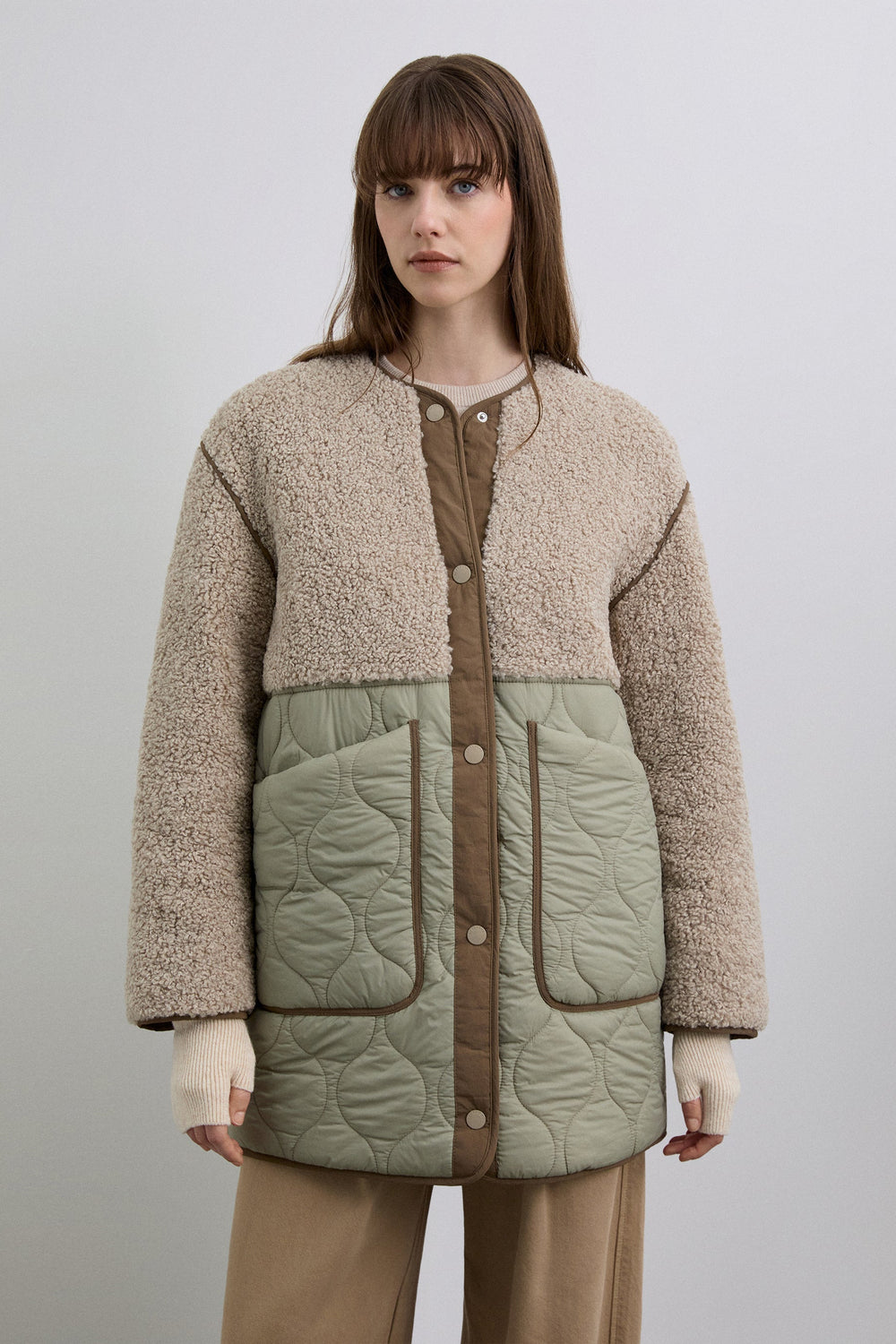 Coat made with synthetic sheepskin at the top with quilted nylon lower part featuring two large pockets. Front button fastening. Rubberised logo patch detail on the back.