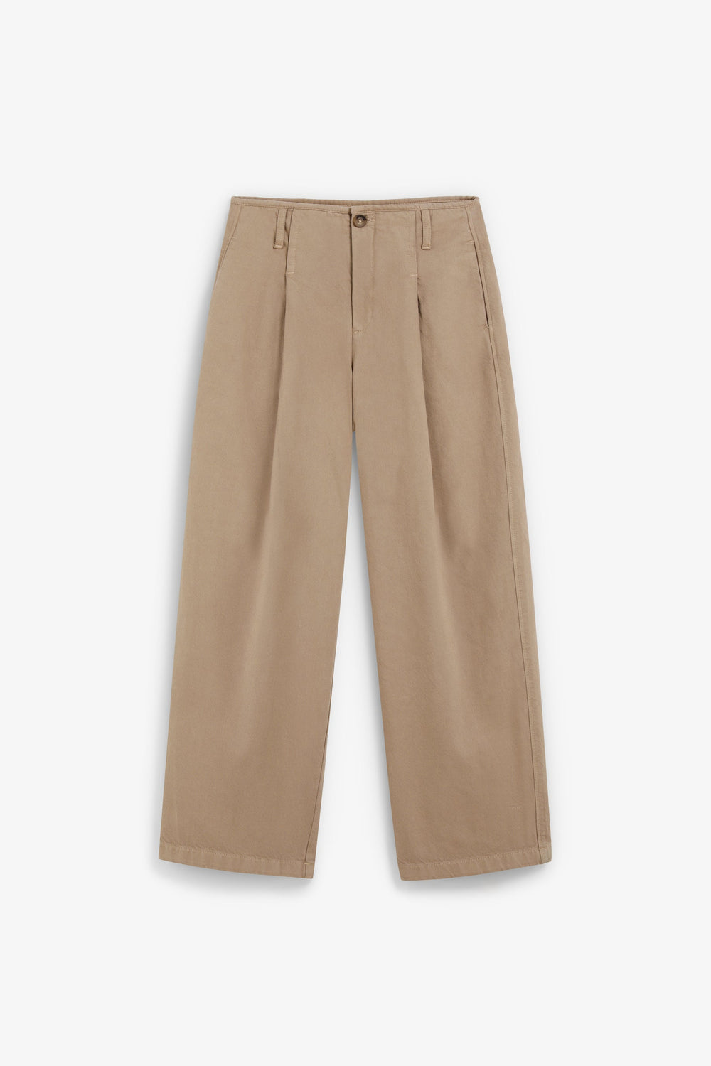 Trousers made of 100% cotton. Wide-leg trousers, designed with a wide, loose-fit from hip to ankle. Button and zip fastening. Belt loops.