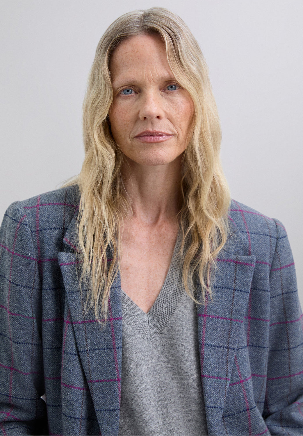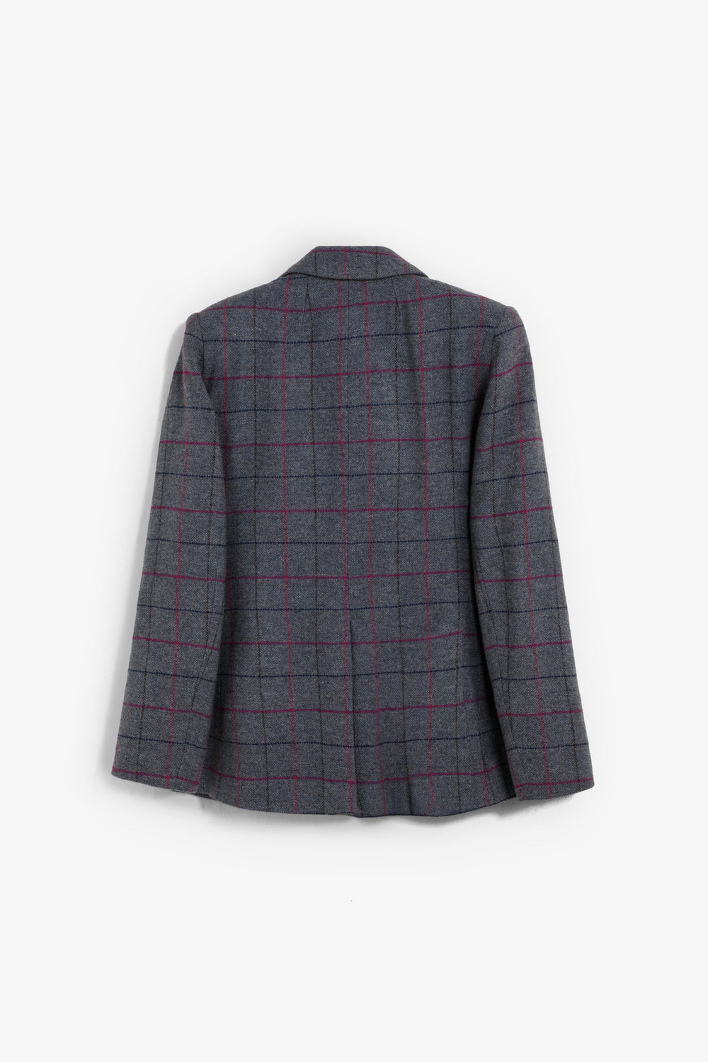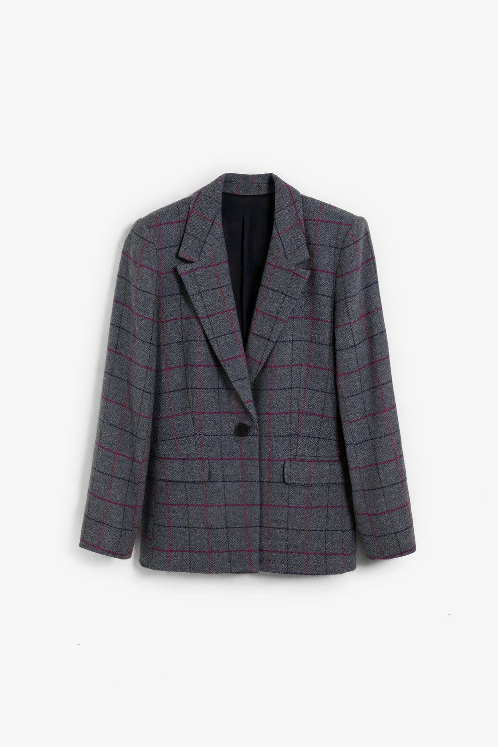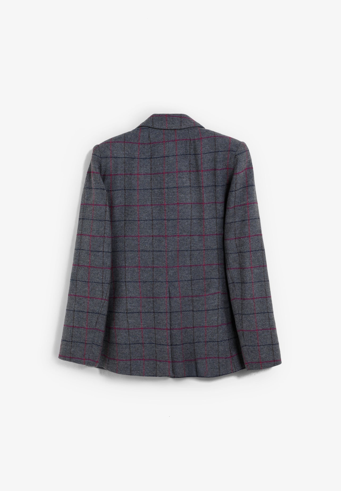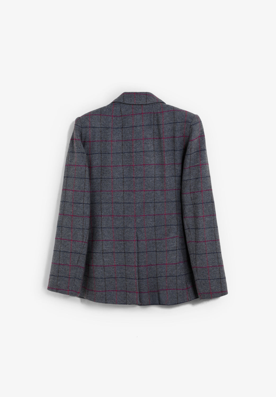 Blazer made of wool. Check print. Textured shoulder pads. Front button fastening. Two back pockets with flaps.