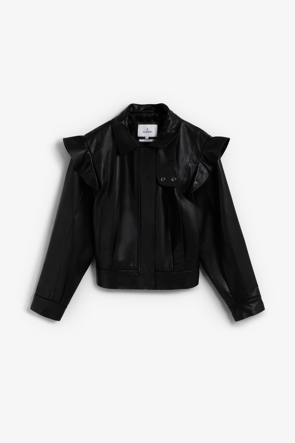 Biker-style jacket made of 100% leather. Regular fit. High collar with press stud fastening. Two side pockets. Ruffle detail around the armhole. Front zip and top button fastening. Long sleeves with snap button fastening on cuffs.