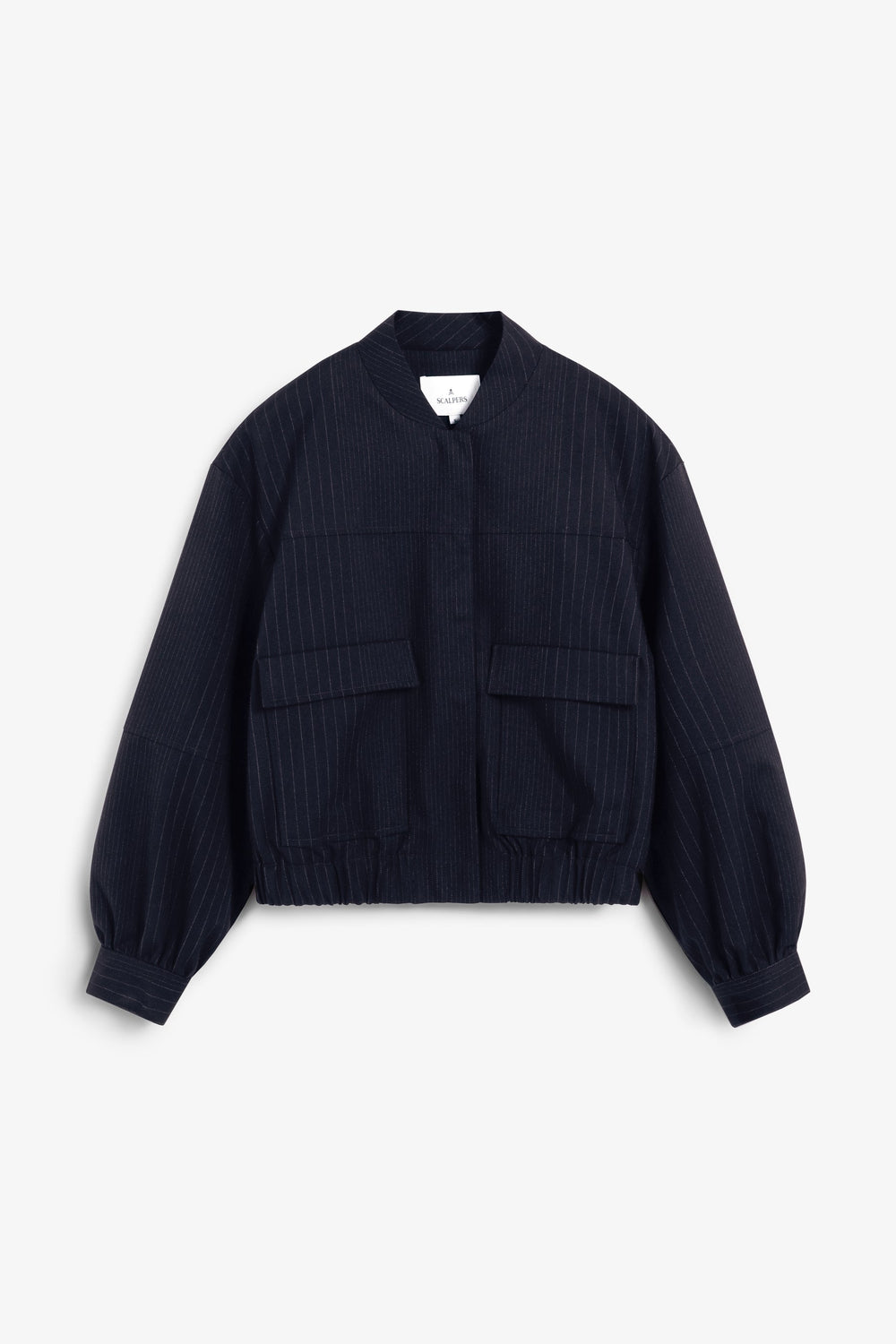 Pinstripe bomber jacket. Shirred stand-up collar. Long sleeves. Slightly stretchy waist. Front zip and button fastening. Two back pockets with flaps.