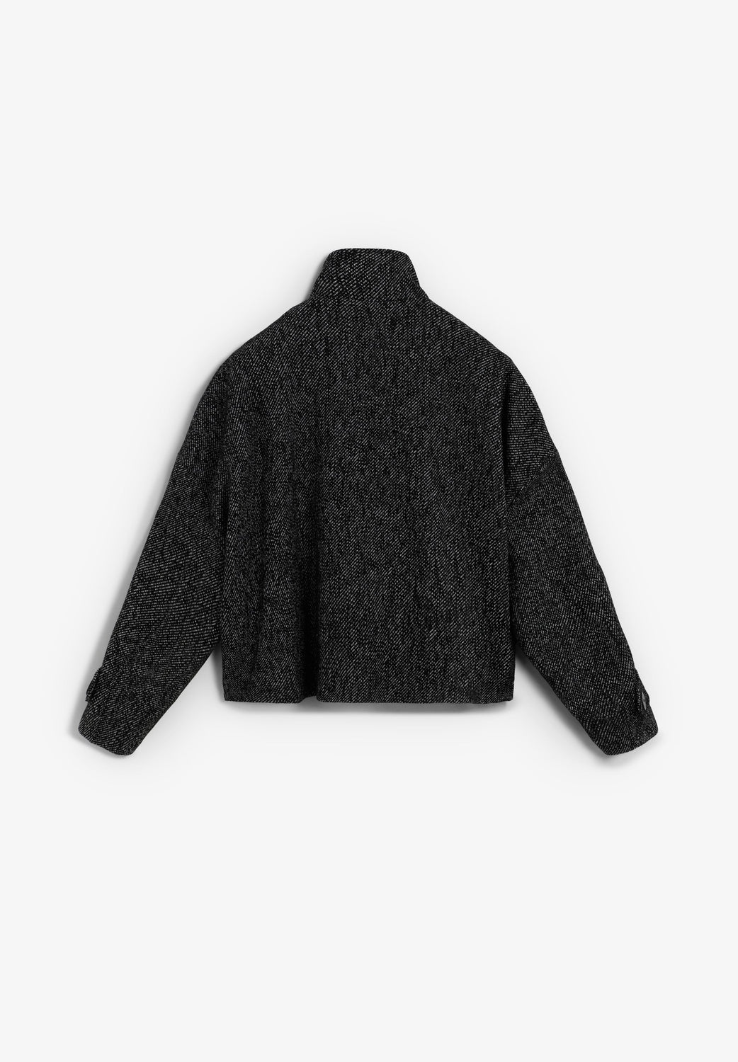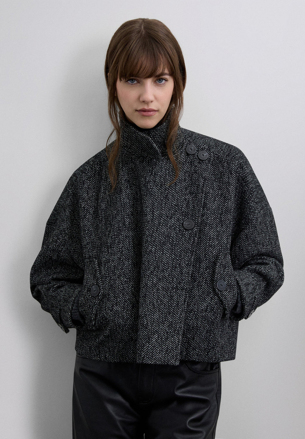 Double-breasted jacket made of a wool blend. Regular fit. Slightly cropped. High collar. Long sleeves. Side slanted flap pockets.