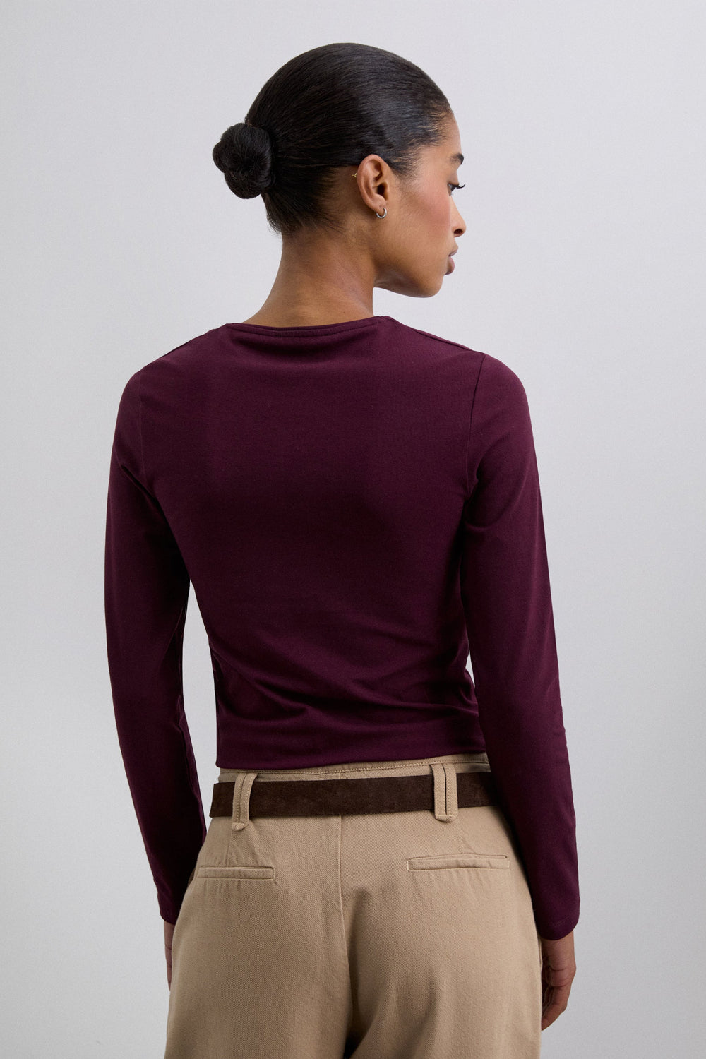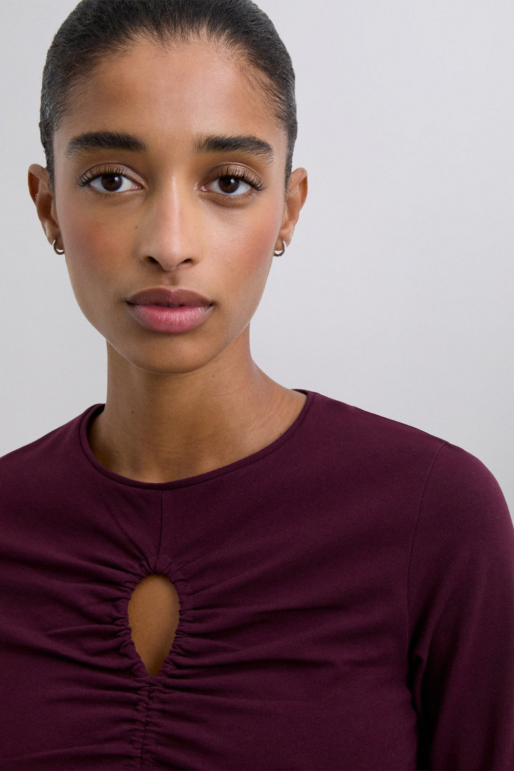 T-shirt made of slightly stretchy cotton fabric. Slim fit, round neck and long sleeves. Opening detail on the neckline and front gathers.