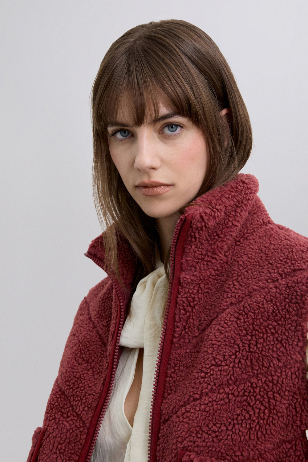 Fitted fleece gilet. Slim fit. Two front pockets. Adjustable drawstring hem. High collar. Front zip fastening.
