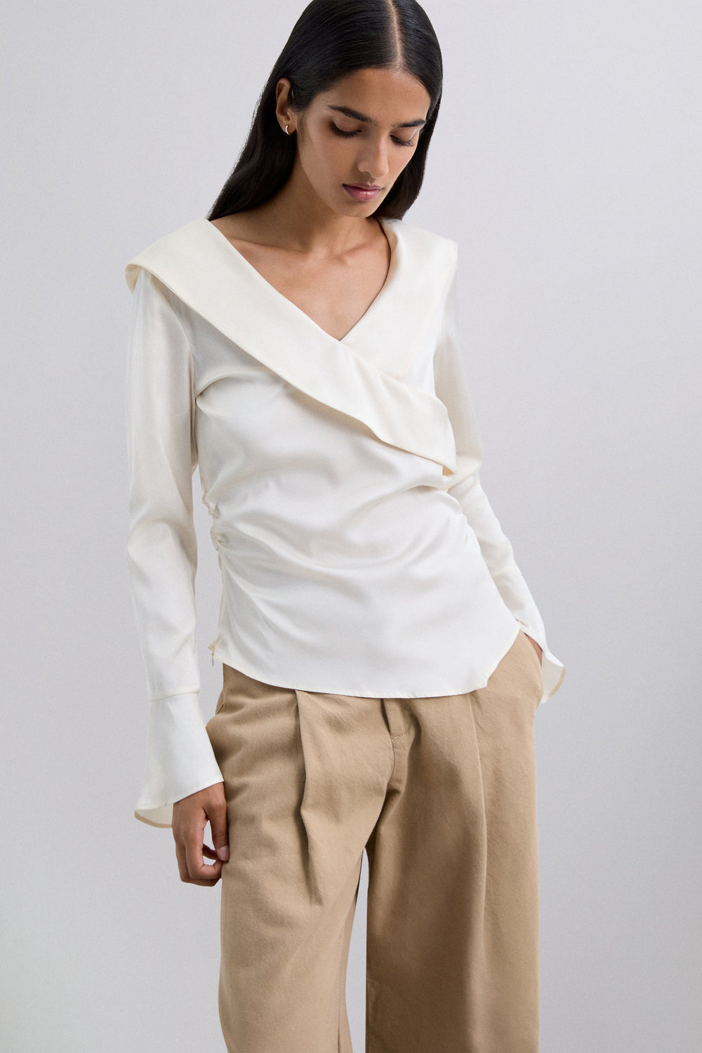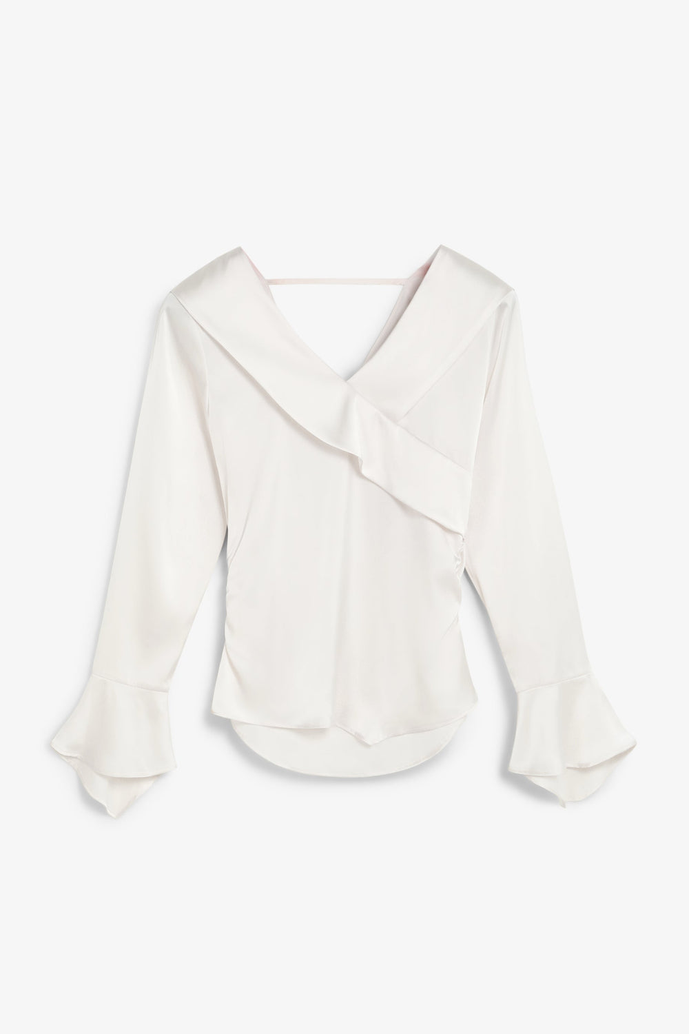 Asymmetric blouse with long sleeves and ruffle trim. Gathered waist and V-neck with ruffle detail.