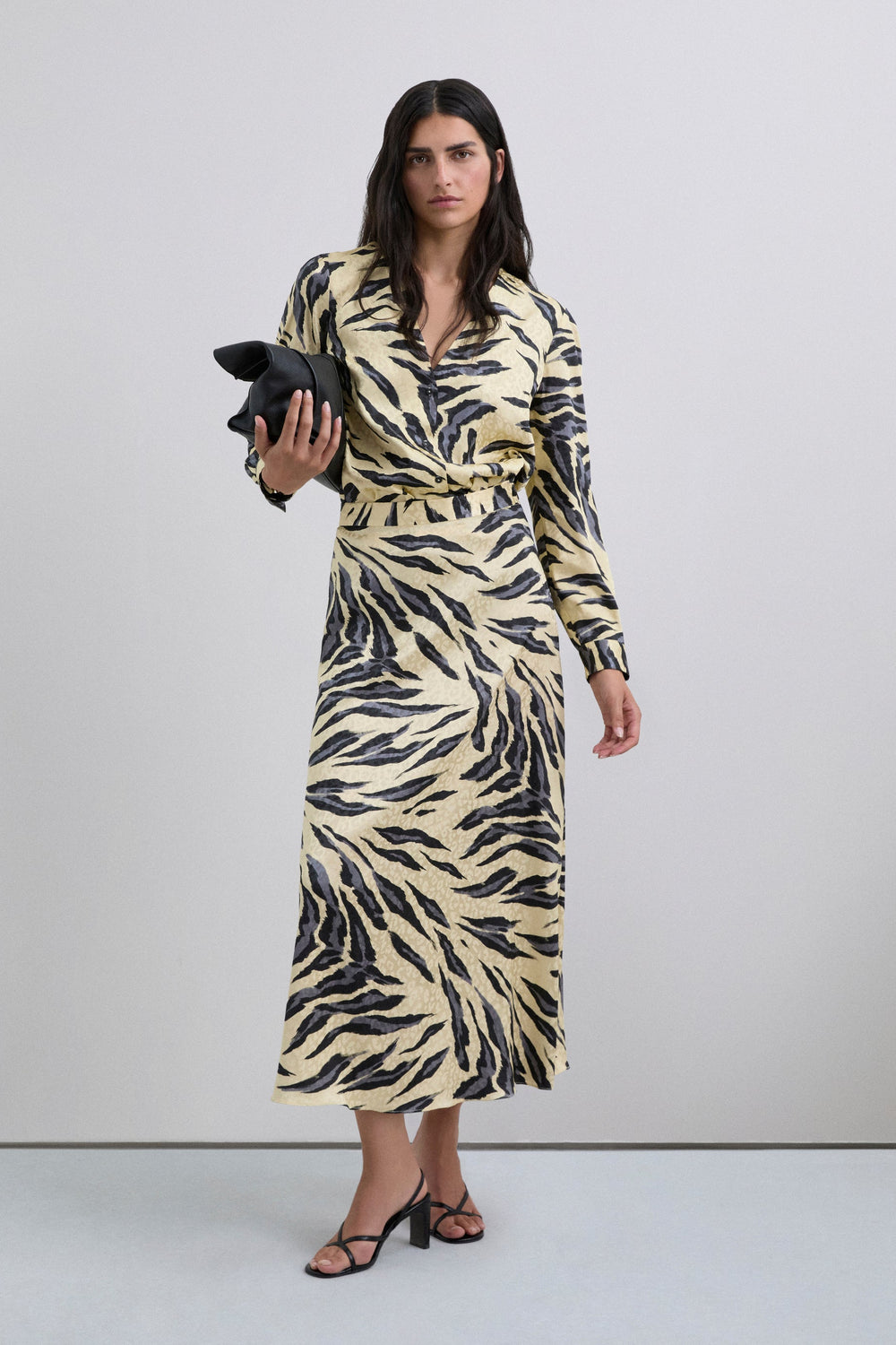 Blouse made from flowing satin fabric with animal print. Regular fit, V-neckline and button fastening. Long lightly puffed sleeves with cuffs.