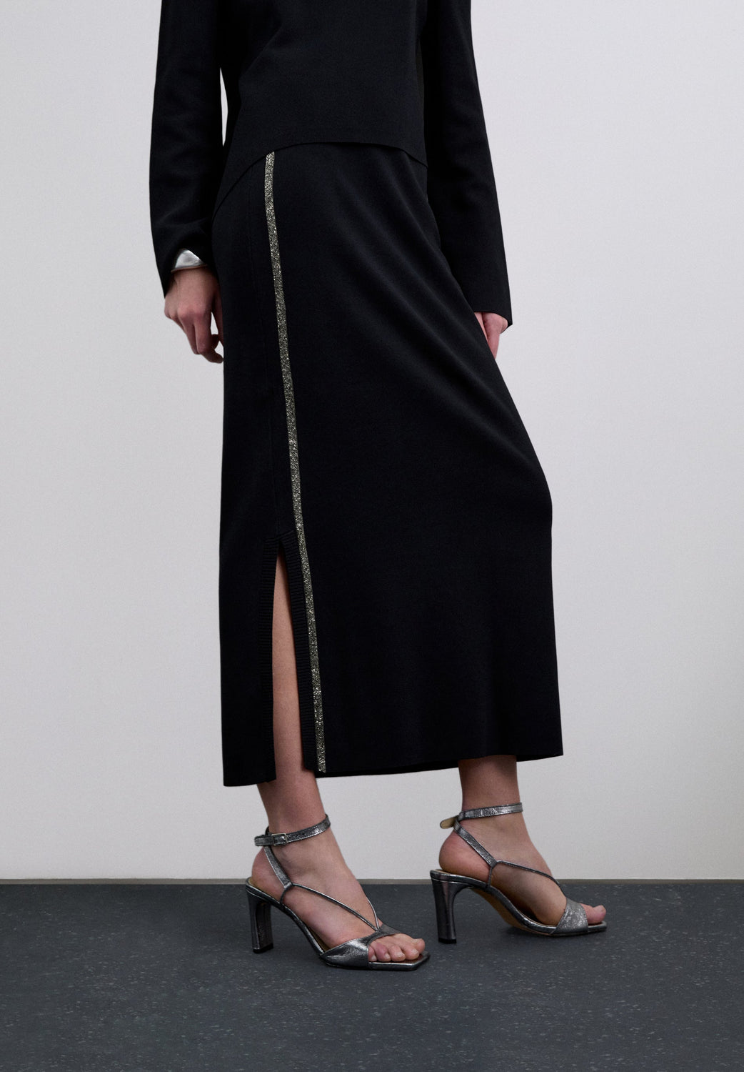 Skirt made of a slightly stretchy knit with studs detailing on the side and slit. Midi length.