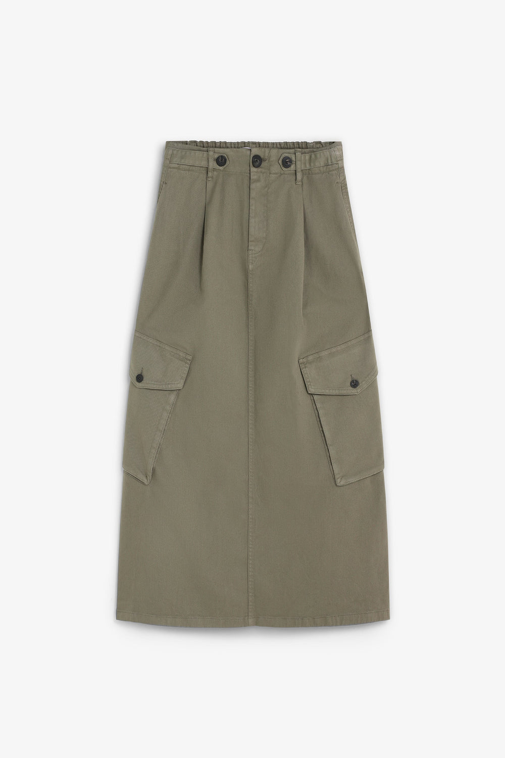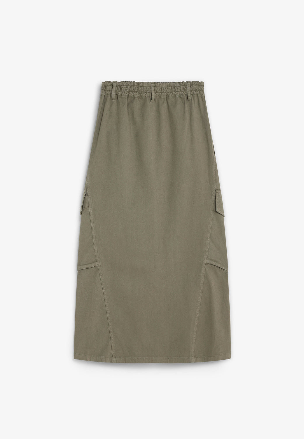 Cargo skirt made of slightly stretch cotton. Regular fit. Midi cut. Zip and button fastening. Elasticated waistband with belt loops. Front darts. Side slant patch pockets with flap and button fastening.