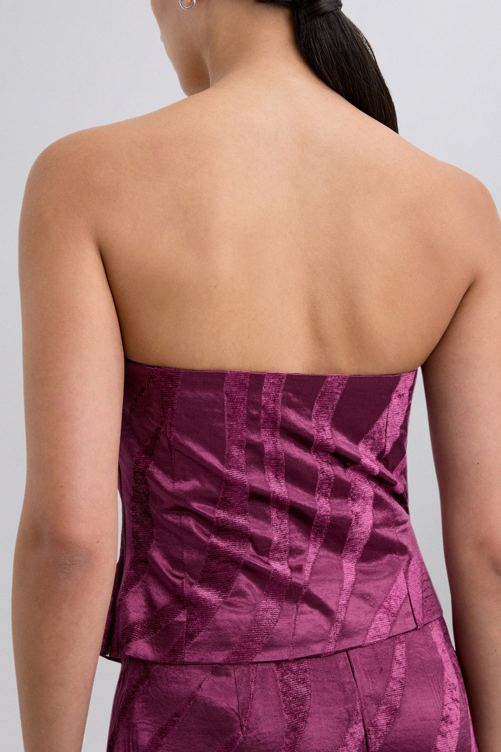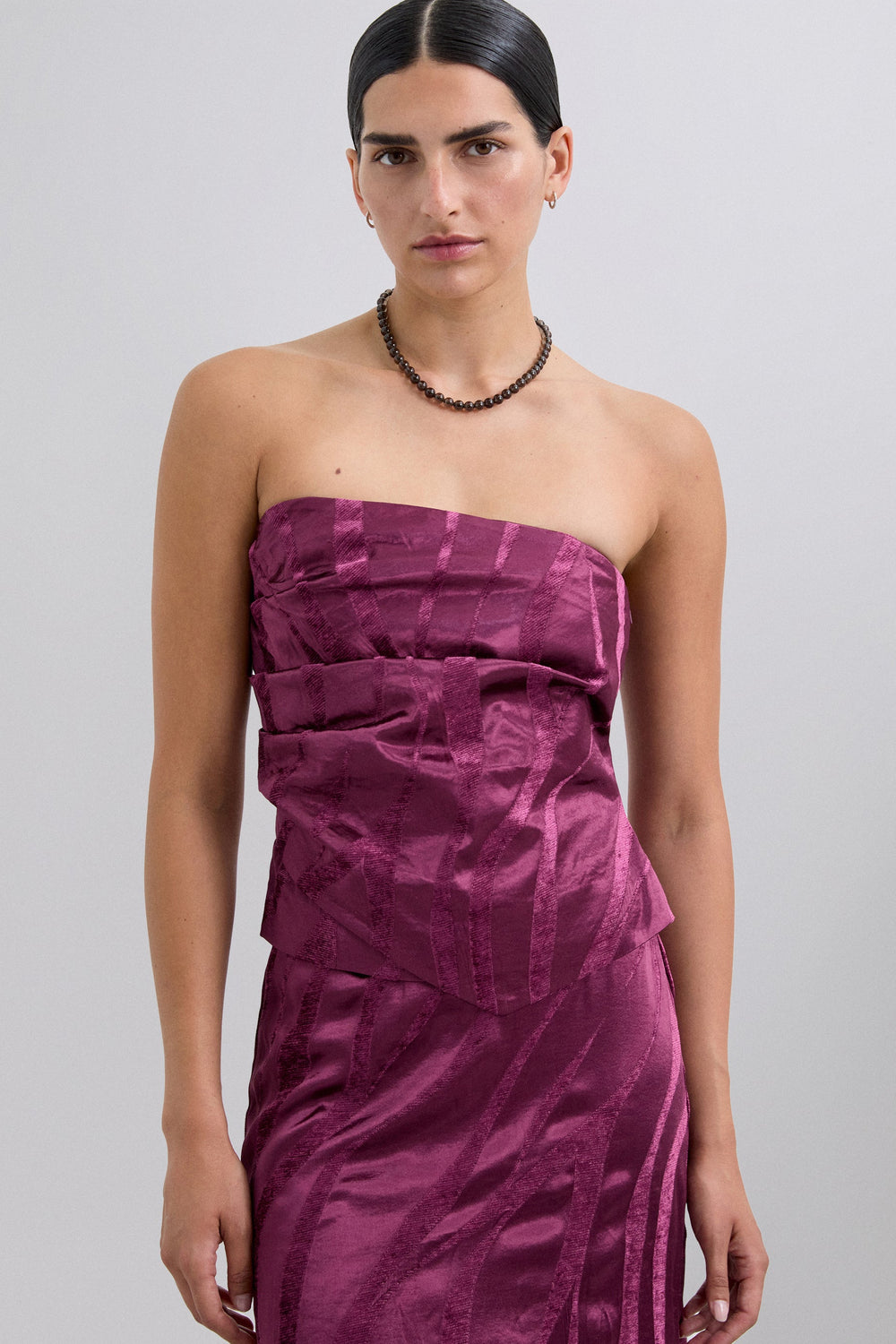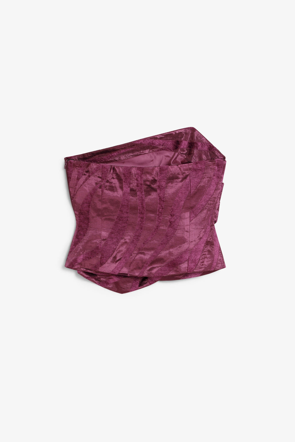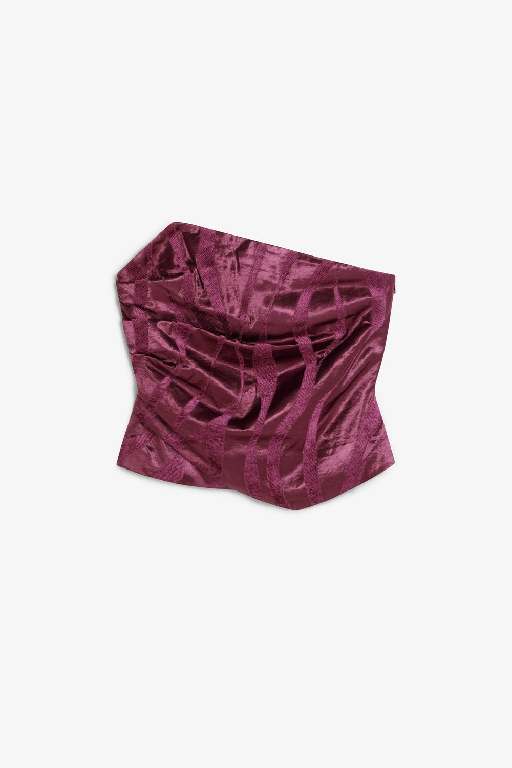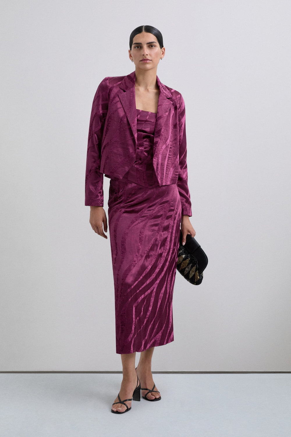 Top made of satin fabric with velvet interlaced print. Gathers on the side and asymmetric hem. Concealed side zip fastening.
